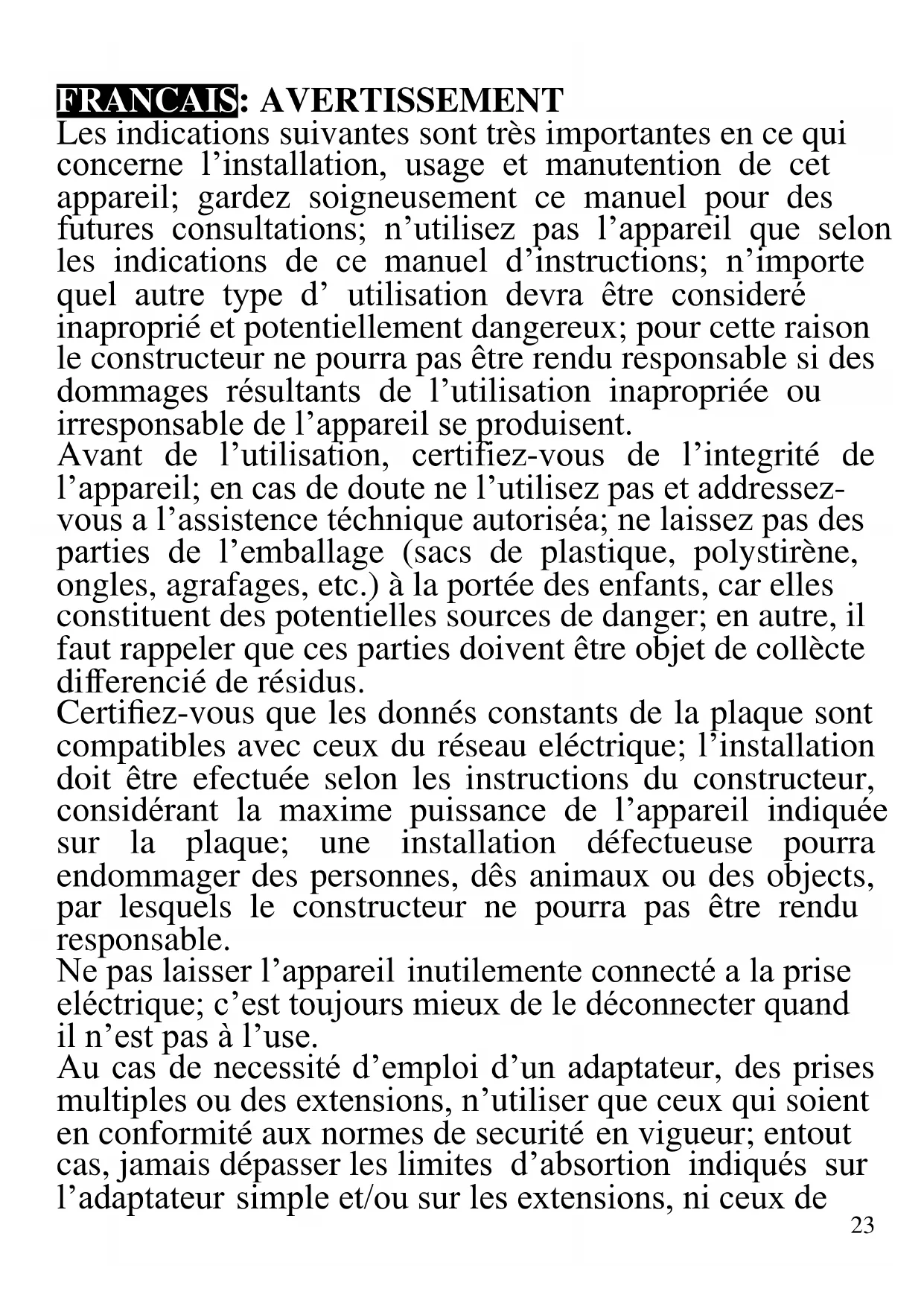 - Fuente de alimentación: AC 230V~50/60Hz. Potencia 1650W - Dimensiones de la parrilla para cocinar: 35.5 x 25.5cm - Regulación de temperatura de cocción - Tapa de vidro, Contenedor de goteo de aceite - Con dispositivo de seguridad - Base termo-resistente de plástico.23 FRANCAIS: AVERTISSEMENT Les indications suivantes sont très importantes en ce qui concerne l’installation, usage et manutention de cet appareil; gardez soigneusement ce manuel pour des futures consultations; n’utilisez pas l’appareil que selon les indications de ce manuel d’instructions; n’importe quel autre type d’ utilisation devra être consideré inaproprié et potentiellement dangereux; pour cette raison le constructeur ne pourra pas être rendu responsable si des dommages résultants de l’utilisation inapropriée ou irresponsable de l’appareil se produisent. Avant de l’utilisation, certifiez-vous de l’integrité de l’appareil; en cas de doute ne l’utilisez pas et addressez- vous a l’assistence téchnique autoriséa; ne laissez pas des parties de l’emballage (sacs de plastique, polystirène, ongles, agrafages, etc.) à la portée des enfants, car elles constituent des potentielles sources de danger; en autre, il faut rappeler que ces parties doivent être objet de collècte differencié de résidus. Certifiez-vous que les donnés constants de la plaque sont compatibles avec ceux du réseau eléctrique; l’installation doit être efectuée selon les instructions du constructeur, considérant la maxime puissance de l’appareil indiquée sur la plaque; une installation défectueuse pourra endommager des personnes, dês animaux ou des objects, par lesquels le constructeur ne pourra pas être rendu responsable. Ne pas laisser l’appareil inutilemente connecté a la prise eléctrique; c’est toujours mieux de le déconnecter quand il n’est pas à l’use. Au cas de necessité d’emploi d’un adaptateur, des prises multiples ou des extensions, n’utiliser que ceux qui soient en conformité aux normes de securité en vigueur; entout cas, jamais dépasser les limites d’absortion indiqués sur l’adaptateur simple et/ou sur les extensions, ni ceux de24 maxime puissance indiqués sur les adaptateurs multiples. Débranchez toujours l'appareil de l'alimentation électrique s'il est laissé sans surveillance. Pour le nettoyage déconnectez la fiche du secteur électrique. Quand l’appareil soit hors usage et ait été décidé qu’il ne sera pas reparé, on reccomande son inutilisation, en coupant son câble d’alimentation. - Ne pas approcher le câble d’alimentation d’objects coupants ou de surfaces chaudes, et ne pas tirer sur le cordon d’alimentation pour le débrancher de la prise. Ne le laissez pas pendre du plan de travail où un enfant pourrait le tenir. - Ne pas utiliser l’appareil si le câble d’alimentation ou la fiche de connéction eléctrique sont endommagés, ou encore en cas de court-circuits; dans ce cas là, apporter l’appareil a un centre d’assistence autorisé. - L’appareil n’est pas indiqué pour être exposé à des conditions météorologiques défavorables (pluie, vent, humidité, la glace, etc.); Gardez-le dans un endroit sec. Jamais opérer ou même toucher l’appareil avec les mains mouillées ou les pieds nus. - Ce produit ne doit pas être utilisé par les enfants, même s'ils ont plus de 8 ans. - Les enfants ne doivent pas jouer avec cet appareil. - Cet appareil peut être utilisé par des personnes ayant des capacités physiques, sensorielles ou mentales réduites, ou qui manquent d'expérience ou de connaissances, si elles ont été correctement supervisées ou ont reçu des instructions pour utiliser cet appareil en toute sécurité. - Gardez l’appareil et le câble d’alimentation hors la portée des enfants agés de moins de 8 ans. - N’utiliser que des accéssoires e pièces d’origine. Si le câble d'alimentation est endommagé ou en cas de panne et / ou de dysfonctionnement, ne modifiez pas25 l'appareil. Toute réparation doit être effectuée par le fabricant ou par son service d'assistance technique ou, en tout cas, par une personne possédant une qualification similaire, afin d'éviter tout risque. Le non-respect de ce qui précède peut compromettre la sécurité de l'appareil et invalider les conditions de la garantie. ATTENTION: Cet appareil comporte une fonction de chauffage. Quelques surfaces, même si non la plaque elle même, pourront atteindre des températures élevées. Étant donné que la sensibilité à la température diffère de personne à personne, cet appareil devrà être usé avec PRUDENCE. Placez l’appareil sur des surfaces adéhrentes et préparées pour cet effet, et utilisez les mésures de protection contre la chaleur conseillées. - Cet appareil est destiné à être utilisé dans les ménages et des applications similaires: les cuisines du personnel dans les magasins, bureaux et autres environnements de travail, pour les clients dans les hôtels, motels et autres environnements de type résidentiel, de type lit et petit- déjeuner, hébergement. - L’appareil n’est pas conçu pour être utilisé avec une minuterie extérieure ou une commande à distance. - Avant chaque utilisation, effectuez le cordon d'alimentation. Ne soumettez pas le produit à des chocs susceptibles de l'endommager. - Tenir l’appareil à l’écart des environnements où il peut y avoir des gaz, vapeurs, des substances inflammables ou explosives.