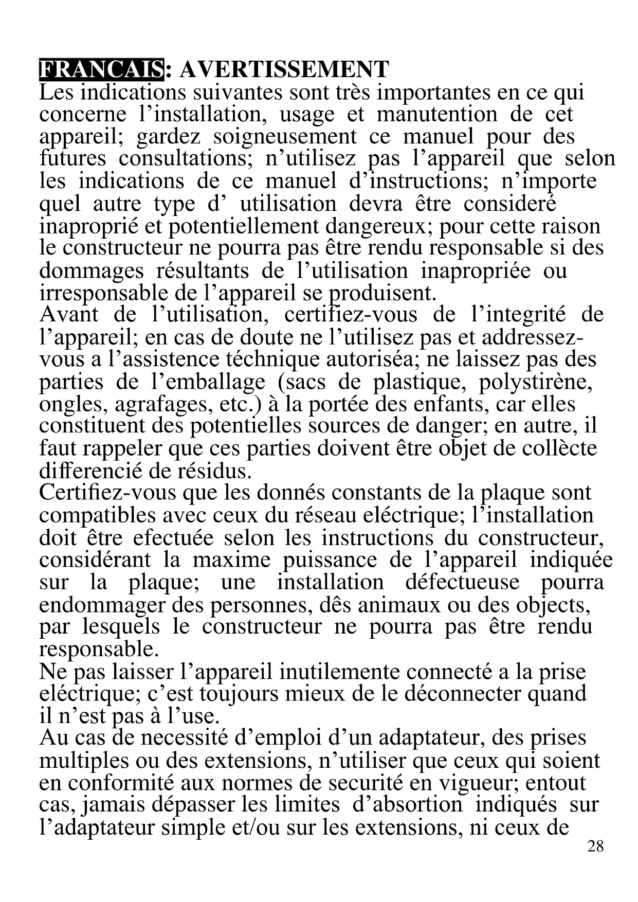 - Schutzrahmen aus hitzeresistenter Plastik28 FRANCAIS: AVERTISSEMENT Les indications suivantes sont très importantes en ce qui concerne l’installation, usage et manutention de cet appareil; gardez soigneusement ce manuel pour des futures consultations; n’utilisez pas l’appareil que selon les indications de ce manuel d’instructions; n’importe quel autre type d’ utilisation devra être consideré inaproprié et potentiellement dangereux; pour cette raison le constructeur ne pourra pas être rendu responsable si des dommages résultants de l’utilisation inapropriée ou irresponsable de l’appareil se produisent. Avant de l’utilisation, certifiez-vous de l’integrité de l’appareil; en cas de doute ne l’utilisez pas et addressez- vous a l’assistence téchnique autoriséa; ne laissez pas des parties de l’emballage (sacs de plastique, polystirène, ongles, agrafages, etc.) à la portée des enfants, car elles constituent des potentielles sources de danger; en autre, il faut rappeler que ces parties doivent être objet de collècte differencié de résidus. Certifiez-vous que les donnés constants de la plaque sont compatibles avec ceux du réseau eléctrique; l’installation doit être efectuée selon les instructions du constructeur, considérant la maxime puissance de l’appareil indiquée sur la plaque; une installation défectueuse pourra endommager des personnes, dês animaux ou des objects, par lesquels le constructeur ne pourra pas être rendu responsable. Ne pas laisser l’appareil inutilemente connecté a la prise eléctrique; c’est toujours mieux de le déconnecter quand il n’est pas à l’use. Au cas de necessité d’emploi d’un adaptateur, des prises multiples ou des extensions, n’utiliser que ceux qui soient en conformité aux normes de securité en vigueur; entout cas, jamais dépasser les limites d’absortion indiqués sur l’adaptateur simple et/ou sur les extensions, ni ceux de29 maxime puissance indiqués sur les adaptateurs multiples. Débranchez toujours l'appareil de l'alimentation électrique s'il est laissé sans surveillance. Pour le nettoyage déconnectez la fiche du secteur électrique. Quand l’appareil soit hors usage et ait été décidé qu’il ne sera pas reparé, on reccomande son inutilisation, en coupant son câble d’alimentation. - Ne pas approcher le câble d’alimentation d’objects coupants ou de surfaces chaudes, et ne pas tirer sur le cordon d’alimentation pour le débrancher de la prise. Ne le laissez pas pendre du plan de travail où un enfant pourrait le tenir. - Ne pas utiliser l’appareil si le câble d’alimentation ou la fiche de connéction eléctrique sont endommagés, ou encore en cas de court-circuits; dans ce cas là, apporter l’appareil a un centre d’assistence autorisé. - L’appareil n’est pas indiqué pour être exposé à des conditions météorologiques défavorables (pluie, vent, humidité, la glace, etc.); Gardez-le dans un endroit sec. Jamais opérer ou même toucher l’appareil avec les mains mouillées ou les pieds nus. - Ce produit ne doit pas être utilisé par les enfants, même s'ils ont plus de 8 ans. - Les enfants ne doivent pas jouer avec cet appareil. - Cet appareil peut être utilisé par des personnes ayant des capacités physiques, sensorielles ou mentales réduites, ou qui manquent d'expérience ou de connaissances, si elles ont été correctement supervisées ou ont reçu des instructions pour utiliser cet appareil en toute sécurité. - Gardez l’appareil et le câble d’alimentation hors la portée des enfants agés de moins de 8 ans. - N’utiliser que des accéssoires e pièces d’origine. Si le câble d'alimentation est endommagé ou en cas de panne et / ou de dysfonctionnement, ne modifiez pas30 l'appareil. Toute réparation doit être effectuée par le fabricant ou par son service d'assistance technique ou, en tout cas, par une personne possédant une qualification similaire, afin d'éviter tout risque. Le non-respect de ce qui précède peut compromettre la sécurité de l'appareil et invalider les conditions de la garantie. ATTENTION: Cet appareil comporte une fonction de chauffage. Quelques surfaces, même si non la plaque elle même, pourront atteindre des températures élevées. Étant donné que la sensibilité à la température diffère de personne à personne, cet appareil devrà être usé avec PRUDENCE. Placez l’appareil sur des surfaces adéhrentes et préparées pour cet effet, et utilisez les mésures de protection contre la chaleur conseillées. - Cet appareil est destiné à être utilisé dans les ménages et des applications similaires: les cuisines du personnel dans les magasins, bureaux et autres environnements de travail, pour les clients dans les hôtels, motels et autres environnements de type résidentiel, de type lit et petit- déjeuner, hébergement. - L’appareil n’est pas conçu pour être utilisé avec une minuterie extérieure ou une commande à distance. - Avant chaque utilisation, effectuez le cordon d'alimentation. Ne soumettez pas le produit à des chocs susceptibles de l'endommager. - Tenir l’appareil à l’écart des environnements où il peut y avoir des gaz, vapeurs, des substances inflammables ou explosives.