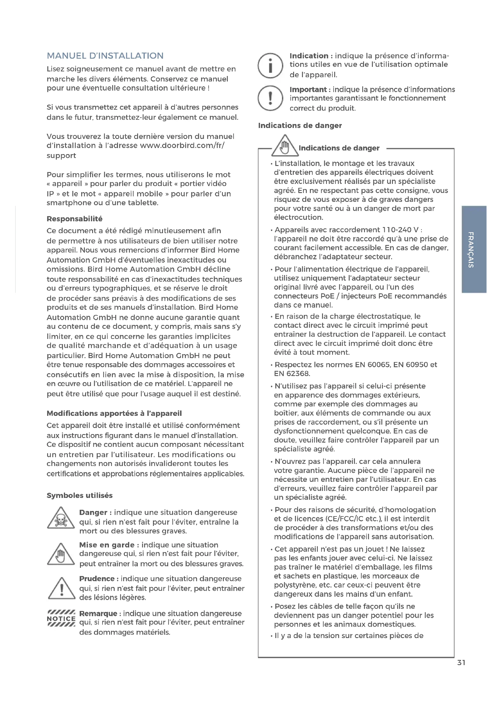 Lisez soigneusement ce manuel avant de mettre en marche les divers éléments. Conservez ce manuel pour une éventuelle consultation ultérieure ! Si vous transmettez cet appareil à d’autres personnes dans le futur, transmettez-leur également ce manuel. Vous trouverez la toute dernière version du manuel d’installation à l’adresse www.doorbird.com/fr/ support Pour simplifier les termes, nous utiliserons le mot « appareil » pour parler du produit « portier vidéo IP » et le mot « appareil mobile » pour parler d’un smartphone ou d’une tablette. Responsabilité Ce document a été rédigé minutieusement afin de permettre à nos utilisateurs de bien utiliser notre appareil. Nous vous remercions d’informer Bird Home Automation GmbH d’éventuelles inexactitudes ou omissions. Bird Home Automation GmbH décline toute responsabilité en cas d’inexactitudes techniques ou d’erreurs typographiques, et se réserve le droit de procéder sans préavis à des modifications de ses produits et de ses manuels d’installation. Bird Home Automation GmbH ne donne aucune garantie quant au contenu de ce document, y compris, mais sans s’y limiter, en ce qui concerne les garanties implicites de qualité marchande et d’adéquation à un usage particulier. Bird Home Automation GmbH ne peut être tenue responsable des dommages accessoires et consécutifs en lien avec la mise à disposition, la mise en œuvre ou l’utilisation de ce matériel. L’appareil ne peut être utilisé que pour l’usage auquel il est destiné. Modifications apportées à l’appareil Cet appareil doit être installé et utilisé conformément aux instructions figurant dans le manuel d’installation. Ce dispositif ne contient aucun composant nécessitant un entretien par l’utilisateur. Les modifications ou changements non autorisés invalideront toutes les certifications et approbations réglementaires applicables. Symboles utilisés