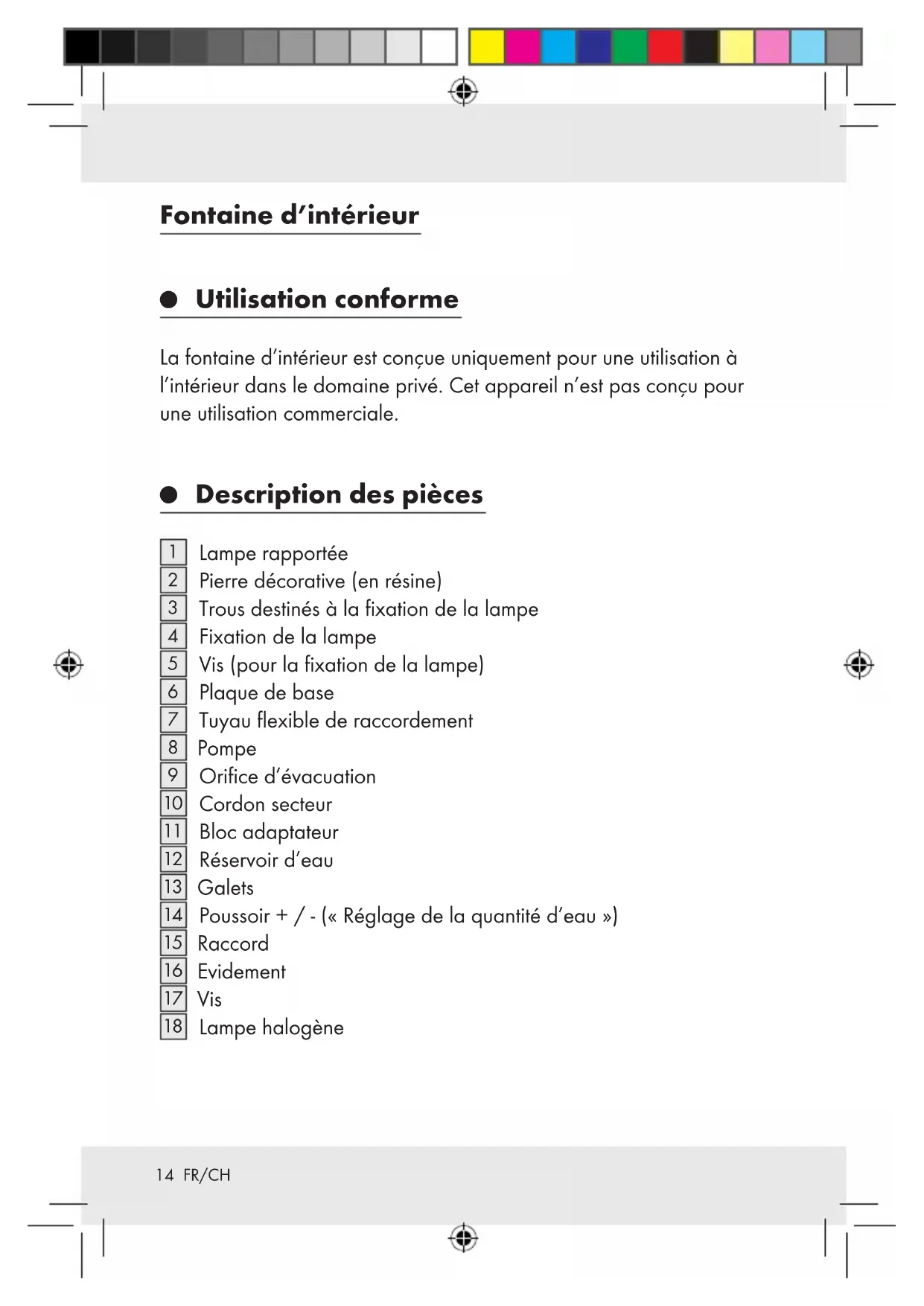Utilisation conforme La fontaine d’intérieur est conçue uniquement pour une utilisation à l’intérieur dans le domaine privé. Cet appareil n’est pas conçu pour une utilisation commerciale.