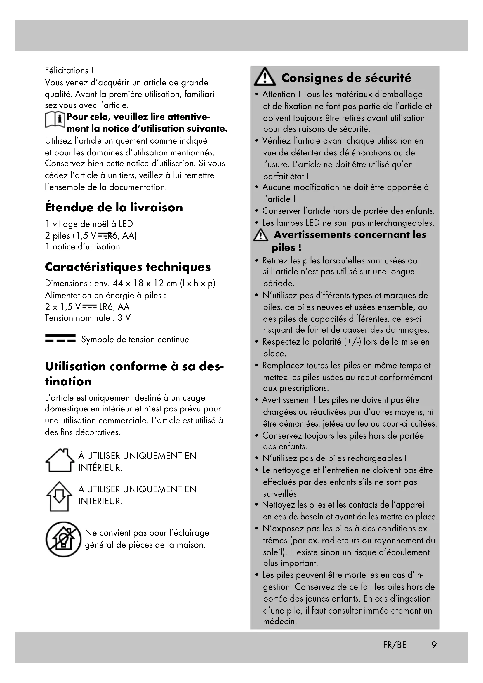 - s‘il présente les qualités qu‘un acheteur peut légitimement attendre eu égard aux décla- rations publiques faites par le vendeur, par le producteur ou par son représentant, notam- ment dans la publicité ou l‘étiquetage ; FR/BE12 FR/BE 2° Ou s‘il présente les caractéristiques définies d‘un commun accord par les parties ou être propre à tout usage spécial recherché par l‘acheteur, porté à la connaissance du vendeur et que ce dernier a accepté. Article L217-12 du Code de la consommation L‘action résultant du défaut de conformité se prescrit par deux ans à compter de la délivrance du bien. Article 1641 du Code civil Le vendeur est tenu de la garantie à raison des défauts cachés de la chose vendue qui la ren- dent impropre à l‘usage auquel on la destine, ou qui diminuent tellement cet usage que l‘acheteur ne l‘aurait pas acquise, ou n‘en aurait donné qu‘un moindre prix, s‘il les avait connus. Article 1648 1er alinéa du Code civil L‘action résultant des vices rédhibitoires doit être intentée par l‘acquéreur dans un délai de deux ans à compter de la découverte du vice. Les pièces détachées indispensables à l’utilisation du produit sont disponibles pendant la durée de la garantie du produit. IAN : 323296_1901 Service France Tel. : 0800 919270 E-Mail : deltasport@lidl.fr Service Belgique Tel. : 070 270 171 (0,15 EUR/Min.) E-Mail : deltasport@lidl.be13 Gefeliciteerd! Met uw aankoop hebt u voor een hoogwaardig artikel gekozen. Zorg ervoor dat u voor het eerste gebruik met het artikel vertrouwd raakt. Lees hiervoor de volgende geb- ruiksaanwijzing zorgvuldig door. Gebruik het artikel alleen zoals omschreven en voor het aangegeven doel. Bewaar deze geb- ruiksaanwijzing goed. Geef alle documenten mee als u het artikel aan iemand anders geeft. Leveringsomvang 1 x LED-kerstdorp 2 x batterij (1,5 V LR6, AA) 1 x gebruiksaanwijzing Technische gegevens Afmetingen: ca. 44 x 18 x 12 cm (b x h x d) Stroomvoorziening batterij: 2 x 1,5 V LR6, AA Nominale spanning: 3 V Symbool voor gelijkspanning Beoogd gebruik Dit artikel is uitsluitend bestemd voor particu- lier gebruik binnenshuis en niet voor zakelijk gebruik. Het artikel is geschikt voor decoratieve doeleinden.