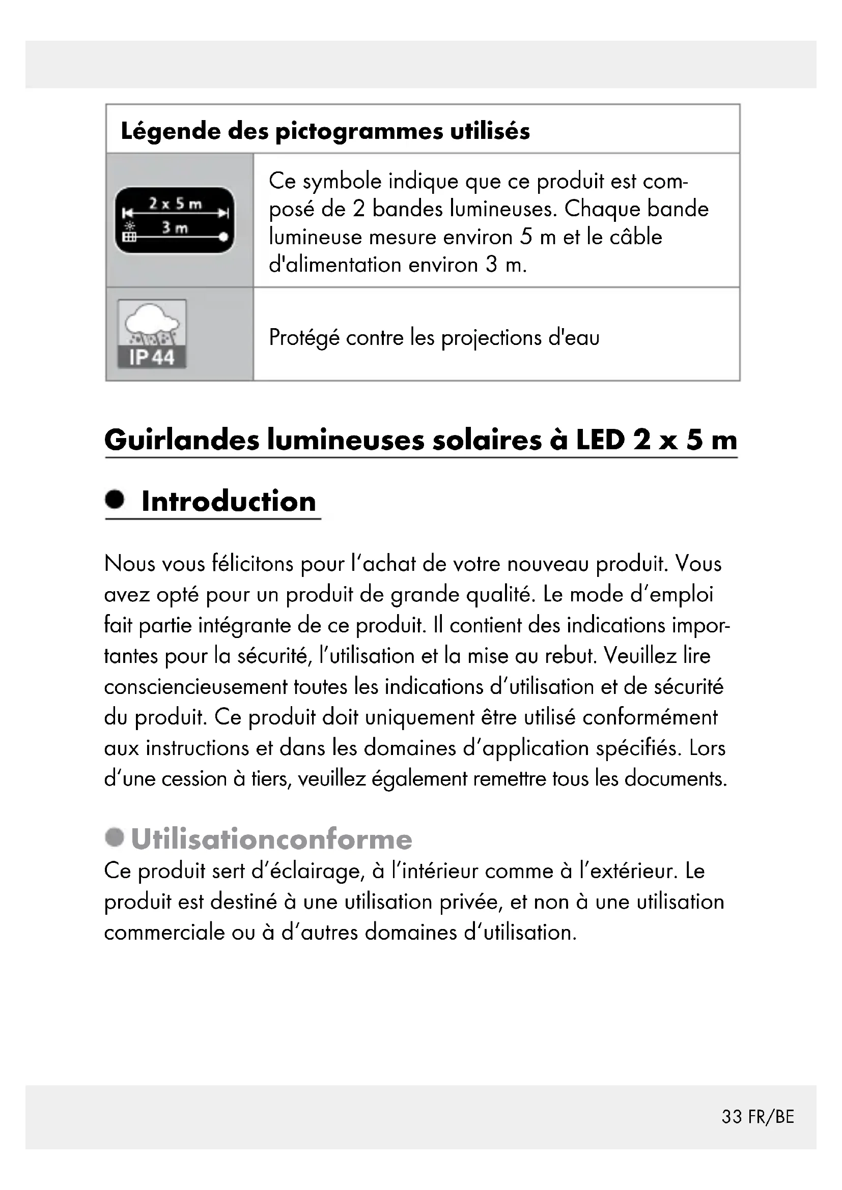 Guirlande lumineuse solaire à LED Contenu de la livraison 1 Guirlandes lumineuses solaires à LED 2 x 5 m 1 Piquet 1 Tige 1 Manuel de montage, d‘utilisation et consignes de sécurité Données techniques Tension de service : 3,7 V (courant continu) Batterie : 1 x 3,7 V (courant continu) non rem- plaçable / Batterie Li-Ion de 1300 mAh LED : HG05422A : 100 LED x 0,06 W (blanc chaud) HG05422B : 100 LED x 0,06 W (blanc froid) HG05422C : 100 LED x 0,06 W (multicolores (rouge, vert, jaune et bleu)) Indice de protection: IP44 (protégé contre les projections d‘eau) Panneau solaire : env. 11,5 x 11,5 cm35 FR/BE Durée d‘éclairage (lorsque la pile est entièrement chargée) : env. 8 heures Consignes de sécurité VEUILLEZ LIRE LE MODE D‘EMPLOI AVANT UTILISATION! LE MODE D‘EMPLOI EST À CONSERVER SOIGNEUSEMENT! LORSQUE VOUS REMETTEZ LE PRODUIT À D‘AUTRES UTILI-