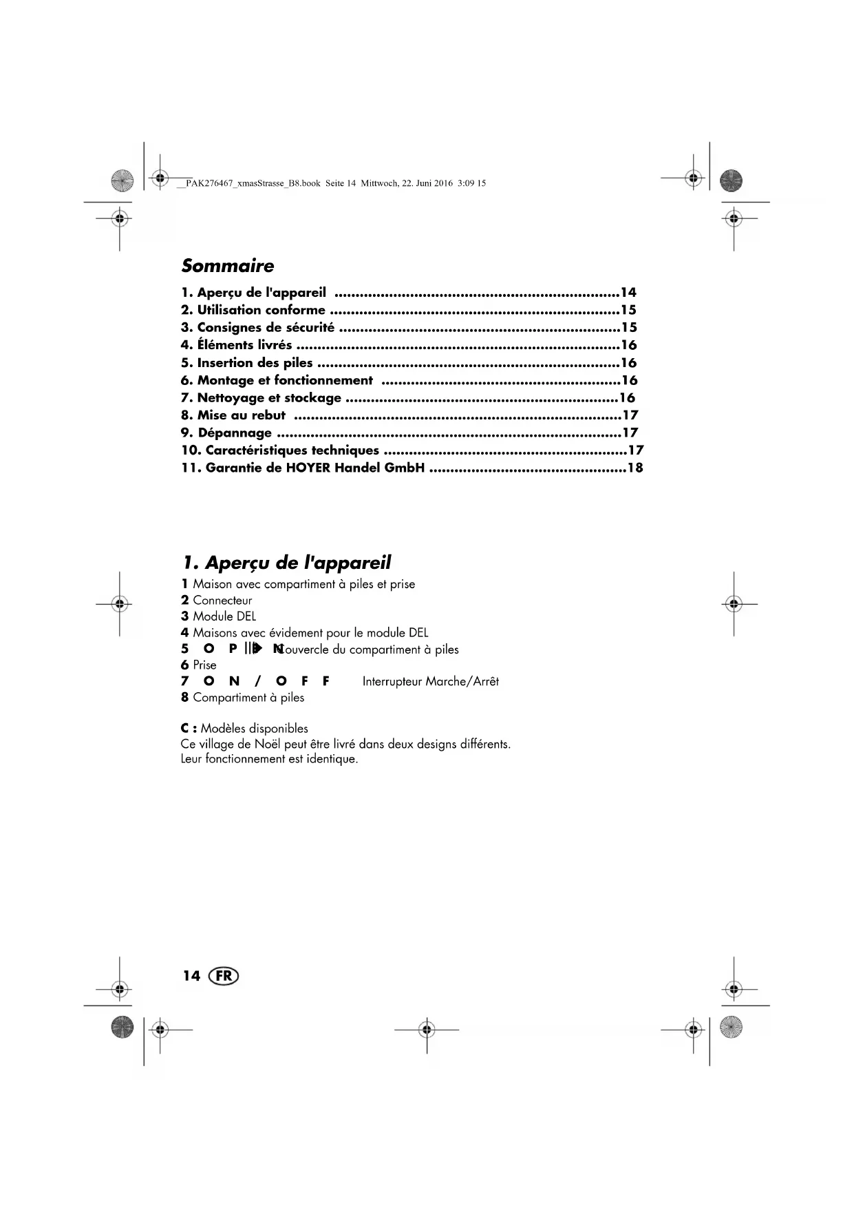 Couvercle du compartiment à piles 6 Prise 7ON/OFF Interrupteur Marche/Arrêt 8 Compartiment à piles C : Modèles disponibles Ce village de Noël peut être livré dans deux designs différents. Leur fonctionnement est identique. __PAK276467_xmasStrasse_B8.book Seite 14 Mittwoch, 22. Juni 2016 3:09 1515