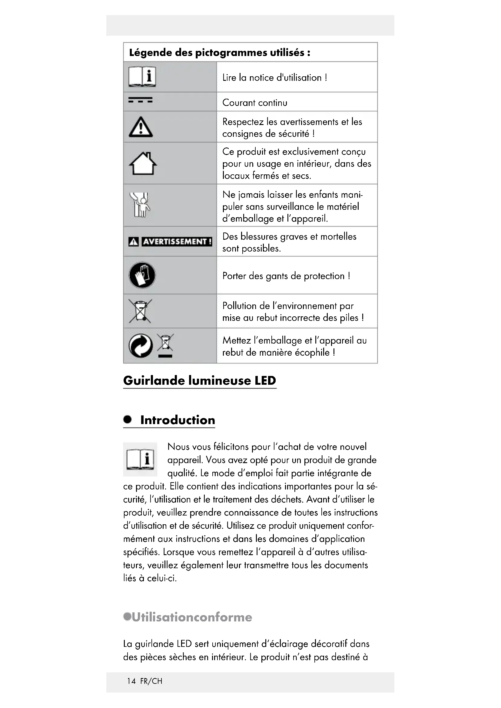 LES ENFANTS ET LES ENFANTS EN BAS ÂGE ! Ne laissez jamais les enfants sans surveillance avec16 FR/CH le matériel d‘emballage. Celui-ci représente une source de risque d‘étouffement. Tenez le produit hors de portée des enfants. DANGER DE MORT! Ne pas laisser les piles entre les mains des enfants. Ne laissez pas traîner les piles. Les enfants ou les animaux risqueraient de les avaler. En cas d’ingestion, consultez immédiatement un médecin. Cet appareil peut être utilisé par des enfants de 8 ans et plus ainsi que par des personnes à capacités physiques, sensorielles ou mentales réduites ou manquant d‘expé- rience et de connaissance que sous surveillance ou s‘ils ont été instruits de l‘utilisation sûre de cet appareil et des risques en découlant. Les enfants ne doivent pas jouer avec cet appareil. Le nettoyage et la maintenance domes- tique de l‘appareil ne doit pas être effectué par un enfant sans surveillance. N’utilisez pas le produit si vous constatez des endommagements quelconques. RISQUE D’INCENDIE! Ne pas court-circuiter les piles. Il pourrait en résulter un échauffement, un risque d’incendie ou un éclatement. RISQUE D’EXPLOSION! Ne jetez jamais les piles dans le feu ou dans l’eau. Ne rechargez en aucun cas les piles non rechargeables! Les piles peuvent exploser. Le liquide s’écoulant de piles ou les piles endommagées peuvent entraîner des brûlures graves de la peau par l’acide, portez donc obligatoirement dans ce cas des gants de protection adaptés. Retirez de l’appareil les piles usagées. Le liquide des piles très anciennes ou usagées peut s’écouler. Le liquide chimique endommage le produit. Enlever les piles de l’appareil lorsque celui-ci reste longtemps inutilisé. Utilisez toujours des piles de même type (voir le chapitre «Données techniques»). Contrôlez régulièrement les piles afin de détecter d’éventuels signes d’écoulement. N’exposez jamais le produit à des températures élevées ni à l’humidité, il pourrait être endommagé. Éviter d’exposer le produit à toute sollicitation mécanique! En cas d’endommagements, pour toutes réparations ou tous autres problèmes au niveau de la lampe, adressez-vous à un électricien. N’utilisez pas ensemble de piles neuves et usagées.17 FR/CH ATTENTION ! RISQUE D’ECHAUFFEMENT EXCESSIF ! N’utilisez pas la guirlande lumineuse dans l’emballage. Après usage, conservez la guirlande lumineuse dans son emballage pour éviter des endommagements involontaires. Cet article ne comporte pas de pièces pouvant être soumises à une maintenance par le consommateur. Les ampoules ne peuvent être remplacées. Ne pas brancher la guirlande lumineuse à une autre guirlande lumineuse. Ne branchez jamais la guirlande lumineuse directement à un branchement 230 V. Mise en service Mise en place / remplacement des piles voir ill. A. Mise en marche et coupure voir ill. B–E. Nettoyage et entretien Utilisez un plumeau pour nettoyer le produit. Ne nettoyez pas la lampe à l’eau ni avec d’autres liquides. Traitement des déchets L‘emballage et son matériel sont exclusivement composés de matières écologiques. Les matériaux peuvent être recyclés dans les points de collecte locaux. Les possibilités de recyclage des produits usés sont à demander auprès de votre municipalité.18 FR/CH Pour le respect de l‘environnement, lorsque vous n‘utilisez plus votre produit, ne le jetez pas avec les ordures ménagères, mais entreprenez un recyclage adapté. Pour obtenir des renseignements et des horaires d‘ouverture concernant les points de collecte, vous pouvez contacter votre administration locale. Les piles défectueuses ou usées doivent être recyclées