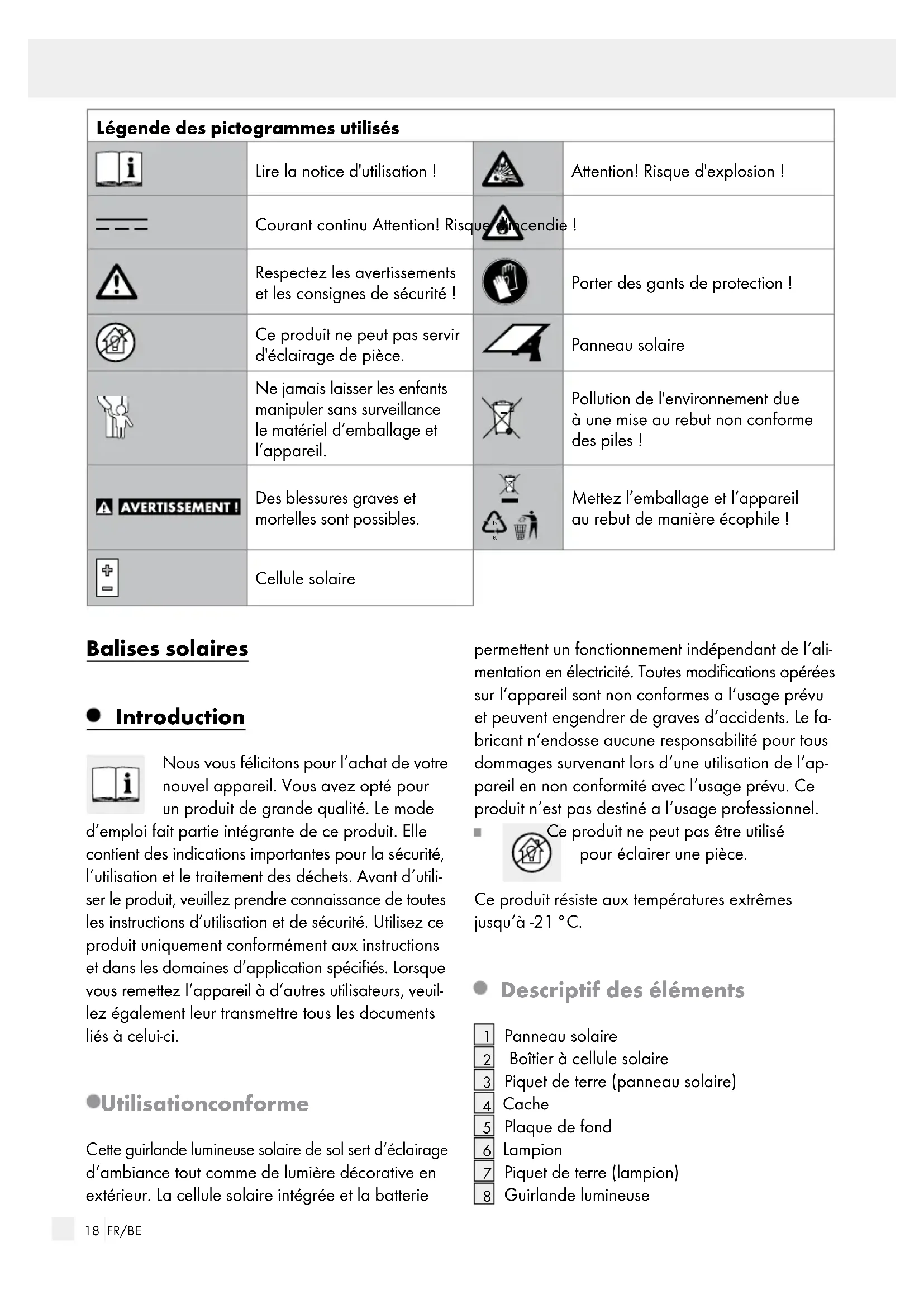 ette guirlande lumineuse solaire de sol sert d‘éclairage d‘ambiance tout comme de lumière décorative en extérieur. La cellule solaire intégrée et la batterie permettent un fonctionnement indépendant de l‘ali- mentation en électricité. Toutes modifications opérées sur l‘appareil sont non conformes a l‘usage prévu et peuvent engendrer de graves d‘accidents. Le fa- bricant n‘endosse aucune responsabilité pour tous dommages survenant lors d‘une utilisation de l‘ap- pareil en non conformité avec l‘usage prévu. Ce produit n‘est pas destiné a l‘usage professionnel. Ce produit ne peut pas être utilisé pour éclairer une pièce. Ce produit résiste aux températures extrêmes jusqu‘à -21 °C. Descriptif des éléments