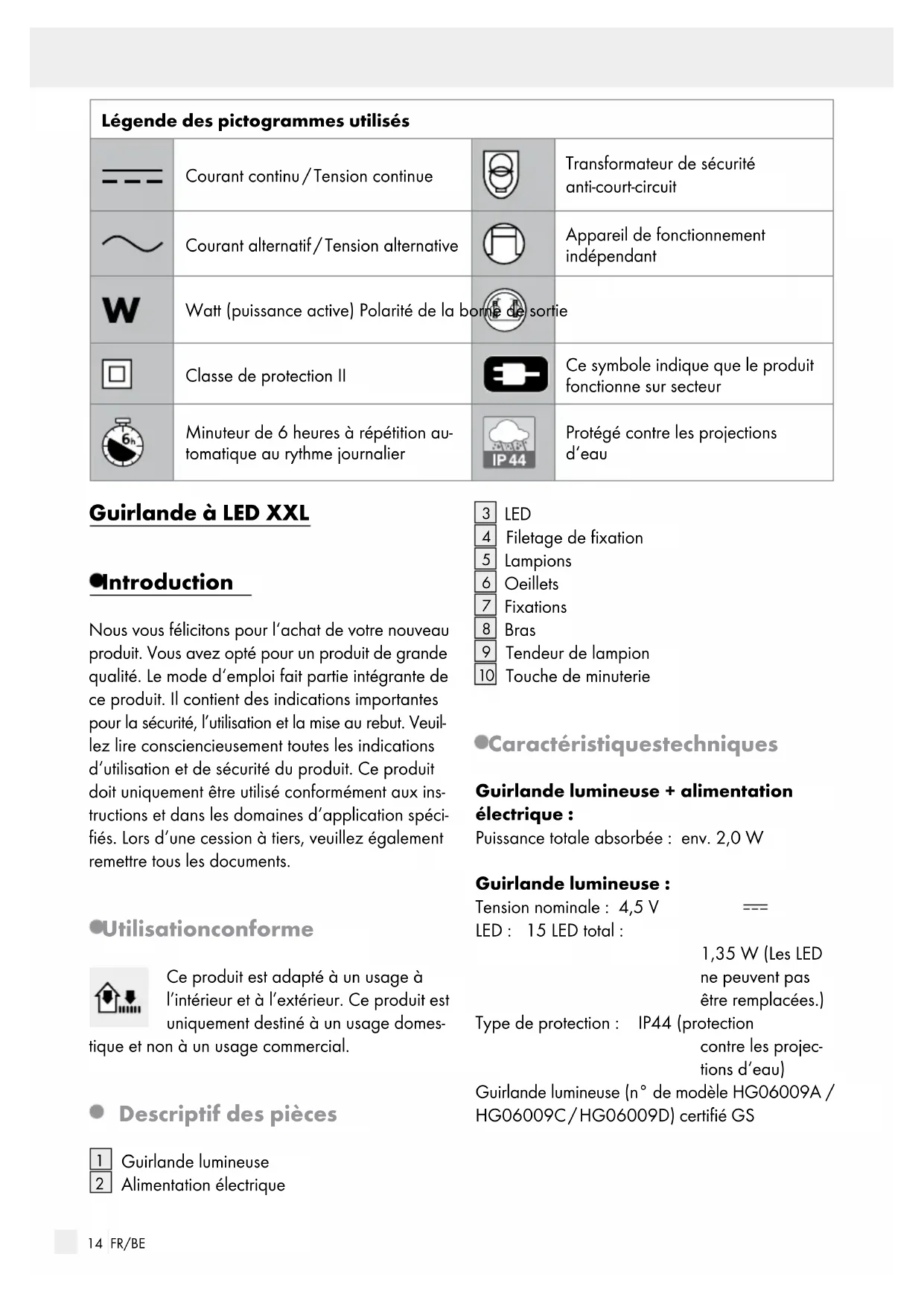 Touche de minuterie Caractéristiques techniques Guirlande lumineuse + alimentation électrique : Puissance totale absorbée : env. 2,0 W Guirlande lumineuse : Tension nominale : 4,5 V LED : 15 LED total : 1,35 W (Les LED ne peuvent pas être remplacées.) Type de protection : IP44 (protection contre les projec- tions d‘eau) Guirlande lumineuse (n° de modèle HG06009A / HG06009C / HG06009D) certifié GS15 FR/BE Alimentation électrique : Tension nominale primaire : 220‒240 V∼, 50‒60 Hz Tension nominale secondaire: 4,5 V , 1,35 W Classe de protection : II / Type de protection : IP44 (protection contre les projections d‘eau) Alimentation électrique (modèle n° JT-DC4.5V1.35W-H4-IP44) certifiée GS SELV : Très basse tension de protection (Safety extra low voltage) Ta : Température ambiante maximale Tc: Température de boîtier maximale de l‘installation montée en série Contenu de la livraison 1 Guirlande à LED XXL 15 Lampions 1 Alimentation électrique 1 Mode d‘emploi Indications de sécurité