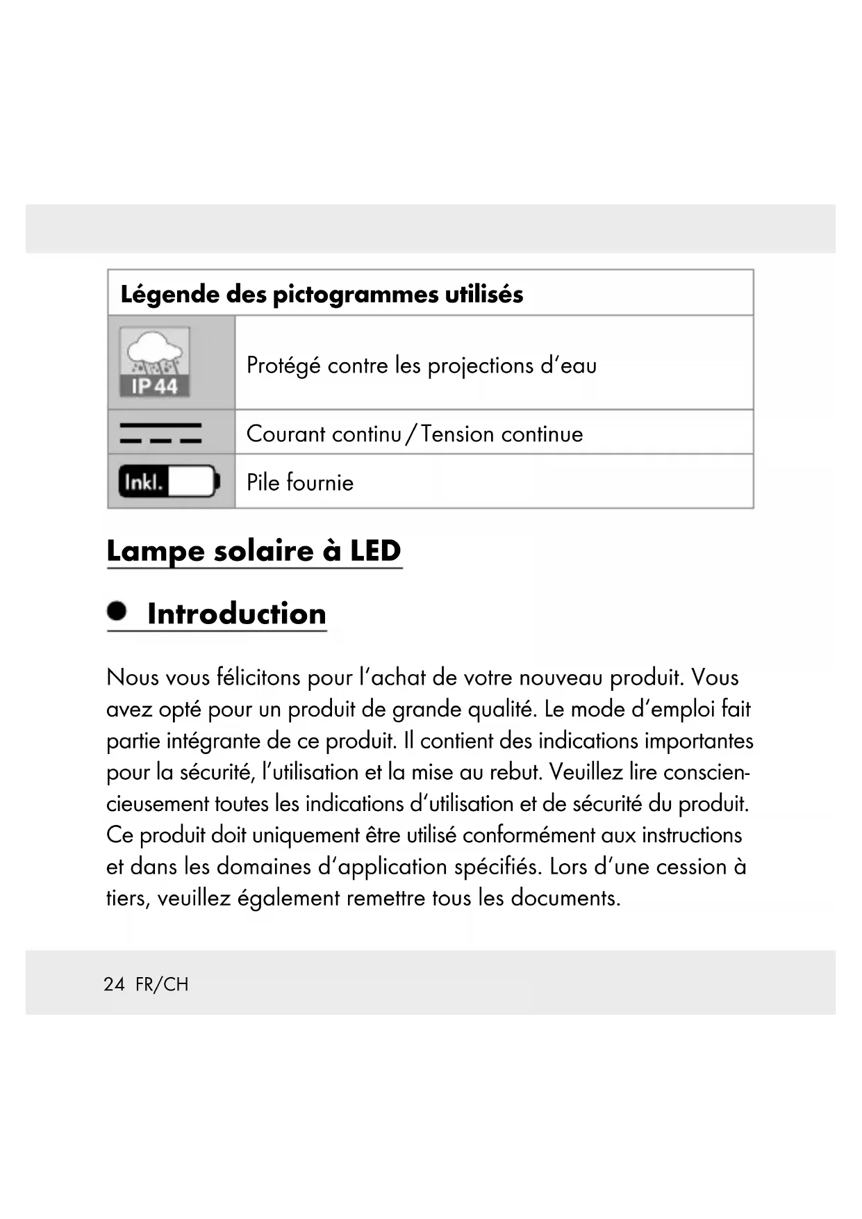 LES DOCUMENTS LIÉS À CELUI-CI.27 FR/CH Le produit ne convient pas aux enfants de moins de 14 ans. À conserver hors de portée des enfants. Ne pas utiliser ce produit si vous constatez le moindre endom- magement. Éteignez le produit si vous l‘entreposez dans un endroit sombre afin d‘éviter que la pile ne se décharge. L‘ampoule ne peut pas être remplacée. Si l‘ampoule arrive en fin de vie, l‘ensemble du produit doit alors être remplacé. Le produit n‘est pas un jouet. Instructions de sécurité spécifiques au produit Veillez à ce que la cellule solaire soit propre ou qu‘elle ne soit pas recouverte de neige ou de glace en hiver. Ceci diminue sa performance. Le froid a une incidence négative sur la durée de fonctionne- ment de la pile. Si vous n‘utilisez pas ce produit pendant une28 FR/CH période plus longue, par exemple en hiver, vous devez le conserver propre dans un lieu sec et chaud. Consignes de sécurité relatives aux piles / aux piles rechargeables DANGER DE MORT! Rangez les piles / piles rechar- geables hors de la portée des enfants. En cas d’ingestion, consultez immédiatement un médecin ! Une ingestion peut entraîner des brûlures, une perforation des tissus mous et la mort. Des brûlures graves peuvent apparaitre dans les 2 heures suivant l‘ingestion. RISQUE D‘EXPLOSION ! Ne rechargez jamais des piles non rechargeables. Ne court-circuitez pas les piles / piles rechargeables et / ou ne les ouvrez pas ! Autrement, vous risquez de provoquer une surchauffe, un incendie ou une explosion. Ne jetez jamais des piles / piles rechargeables au feu ou dans l’eau.29 FR/CH Ne pas soumettre les piles / piles rechargeables à une charge mécanique. Risque de fuite des piles / piles rechargeables Évitez d’exposer les piles / piles rechargeables à des conditions et températures extrêmes susceptibles de les endommager, par ex. sur des radiateurs / exposition directe aux rayons du soleil. Lorsque les piles / piles rechargeables fuient, évitez tout contact du produit chimique avec la peau, les yeux ou les muqueuses! Rincez les zones touchées à l‘eau claire et consultez immédia- tement un médecin ! PORTER DES GANTS DE PROTECTION! Les piles / piles rechargeables endommagées ou su- jettes à des fuites peuvent provoquer des brûlures au contact de la peau. Vous devez donc porter des gants adéquats pour les manipuler. En cas de fuite des piles / piles rechargeables, retirez-les aussitôt du produit pour éviter tout endommagement.30 FR/CH Utilisez uniquement des piles / piles rechargeables du même type. Ne mélangez pas des piles / piles rechargeables usées et neuves ! Retirez les piles / piles rechargeables, si vous ne comptez pas utiliser le produit pendant une période prolongée. Risque d‘endommagement du produit Exclusivement utiliser le type de pile / pile rechargeable spécifié. Insérez les piles / piles rechargeables conformément à l‘indi- cation de polarité (+) et (-) indiquée sur la pile / pile rechargeable et sur le produit. Nettoyez les contacts de la pile / pile rechargeable et du compartiment à pile avant d‘insérer la pile ! Retirez immédiatement les piles / piles rechargeables usées du produit.31 FR/CH Fonctionnement La cellule solaire intégrée dans le produit transforme la lumière du soleil en énergie électrique et l’accumule dans une pile Ni-MH. Allumez le produit à l‘aide de l‘interrupteur MARCHE / ARRÊT