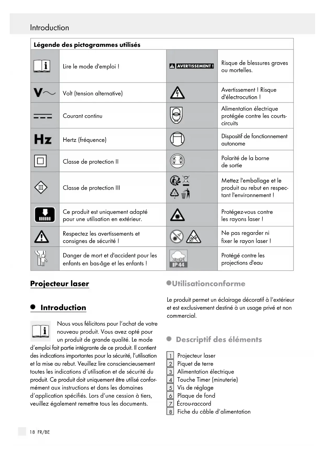 Mettez l'emballage et le produit au rebut en respec- tant l'environnement ! Ce produit est uniquement adapté pour une utilisation en extérieur. Protégez-vous contre les rayons laser! Respectez les avertissements et consignes de sécurité ! Ne pas regarder ni fixer le rayon laser ! Danger de mort et d'accident pour les enfants en bas-âge et les enfants ! Protégé contre les projections d'eau Projecteur laser Introduction Nous vous félicitons pour l‘achat de votre nouveau produit. Vous avez opté pour un produit de grande qualité. Le mode d‘emploi fait partie intégrante de ce produit. Il contient des indications importantes pour la sécurité, l’utilisation et la mise au rebut. Veuillez lire consciencieusement toutes les indications d‘utilisation et de sécurité du produit. Ce produit doit uniquement être utilisé confor- mément aux instructions et dans les domaines d‘application spécifiés. Lors d‘une cession à tiers, veuillez également remettre tous les documents. Utilisation conforme Le produit permet un éclairage décoratif à l‘extérieur et est exclusivement destiné à un usage privé et non commercial. Descriptif des éléments