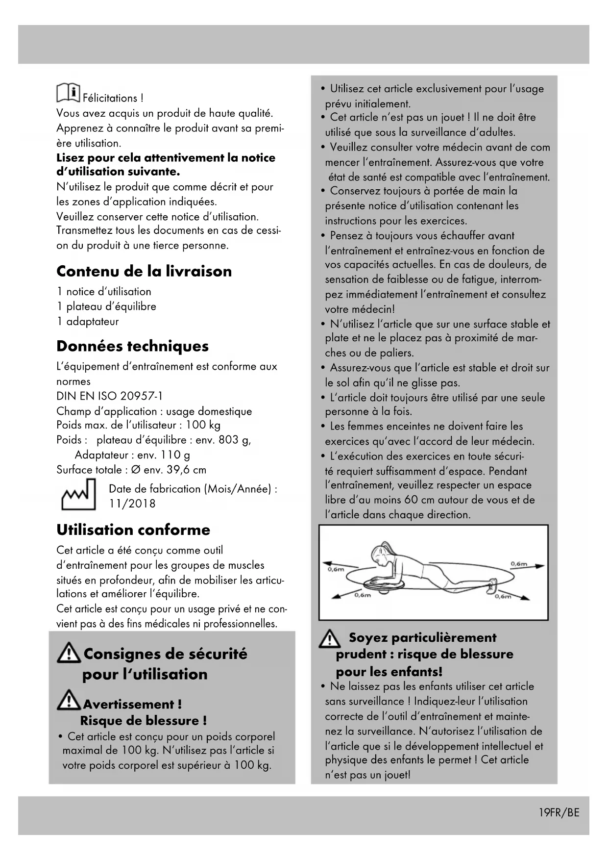 Champ d‘application : usage domestique Poids max. de l‘utilisateur : 100 kg Poids : plateau d’équilibre : env. 803 g, Adaptateur : env. 110 g Surface totale : Ø env. 39,6 cm Date de fabrication (Mois/Année) : 11/2018 Utilisation conforme Cet article a été conçu comme outil d‘entraînement pour les groupes de muscles situés en profondeur, afin de mobiliser les articu- lations et améliorer l‘équilibre. Cet article est conçu pour un usage privé et ne con- vient pas à des fins médicales ni professionnelles. Consignes de sécurité pour l‘utilisation Avertissement ! Risque de blessure !