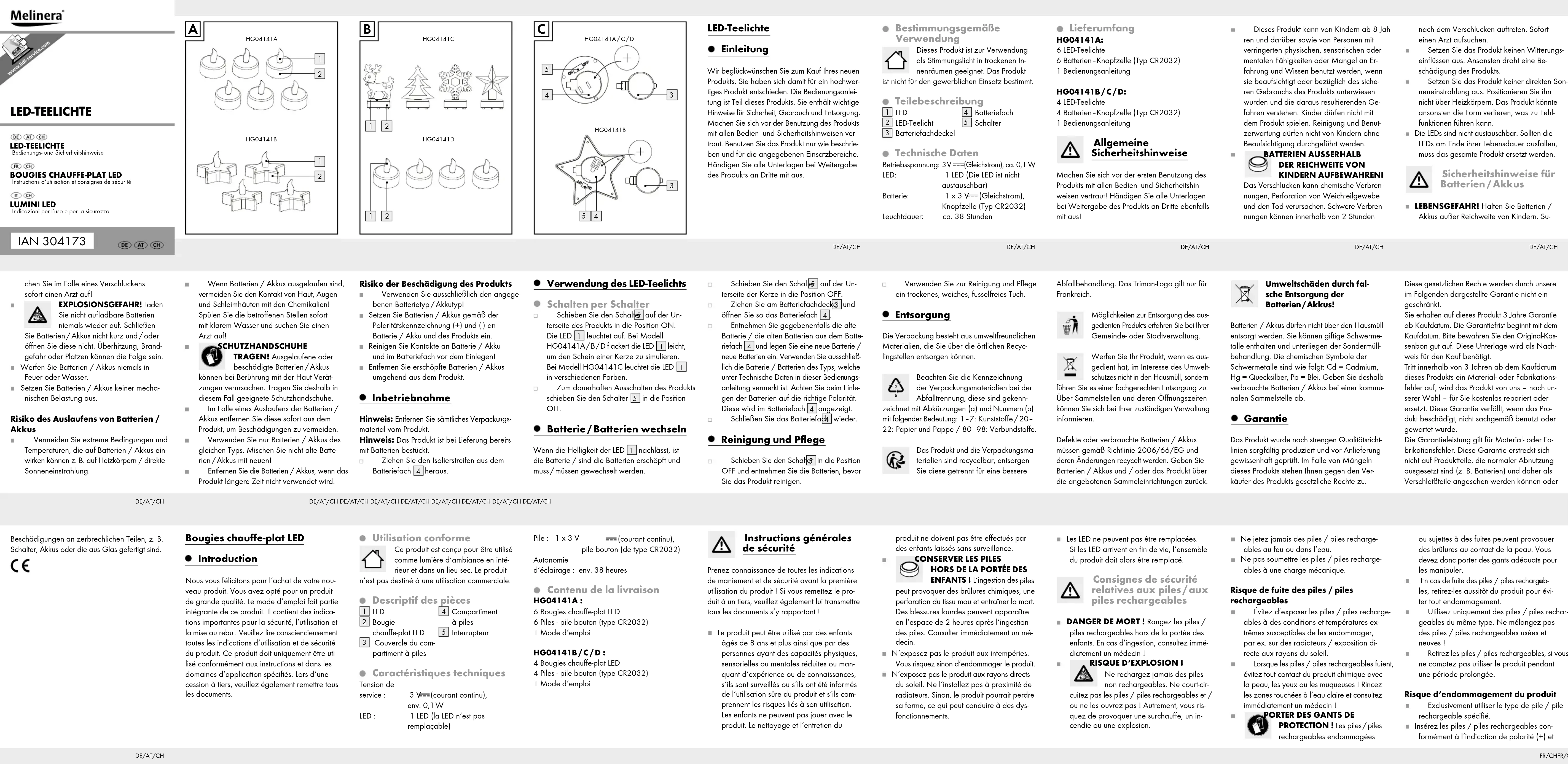 ENFANTS ! L‘ingestion des piles peut provoquer des brûlures chimiques, une perforation du tissu mou et entraîner la mort. Des blessures lourdes peuvent apparaître en l‘espace de 2 heures après l‘ingestion des piles. Consulter immédiatement un mé- decin. N‘exposez pas le produit aux intempéries. Vous risquez sinon d‘endommager le produit. N‘exposez pas le produit aux rayons directs du soleil. Ne l‘installez pas à proximité de radiateurs. Sinon, le produit pourrait perdre sa forme, ce qui peut conduire à des dys- fonctionnements. Instructions générales de sécurité Prenez connaissance de toutes les indications de maniement et de sécurité avant la première utilisation du produit ! Si vous remettez le pro- duit à un tiers, veuillez également lui transmettre tous les documents s‘y rapportant ! Le produit peut être utilisé par des enfants âgés de 8 ans et plus ainsi que par des personnes ayant des capacités physiques, sensorielles ou mentales réduites ou man- quant d‘expérience ou de connaissances, s‘ils sont surveillés ou s‘ils ont été informés de l‘utilisation sûre du produit et s‘ils com- prennent les risques liés à son utilisation. Les enfants ne peuvent pas jouer avec le produit. Le nettoyage et l‘entretien du Pile : 1 x 3 V (courant continu), pile bouton (de type CR2032) Autonomie d‘éclairage : env. 38 heures Contenu de la livraison HG04141A : 6 Bougies chauffe-plat LED 6 Piles - pile bouton (type CR2032) 1 Mode d‘emploi HG04141B / C / D : 4 Bougies chauffe-plat LED 4 Piles - pile bouton (type CR2032) 1 Mode d‘emploi Utilisation conforme Ce produit est conçu pour être utilisé comme lumière d‘ambiance en inté- rieur et dans un lieu sec. Le produit n‘est pas destiné à une utilisation commerciale. Descriptif des pièces