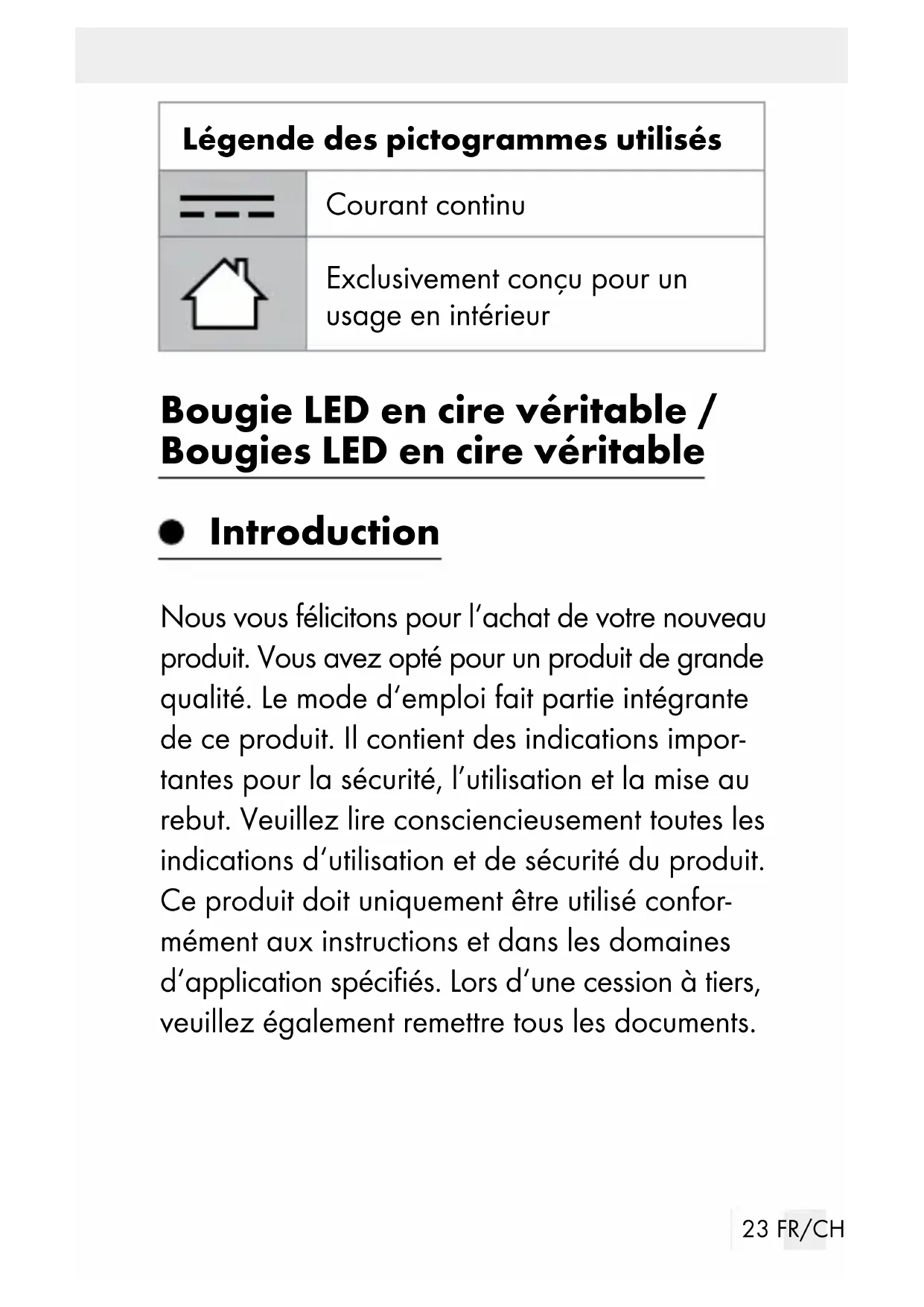 FANTS! L'ingestion des piles peut provoquer des brûlures chimiques, une perforation du tissu mou et entraîner la mort. Des blessures lourdes peuvent apparaître en l'espace de 2 heures après l'ingestion des piles. Consulter immédiatement un médecin. Le produit peut être utilisé par des enfants âgés de 14 ans et plus ainsi que par des personnes ayant des capacités physiques, sensorielles ou mentales réduites ou man- quant d'expérience ou de connaissances, s'ils sont surveillés ou s'ils ont été informés de l'utilisation sûre du produit et s'ils com- prennent les risques liés à son utilisation. Les enfants ne peuvent pas jouer avec le27 FR/CH produit. Le nettoyage et l’entretien du produit ne doivent pas être effectués par des enfants laissés sans surveillance. N'exposez pas le produit aux intempéries. Vous risquez sinon d'endommager le produit. N'exposez pas le produit aux rayons directs du soleil. Ne l'installez pas à proximité de radiateurs. Sinon, la cire du produit peut se ramollir et perdre sa forme, ce qui peut con- duire à des dysfonctionnements. Le produit ne convient pas aux enfants de moins de 14 ans. Le produit n’est pas un jouet. Con- servez le produit hors de portée des enfants. Les LED ne peuvent pas être remplacées. Si les LED arrivent en fin de vie, l’ensemble du produit doit alors être remplacé. Consignes de sécurité relatives aux piles / aux piles rechargeables DANGER DE MORT! Rangez les piles / piles rechargeables hors de la portée des enfants. En cas d’ingestion, consultez immé- diatement un médecin !28 FR/CH RISQUE D‘EXPLOSION ! Ne rechargez jamais des piles non rechargeables. Ne court-circuitez pas les piles / piles rechargeables et / ou ne les ouvrez pas ! Autrement, vous risquez de provoquer une surchauffe, un incendie ou une explosion. Ne jetez jamais des piles / piles rechargeables au feu ou dans l’eau. Ne pas soumettre les piles / piles rechar- geables à une charge mécanique. Risque de fuite des piles / piles rechargeables Évitez d’exposer les piles / piles rechargeab les à des conditions et températures extrêmes susceptibles de les endommager, par ex. sur des radiateurs / exposition directe aux rayons du soleil. Lorsque les piles / piles rechargeables fuient, évitez tout contact du produit chimique avec la peau, les yeux ou les muqueuses! Rincez les zones touchées à l‘eau claire et consultez immédiatement un médecin !29 FR/CH