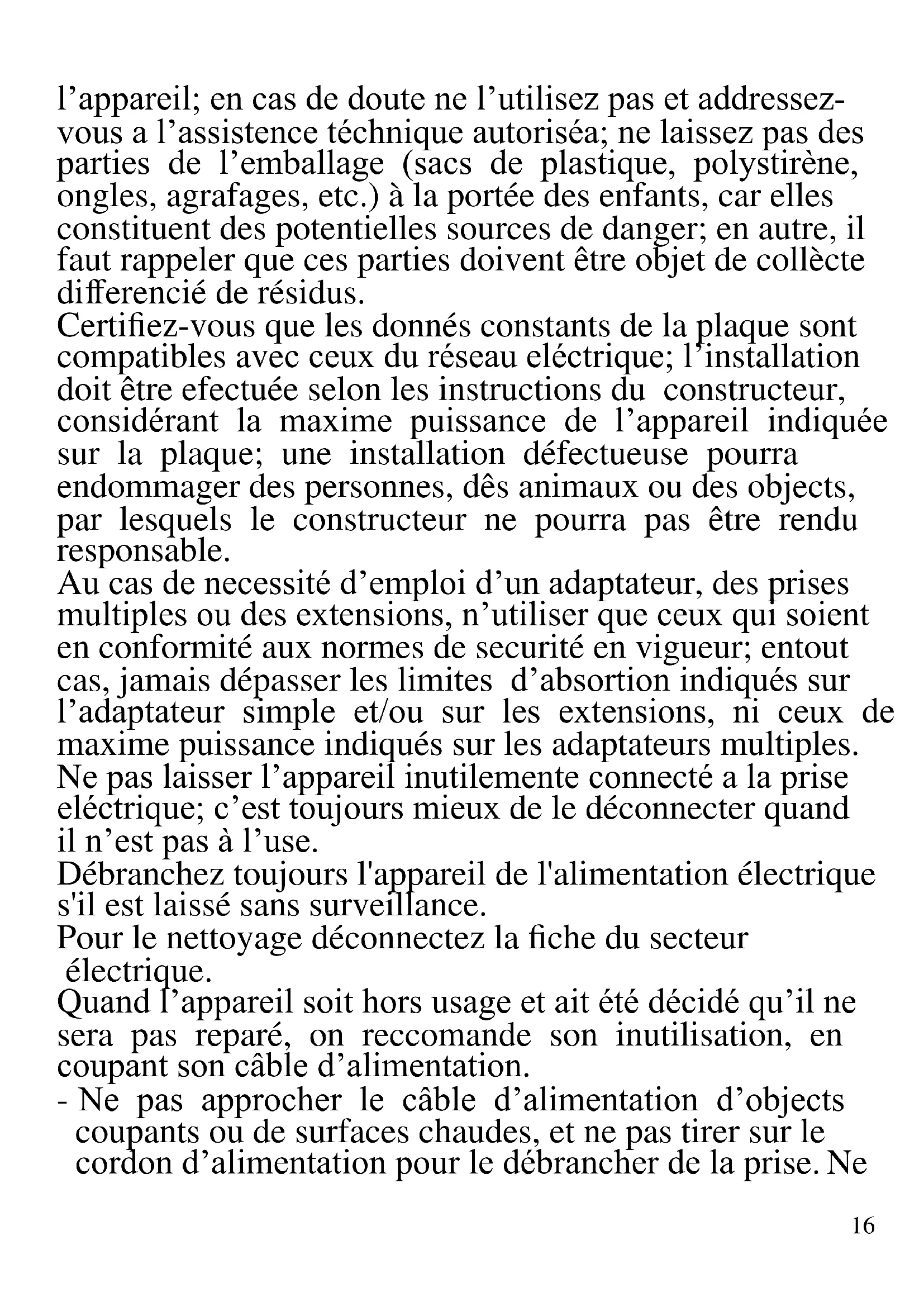 FRANCAIS: ADVERTISSEMENT Les indications suivantes sont très importantes en ce qui concerne l’installation, usage et manutention de cet appareil; gardez soigneusement ce manuel pour des futures consultations; n’utilisez pas l’appareil que selon les indications de ce manuel d’instructions; n’importe quel autre type d’ utilisation devra être consideré inaproprié et potentiellement dangereux; pour cette raison le constructeur ne pourra pas être rendu responsable si des dommages résultants de l’utilisation inapropriée ou irresponsable de l’appareil se produisent. Avant de l’utilisation, certifiez-vous de l’integrité de16 l’appareil; en cas de doute ne l’utilisez pas et addressez- vous a l’assistence téchnique autoriséa; ne laissez pas des parties de l’emballage (sacs de plastique, polystirène, ongles, agrafages, etc.) à la portée des enfants, car elles constituent des potentielles sources de danger; en autre, il faut rappeler que ces parties doivent être objet de collècte differencié de résidus. Certifiez-vous que les donnés constants de la plaque sont compatibles avec ceux du réseau eléctrique; l’installation doit être efectuée selon les instructions du constructeur, considérant la maxime puissance de l’appareil indiquée sur la plaque; une installation défectueuse pourra endommager des personnes, dês animaux ou des objects, par lesquels le constructeur ne pourra pas être rendu responsable. Au cas de necessité d’emploi d’un adaptateur, des prises multiples ou des extensions, n’utiliser que ceux qui soient en conformité aux normes de securité en vigueur; entout cas, jamais dépasser les limites d’absortion indiqués sur l’adaptateur simple et/ou sur les extensions, ni ceux de maxime puissance indiqués sur les adaptateurs multiples. Ne pas laisser l’appareil inutilemente connecté a la prise eléctrique; c’est toujours mieux de le déconnecter quand il n’est pas à l’use. Débranchez toujours l'appareil de l'alimentation électrique s'il est laissé sans surveillance. Pour le nettoyage déconnectez la fiche du secteur électrique. Quand l’appareil soit hors usage et ait été décidé qu’il ne sera pas reparé, on reccomande son inutilisation, en coupant son câble d’alimentation. - Ne pas approcher le câble d’alimentation d’objects coupants ou de surfaces chaudes, et ne pas tirer sur le cordon d’alimentation pour le débrancher de la prise. Ne17 le laissez pas pendre du plan de travail où un enfant pourrait le tenir. - Ne pas utiliser l’appareil si le câble d’alimentation ou la fiche de connéction eléctrique sont endommagés, ou encore en cas de court-circuits; dans ce cas là, apporter l’appareil a un centre d’assistence autorisé. - L’appareil n’est pas indiqué pour être exposé à des conditions météorologiques défavorables (pluie, vent, humidité, la glace, etc.); Gardez-le dans un endroit sec. Jamais opérer ou même toucher l’appareil avec les mains mouillées ou les pieds nus. - Cet appareil peut être utilisé par des enfants agés de plus de 8 ans et par des personnes avec une réduite capacité phisique, sensorial ou mental, ou encore avec peu d’expérience à son usage, pourvu qu’une supervision adéquate leur en soit assuré, ou s’ils auraient été instruits à l’usage de l’appareil en complete securité. Les opérations de nettoyage e de manutention ne oivent pás être efectués par des enfants, sauf pour ceux qui sont agés de plus de 8 ans et sont supervisionés. - Les enfants ne doivent pas jouer avec cet appareil. - Gardez l’appareil et le câble d’alimentation hors la portée des enfants agés de moins de 8 ans. Si le câble d'alimentation est endommagé ou en cas de panne et / ou de dysfonctionnement, ne modifiez pas l'appareil. Toute réparation doit être effectuée par le fabricant ou par son service d'assistance technique ou, en tout cas, par une personne possédant une qualification similaire, afin d'éviter tout risque. Le non-respect de ce qui précède peut compromettre la sécurité de l'appareil et invalider les conditions de la garantie. - Cet appareil est destiné à être utilisé dans les ménages et des applications similaires: les cuisines du personnel dans les magasins, bureaux et autres environnements de18 travail, pour les clients dans les hôtels, motels et autres environnements de type résidentiel, de type lit et petit- déjeuner, hébergement. - L’appareil n’est pas conçu pour être utilisé avec une minuterie extérieure ou un commande à distance. - N’utiliser que des accéssoires e pièces d’origine. Avant chaque utilisation, effectuez le cordon d'alimentation. Ne soumettez pas le produit à des chocs susceptibles de l'endommager.
