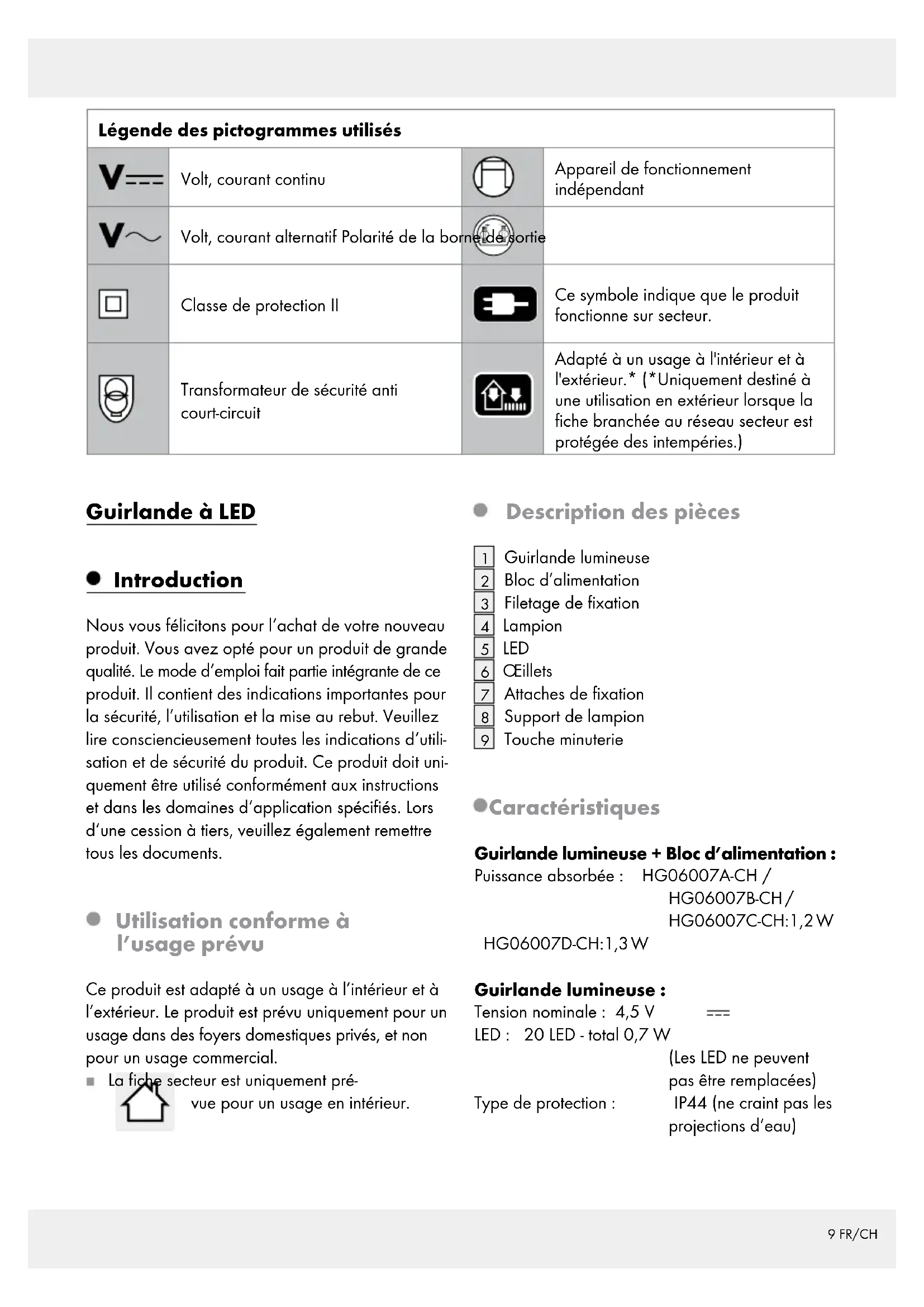 Touche minuterie Caractéristiques Guirlande lumineuse + Bloc d’alimentation : Puissance absorbée : HG06007A-CH / HG06007B-CH / HG06007C-CH:1,2 W HG06007D-CH:1,3 W Guirlande lumineuse : Tension nominale : 4,5 V LED : 20 LED - total 0,7 W (Les LED ne peuvent pas être remplacées) Type de protection : IP44 (ne craint pas les projections d‘eau)10 FR/CH Bloc d’alimentation : Tension nominale primaire: 100–240 V