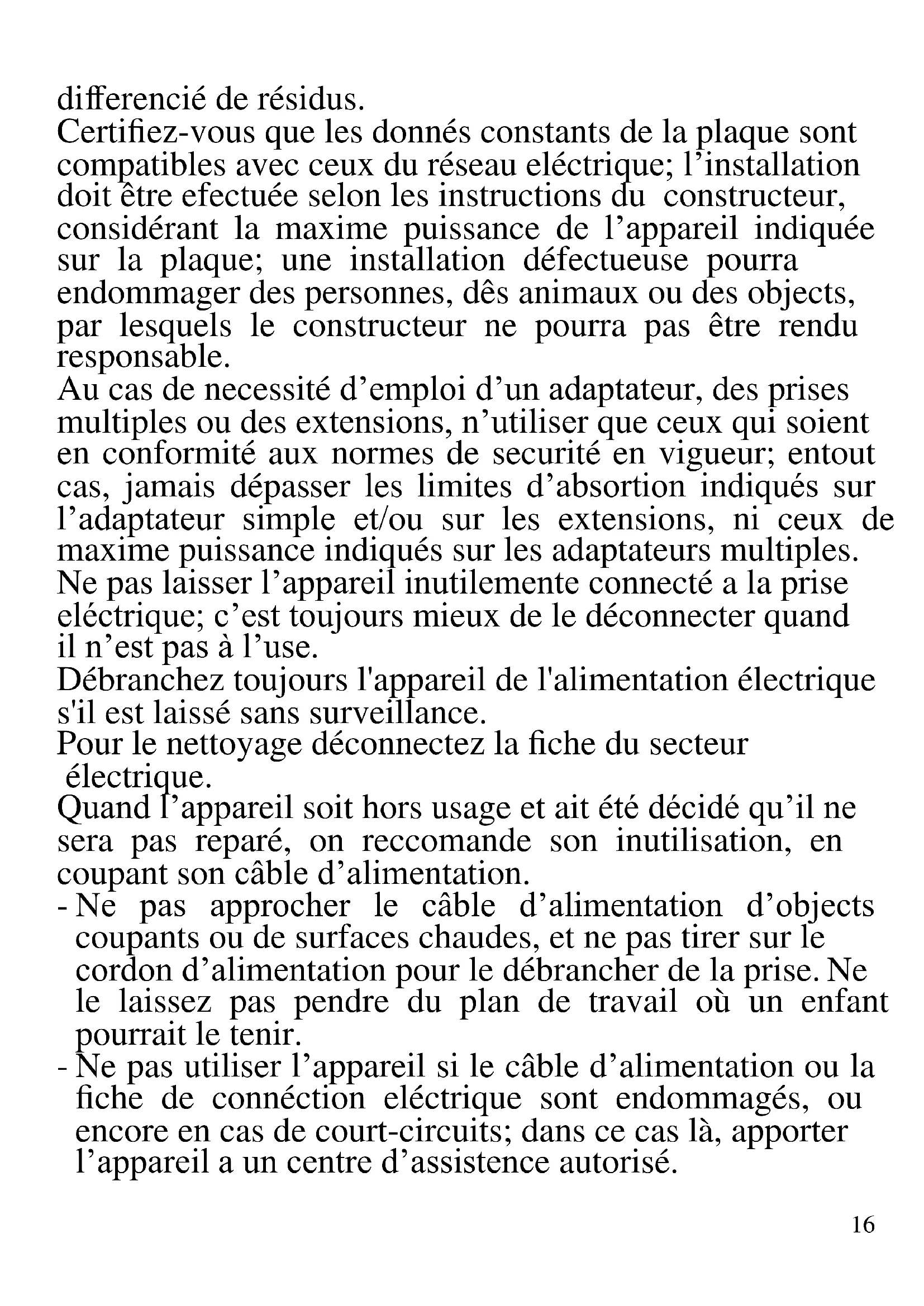 FRANCAIS: ADVERTISSEMENT Les indications suivantes sont très importantes en ce qui concerne l’installation, usage et manutention de cet appareil; gardez soigneusement ce manuel pour des futures consultations; n’utilisez pas l’appareil que selon les indications de ce manuel d’instructions; n’importe quel autre type d’ utilisation devra être consideré inaproprié et potentiellement dangereux; pour cette raison le constructeur ne pourra pas être rendu responsable si des dommages résultants de l’utilisation inapropriée ou irresponsable de l’appareil se produisent. Avant de l’utilisation, certifiez-vous de l’integrité de l’appareil; en cas de doute ne l’utilisez pas et addressez- vous a l’assistence téchnique autoriséa; ne laissez pas des parties de l’emballage (sacs de plastique, polystirène, ongles, agrafages, etc.) à la portée des enfants, car elles constituent des potentielles sources de danger; en autre, il faut rappeler que ces parties doivent être objet de collècte16 differencié de résidus. Certifiez-vous que les donnés constants de la plaque sont compatibles avec ceux du réseau eléctrique; l’installation doit être efectuée selon les instructions du constructeur, considérant la maxime puissance de l’appareil indiquée sur la plaque; une installation défectueuse pourra endommager des personnes, dês animaux ou des objects, par lesquels le constructeur ne pourra pas être rendu responsable. Au cas de necessité d’emploi d’un adaptateur, des prises multiples ou des extensions, n’utiliser que ceux qui soient en conformité aux normes de securité en vigueur; entout cas, jamais dépasser les limites d’absortion indiqués sur l’adaptateur simple et/ou sur les extensions, ni ceux de maxime puissance indiqués sur les adaptateurs multiples. Ne pas laisser l’appareil inutilemente connecté a la prise eléctrique; c’est toujours mieux de le déconnecter quand il n’est pas à l’use. Débranchez toujours l'appareil de l'alimentation électrique s'il est laissé sans surveillance. Pour le nettoyage déconnectez la fiche du secteur électrique. Quand l’appareil soit hors usage et ait été décidé qu’il ne sera pas reparé, on reccomande son inutilisation, en coupant son câble d’alimentation. - Ne pas approcher le câble d’alimentation d’objects coupants ou de surfaces chaudes, et ne pas tirer sur le cordon d’alimentation pour le débrancher de la prise. Ne le laissez pas pendre du plan de travail où un enfant pourrait le tenir. - Ne pas utiliser l’appareil si le câble d’alimentation ou la fiche de connéction eléctrique sont endommagés, ou encore en cas de court-circuits; dans ce cas là, apporter l’appareil a un centre d’assistence autorisé.17 - L’appareil n’est pas indiqué pour être exposé à des conditions météorologiques défavorables (pluie, vent, humidité, la glace, etc.); Gardez-le dans un endroit sec. Jamais opérer ou même toucher l’appareil avec les mains mouillées ou les pieds nus. - Cet appareil peut être utilisé par des enfants agés de plus de 8 ans et par des personnes avec une réduite capacité phisique, sensorial ou mental, ou encore avec peu d’expérience à son usage, pourvu qu’une supervision adéquate leur en soit assuré, ou s’ils auraient été instruits à l’usage de l’appareil en complete securité. Les opérations de nettoyage e de manutention ne oivent pás être efectués par des enfants, sauf pour ceux qui sont agés de plus de 8 ans et sont supervisionés. - Les enfants ne doivent pas jouer avec cet appareil. - Gardez l’appareil et le câble d’alimentation hors la portée des enfants agés de moins de 8 ans. Si le câble d'alimentation est endommagé ou en cas de panne et / ou de dysfonctionnement, ne modifiez pas l'appareil. Toute réparation doit être effectuée par le fabricant ou par son service d'assistance technique ou, en tout cas, par une personne possédant une qualification similaire, afin d'éviter tout risque. Le non-respect de ce qui précède peut compromettre la sécurité de l'appareil et invalider les conditions de la garantie. - Cet appareil est destiné à être utilisé dans les ménages et des applications similaires: les cuisines du personnel dans les magasins, bureaux et autres environnements de travail, pour les clients dans les hôtels, motels et autres environnements de type résidentiel, de type lit et petit- déjeuner, hébergement. - L’appareil n’est pas conçu pour être utilisé avec une minuterie extérieure ou un commande à distance. - N’utiliser que des accéssoires e pièces d’origine.18 Avant chaque utilisation, effectuez le cordon d'alimentation. Ne soumettez pas le produit à des chocs susceptibles de l'endommager.