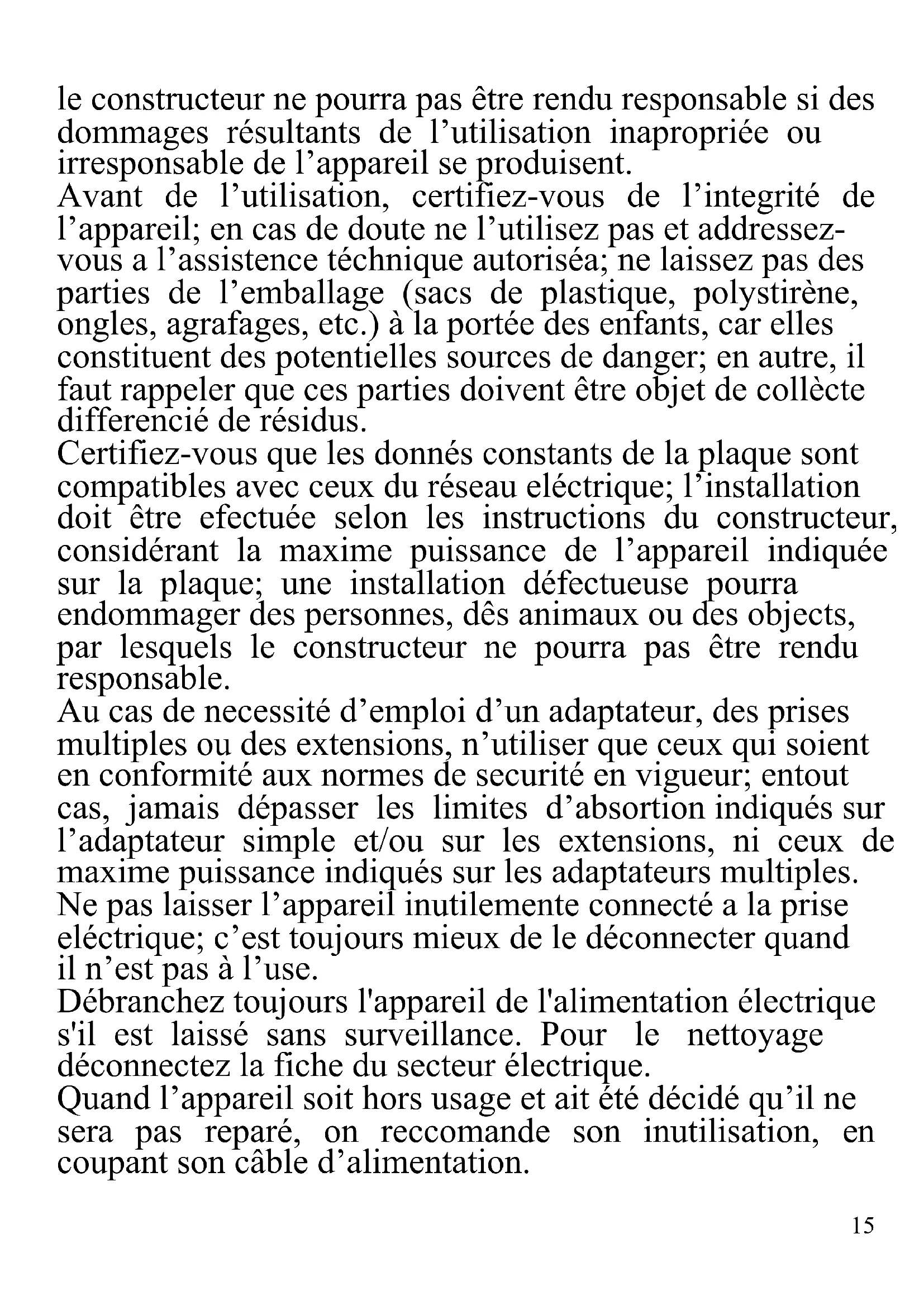 FRANCAIS: ADVERTISSEMENT Les indications suivantes sont très importantes en ce qui concerne l’installation, usage et manutention de cet appareil; gardez soigneusement ce manuel pour des futures consultations; n’utilisez pas l’appareil que selon les indications de ce manuel d’instructions; n’importe quel autre type d’ utilisation devra être consideré inaproprié et potentiellement dangereux; pour cette raison15 le constructeur ne pourra pas être rendu responsable si des dommages résultants de l’utilisation inapropriée ou irresponsable de l’appareil se produisent. Avant de l’utilisation, certifiez-vous de l’integrité de l’appareil; en cas de doute ne l’utilisez pas et addressez- vous a l’assistence téchnique autoriséa; ne laissez pas des parties de l’emballage (sacs de plastique, polystirène, ongles, agrafages, etc.) à la portée des enfants, car elles constituent des potentielles sources de danger; en autre, il faut rappeler que ces parties doivent être objet de collècte differencié de résidus. Certifiez-vous que les donnés constants de la plaque sont compatibles avec ceux du réseau eléctrique; l’installation doit être efectuée selon les instructions du constructeur, considérant la maxime puissance de l’appareil indiquée sur la plaque; une installation défectueuse pourra endommager des personnes, dês animaux ou des objects, par lesquels le constructeur ne pourra pas être rendu responsable. Au cas de necessité d’emploi d’un adaptateur, des prises multiples ou des extensions, n’utiliser que ceux qui soient en conformité aux normes de securité en vigueur; entout cas, jamais dépasser les limites d’absortion indiqués sur l’adaptateur simple et/ou sur les extensions, ni ceux de maxime puissance indiqués sur les adaptateurs multiples. Ne pas laisser l’appareil inutilemente connecté a la prise eléctrique; c’est toujours mieux de le déconnecter quand il n’est pas à l’use. Débranchez toujours l'appareil de l'alimentation électrique s'il est laissé sans surveillance. Pour le nettoyage déconnectez la fiche du secteur électrique. Quand l’appareil soit hors usage et ait été décidé qu’il ne sera pas reparé, on reccomande son inutilisation, en coupant son câble d’alimentation.16 - Ne pas approcher le câble d’alimentation d’objects coupants ou de surfaces chaudes, et ne pas tirer sur le cordon d’alimentation pour le débrancher de la prise. Ne le laissez pas pendre du plan de travail où un enfant pourrait le tenir. - Ne pas utiliser l’appareil si le câble d’alimentation ou la fiche de connéction eléctrique sont endommagés, ou encore en cas de court-circuits; dans ce cas là, apporter l’appareil a un centre d’assistence autorisé. - L’appareil n’est pas indiqué pour être exposé à des conditions météorologiques défavorables (pluie, vent, humidité, la glace, etc.); Gardez-le dans un endroit sec. Jamais opérer ou même toucher l’appareil avec les mains mouillées ou les pieds nus. - Cet appareil peut être utilisé par des enfants agés de plus de 8 ans et par des personnes avec une réduite capacité phisique, sensorial ou mental, ou encore avec peu d’expérience à son usage, pourvu qu’une supervision adéquate leur en soit assuré, ou s’ils auraient été instruits à l’usage de l’appareil en complete securité. Les opérations de nettoyage e de manutention ne oivent pás être efectués par des enfants, sauf pour ceux qui sont agés de plus de 8 ans et sont supervisionés. - Les enfants ne doivent pas jouer avec cet appareil. - Gardez l’appareil et le câble d’alimentation hors la portée des enfants agés de moins de 8 ans. Si le câble d'alimentation est endommagé ou en cas de panne et / ou de dysfonctionnement, ne modifiez pas l'appareil. Toute réparation doit être effectuée par le fabricant ou par son service d'assistance technique ou, en tout cas, par une personne possédant une qualification similaire, afin d'éviter tout risque. Le non-respect de ce qui précède peut compromettre la sécurité de l'appareil et invalider les conditions de la garantie.17 - N’utiliser que des accéssoires e pièces d’origine. - Cet appareil est destiné à être utilisé dans les ménages et des applications similaires: les cuisines du personnel dans les magasins, bureaux et autres environnements de travail, pour les clients dans les hôtels, motels et autres environnements de type résidentiel, de type lit et petit- déjeuner, hébergement. - L’appareil n’est pas conçu pour être utilisé avec une minuterie extérieure ou un commande à distance. Avant chaque utilisation, effectuez le cordon d'alimentation. Ne soumettez pas le produit à des chocs susceptibles de l'endommager.