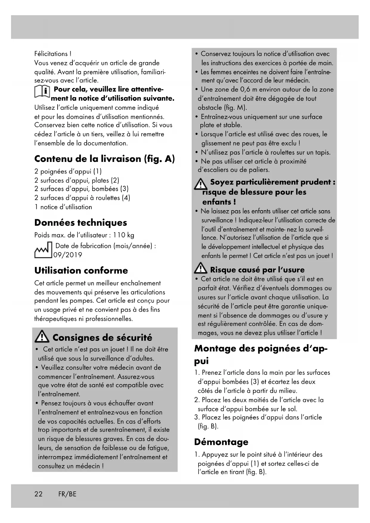 poignées d‘appui (1) et sortez celles-ci de l‘article en tirant (fig. B). Félicitations ! Vous venez d’acquérir un article de grande qualité. Avant la première utilisation, familiari- sez-vous avec l’article. Pour cela, veuillez lire attentive- ment la notice d’utilisation suivante. Utilisez l’article uniquement comme indiqué et pour les domaines d’utilisation mentionnés. Conservez bien cette notice d’utilisation. Si vous cédez l’article à un tiers, veillez à lui remettre l’ensemble de la documentation. Contenu de la livraison (fig. A) 2 poignées d‘appui (1) 2 surfaces d‘appui, plates (2) 2 surfaces d‘appui, bombées (3) 2 surfaces d‘appui à roulettes (4) 1 notice d‘utilisation Données techniques Poids max. de l‘utilisateur : 110 kg Date de fabrication (mois/année) : 09/2019 Utilisation conforme Cet article permet un meilleur enchaînement des mouvements qui préserve les articulations pendant les pompes. Cet article est conçu pour un usage privé et ne convient pas à des fins thérapeutiques ni professionnelles. Consignes de sécurité