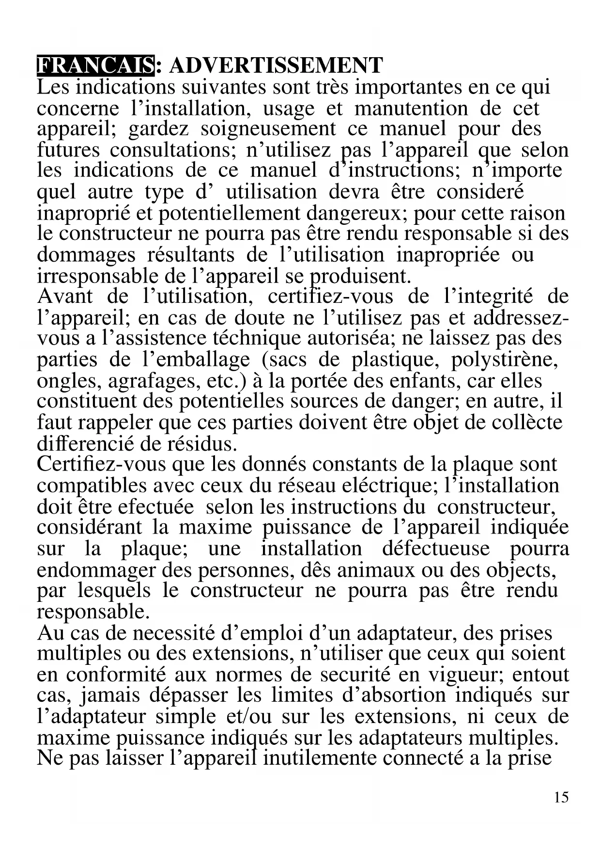 Eféctuez l’installation complète en suivant soigneusement les instructions indiquées sur “Montage". Ne connectez pas au sécteur eléctrique sans que l’installation ne soit complète. Ne laissez pas l’appareil sans supervision quando il est en train d’être utilisé. Déconnectez-le après chaque utilization. Ne pas tirer sur le cordon d’alimentation pour le débrancher de la prise. Ne pas plonger l’appareil dans l’eau ou n’importe quel autre liquide, et éviter que des écabloussures l’atteignent.18 Avant de commencer n’importe quel opération de nettoyage, déconnectez l’appareil du réseau eléctrique. N’introduisez pas des objets à travers les grilles de protection. Ne barrez pas, d’aucune façon, les barreaux de protection. Placez l’appareil sur des surfaces plâtes, résistantes et stables, éloignées de fenêtres. Le moteur du ventilateur peut fonctionner même si les grilles de protection n’aient pas encore été montées et fixées. Pour une totale securité, realiser l’instalation de manière complete et exaustive.