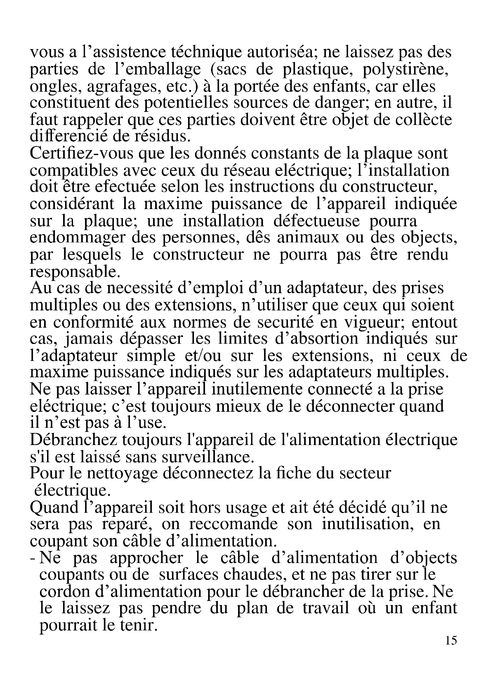 FRANCAIS: ADVERTISSEMENT Les indications suivantes sont très importantes en ce qui concerne l’installation, usage et manutention de cet appareil; gardez soigneusement ce manuel pour des futures consultations; n’utilisez pas l’appareil que selon les indications de ce manuel d’instructions; n’importe quel autre type d’ utilisation devra être consideré inaproprié et potentiellement dangereux; pour cette raison le constructeur ne pourra pas être rendu responsable si des dommages résultants de l’utilisation inapropriée ou irresponsable de l’appareil se produisent. Avant de l’utilisation, certifiez-vous de l’integrité de l’appareil; en cas de doute ne l’utilisez pas et addressez-15 vous a l’assistence téchnique autoriséa; ne laissez pas des parties de l’emballage (sacs de plastique, polystirène, ongles, agrafages, etc.) à la portée des enfants, car elles constituent des potentielles sources de danger; en autre, il faut rappeler que ces parties doivent être objet de collècte differencié de résidus. Certifiez-vous que les donnés constants de la plaque sont compatibles avec ceux du réseau eléctrique; l’installation doit être efectuée selon les instructions du constructeur, considérant la maxime puissance de l’appareil indiquée sur la plaque; une installation défectueuse pourra endommager des personnes, dês animaux ou des objects, par lesquels le constructeur ne pourra pas être rendu responsable. Au cas de necessité d’emploi d’un adaptateur, des prises multiples ou des extensions, n’utiliser que ceux qui soient en conformité aux normes de securité en vigueur; entout cas, jamais dépasser les limites d’absortion indiqués sur l’adaptateur simple et/ou sur les extensions, ni ceux de maxime puissance indiqués sur les adaptateurs multiples. Ne pas laisser l’appareil inutilemente connecté a la prise eléctrique; c’est toujours mieux de le déconnecter quand il n’est pas à l’use. Débranchez toujours l'appareil de l'alimentation électrique s'il est laissé sans surveillance. Pour le nettoyage déconnectez la fiche du secteur électrique. Quand l’appareil soit hors usage et ait été décidé qu’il ne sera pas reparé, on reccomande son inutilisation, en coupant son câble d’alimentation. - Ne pas approcher le câble d’alimentation d’objects coupants ou de surfaces chaudes, et ne pas tirer sur le cordon d’alimentation pour le débrancher de la prise. Ne le laissez pas pendre du plan de travail où un enfant pourrait le tenir.16 - Ne pas utiliser l’appareil si le câble d’alimentation ou la fiche de connéction eléctrique sont endommagés, ou encore en cas de court-circuits; dans ce cas là, apporter l’appareil a un centre d’assistence autorisé. - L’appareil n’est pas indiqué pour être exposé à des conditions météorologiques défavorables (pluie, vent, humidité, la glace, etc.); Gardez-le dans un endroit sec. Jamais opérer ou même toucher l’appareil avec les mains mouillées ou les pieds nus. - Cet appareil peut être utilisé par des enfants agés de plus de 8 ans et par des personnes avec une réduite capacité phisique, sensorial ou mental, ou encore avec peu d’expérience à son usage, pourvu qu’une supervision adéquate leur en soit assuré, ou s’ils auraient été instruits à l’usage de l’appareil en complete securité. Les opérations de nettoyage e de manutention ne oivent pás être efectués par des enfants, sauf pour ceux qui sont agés de plus de 8 ans et sont supervisionés. - Les enfants ne doivent pas jouer avec cet appareil. - Gardez l’appareil et le câble d’alimentation hors la portée des enfants agés de moins de 8 ans. Si le câble d'alimentation est endommagé ou en cas de panne et / ou de dysfonctionnement, ne modifiez pas l'appareil. Toute réparation doit être effectuée par le fabricant ou par son service d'assistance technique ou, en tout cas, par une personne possédant une qualification similaire, afin d'éviter tout risque. Le non-respect de ce qui précède peut compromettre la sécurité de l'appareil et invalider les conditions de la garantie. - Cet appareil est destiné à être utilisé dans les ménages et des applications similaires: les cuisines du personnel dans les magasins, bureaux et autres environnements de travail, pour les clients dans les hôtels, motels et autres environnements de type résidentiel, de type lit et petit- déjeuner, hébergement.17 - L’appareil n’est pas conçu pour être utilisé avec une minuterie extérieure ou un commande à distance. - N’utiliser que des accéssoires e pièces d’origine. Avant chaque utilisation, effectuez le cordon d'alimentation. Ne soumettez pas le produit à des chocs susceptibles de l'endommager.