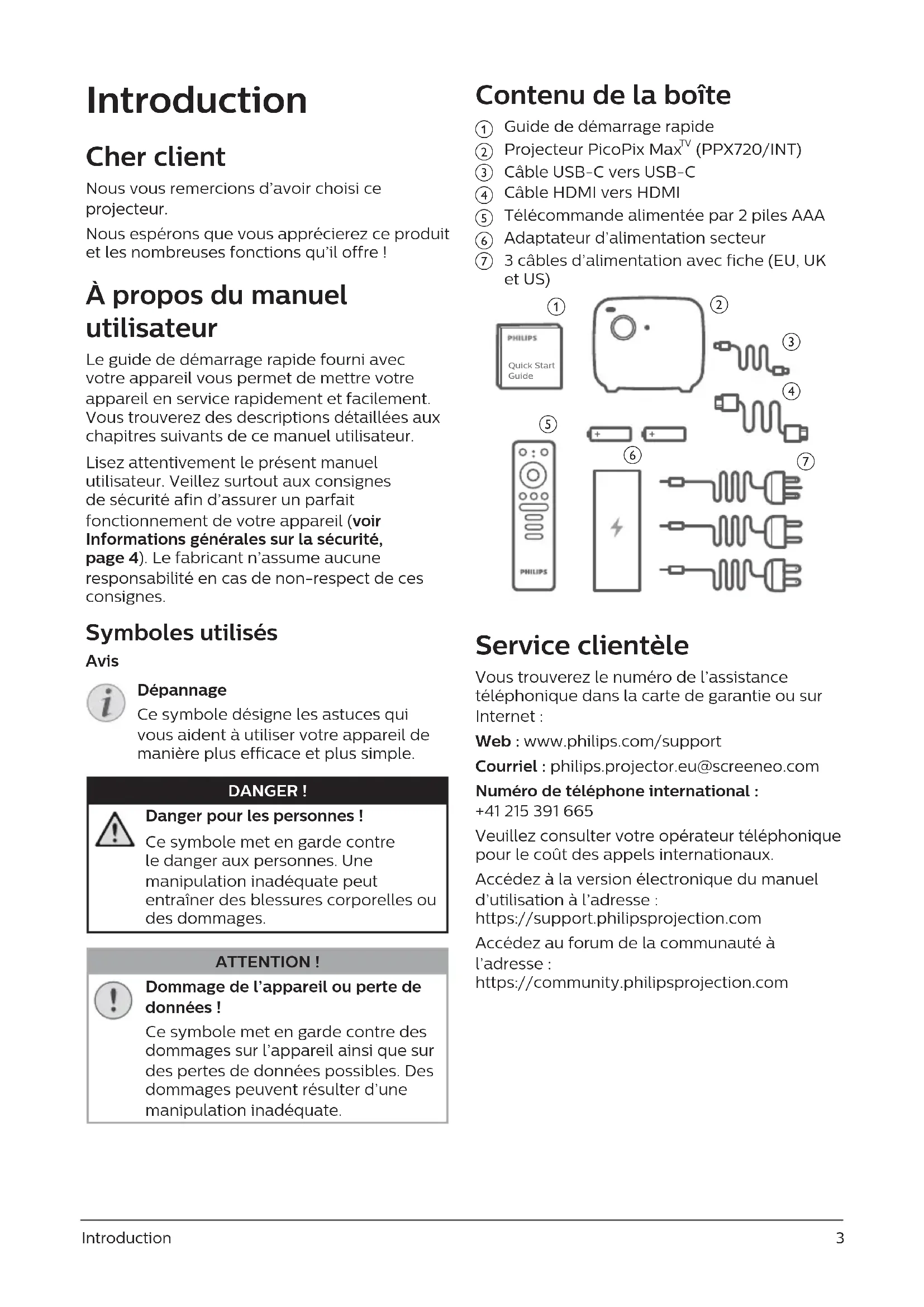 Service clientèle Vous trouverez le numéro de l’assistance téléphonique dans la carte de garantie ou sur Internet : Web : www.philips.com/support Courriel : philips.projector.eu@screeneo.com Numéro de téléphone international : +41 215 391 665 Veuillez consulter votre opérateur téléphonique pour le coût des appels internationaux. Accédez à la version électronique du manuel d’utilisation à l’adresse : https://support.philipsprojection.com Accédez au forum de la communauté à l’adresse : https://community.philipsprojection.com4 Philips · PicoPix Max