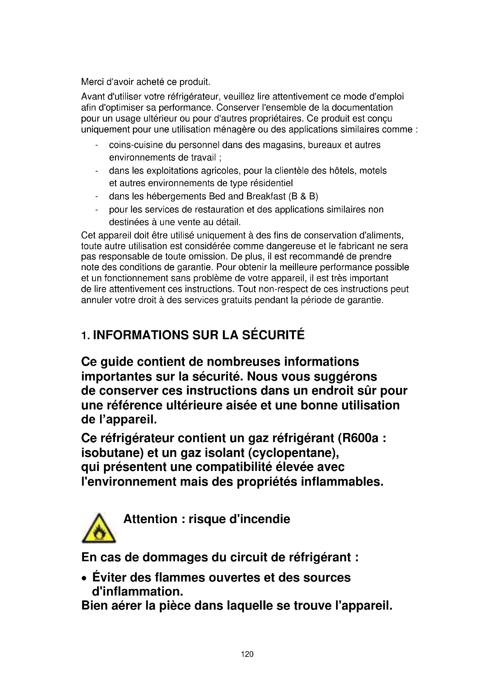 Ce guide contient de nombreuses informations importantes sur la sécurité. Nous vous suggérons de conserver ces instructions dans un endroit sûr pour une référence ultérieure aisée et une bonne utilisation de l’appareil. Ce réfrigérateur contient un gaz réfrigérant (R600a : isobutane) et un gaz isolant (cyclopentane), qui présentent une compatibilité élevée avec l'environnement mais des propriétés inflammables. Attention : risque d'incendie En cas de dommages du circuit de réfrigérant :