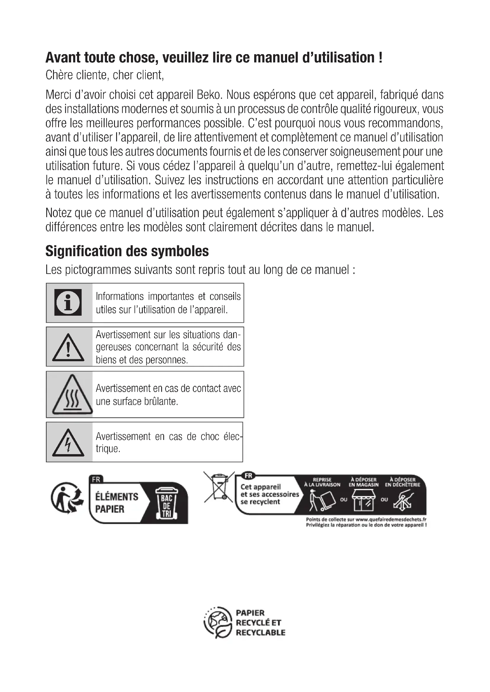 - Dropping the appliance will render it non-opera- tional or cause permanent damage.Avant toute chose, veuillez lire ce manuel d’utilisation ! Chère cliente, cher client, Merci d’avoir choisi cet appareil Beko. Nous espérons que cet appareil, fabriqué dans des installations modernes et soumis à un processus de contrôle qualité rigoureux, vous offre les meilleures performances possible. C’est pourquoi nous vous recommandons, avant d’utiliser l’appareil, de lire attentivement et complètement ce manuel d’utilisation ainsi que tous les autres documents fournis et de les conserver soigneusement pour une utilisation future. Si vous cédez l’appareil à quelqu’un d’autre, remettez-lui également le manuel d’utilisation. Suivez les instructions en accordant une attention particulière à toutes les informations et les avertissements contenus dans le manuel d’utilisation. Notez que ce manuel d’utilisation peut également s’appliquer à d’autres modèles. Les différences entre les modèles sont clairement décrites dans le manuel. Signification des symboles Les pictogrammes suivants sont repris tout au long de ce manuel :