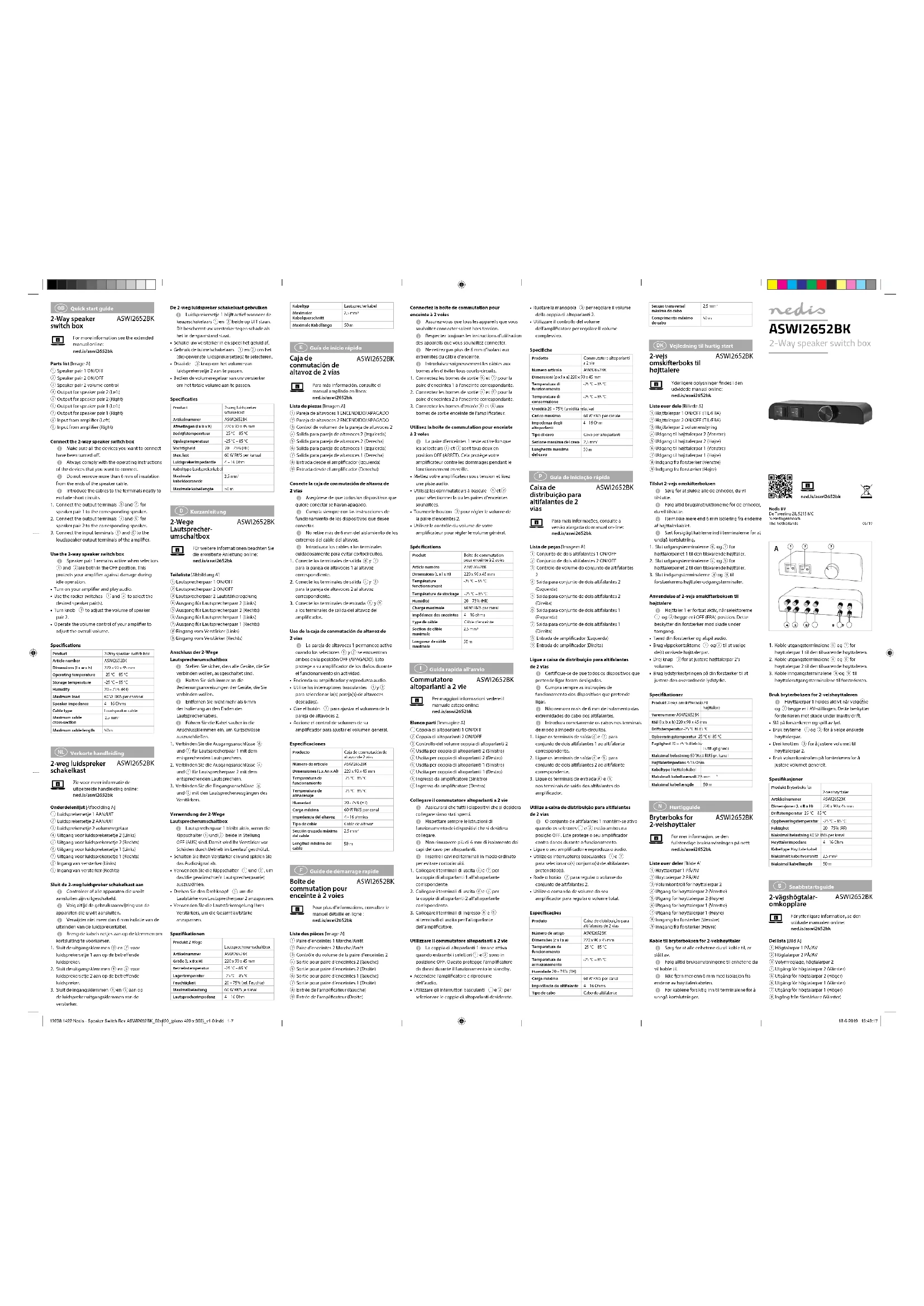 Guide de démarrage rapide Boîte de commutation pour enceinte à 2 voies ASWI2652BK Pour plus d'informations, consultez le manuel détaillé en ligne : ned.is/aswi2652bkListe des pièces [Image A] Paire d’enceintes 1 Marche/Arrêt Paire d’enceintes 2 Marche/Arrêt Contrôle du volume de la paire d'enceintes 2 Sortie pour paire d’enceintes 2 (Gauche) Sortie pour paire d’enceintes 2 (Droite) Sortie pour paire d’enceintes 1 (Gauche) Sortie pour paire d’enceintes 1 (Droite) Entrée de l'amplicateur (Gauche) Entrée de l'amplicateur (Droite)De 2-weg luidspreker schakelkast gebruiken 4 Luidsprekersetje 1 blijft actief wanneer de keuzeschakelaars