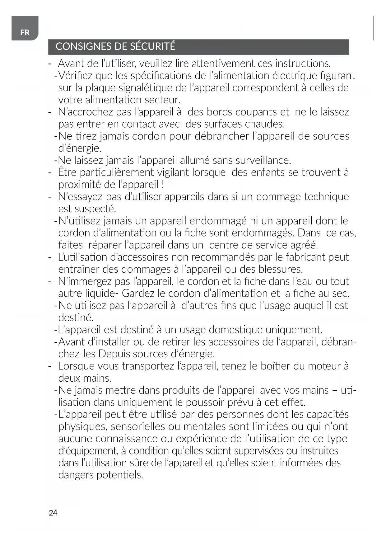 L’appareil peut être ulisé par des personnes dont les capacités physiques, sensorielles ou mentales sont limitées ou qui n’ont aucune connaissance ou expérience de l’ulisaon de ce type d’équipement, à condion qu’elles soient supervisées ou instruites dans l’ulisaon sûre de l’appareil et qu’elles soient informées des dangers potenels.25