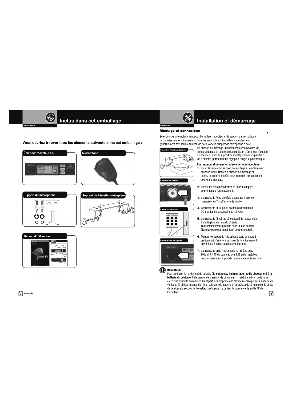 Pour améliorer le rendement de la radio CB, connectez l'alimentation radio directement à la batterie du véhicule. Cela permet de s'assurer de ce qui suit : 1) réduire le bruit de la ligne électrique conduite en radié en tirant parti des propriétés de filtrage mécanique de la batterie du véhicule. 2) Utiliser la jauge de fil correcte entre la batterie et la radio, aider à minimiser la chute de tension à la section de l'émetteur radio pour maximiser la puissance de sortie RF de l'émetteur.