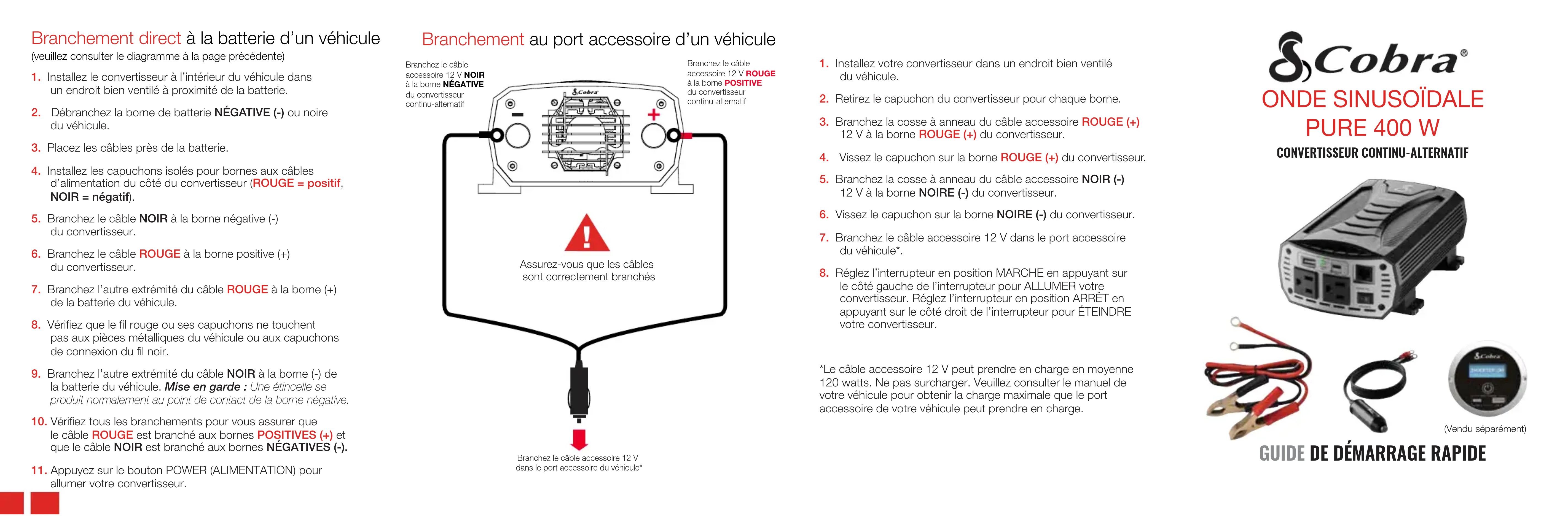 5. Branchez la cosse à anneau du câble accessoire NOIR (-) 12 V à la borne NOIRE (-) du convertisseur.6. Vissez le capuchon sur la borne NOIRE (-) du convertisseur.7. Branchez le câble accessoire 12 V dans le port accessoire du véhicule*.8. Réglez l’interrupteur en position MARCHE en appuyant surle côté gauche de l’interrupteur pour ALLUMER votre convertisseur. Réglez l’interrupteur en position ARRÊT en appuyant sur le côté droit de l’interrupteur pour ÉTEINDRE votre convertisseur.*Le câble accessoire 12 V peut prendre en charge en moyenne 120 watts. Ne pas surcharger. Veuillez consulter le manuel de votre véhicule pour obtenir la charge maximale que le port accessoire de votre véhicule peut prendre en charge.(Vendu séparément)Branchez le câble accessoire 12 V NOIR à la borne NÉGATIVE du convertisseur continu-alternatifBranchez le câble accessoire 12 V ROUGE à la borne POSITIVE du convertisseur continu-alternatifBranchez le câble accessoire 12 V dans le port accessoire du véhicule*Merci d’avoir acheté le convertisseur à onde sinusoïdale pure Cobra 400 watts (Modèle CPI400PSW)