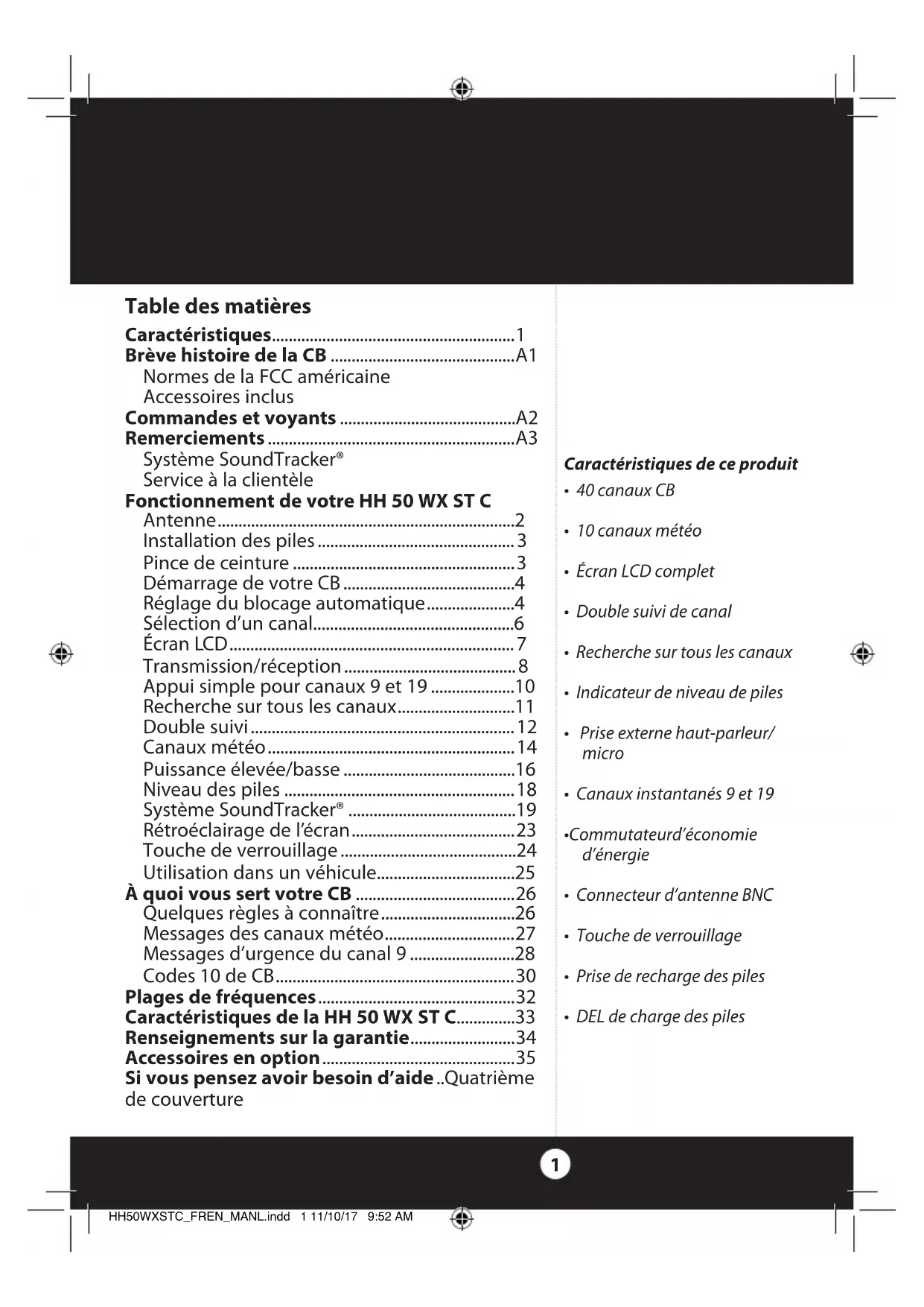 - Table des matières Caractéristiques Brève histoire de la CB A1 Normes de la FCC américaine Accessoires inclus Commandes et voyants A2 Remerciements p. 1