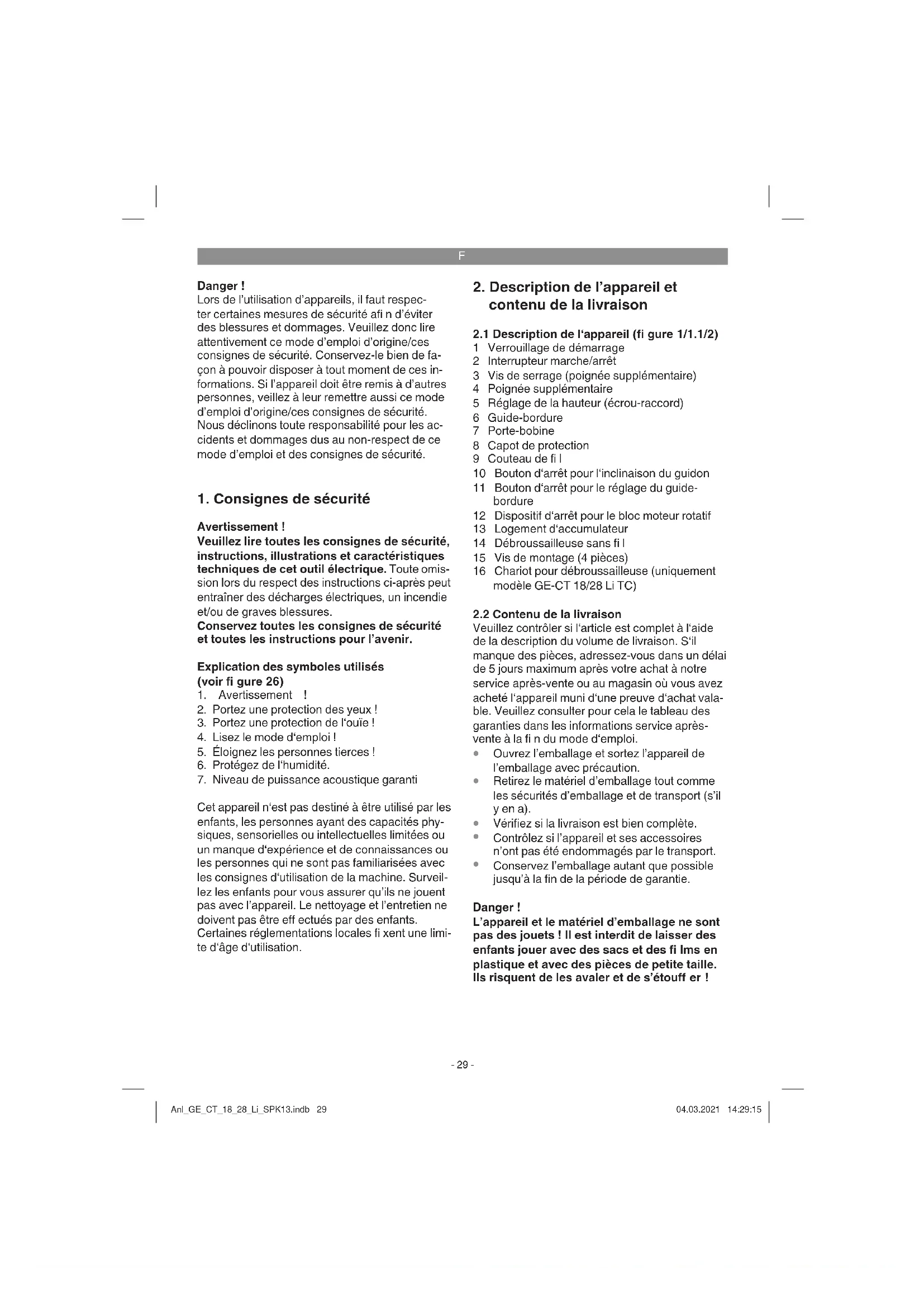 Conservez l’emballage autant que possible jusqu’à la fin de la période de garantie. Danger ! L’appareil et le matériel d’emballage ne sont pas des jouets ! Il est interdit de laisser des enfants jouer avec des sacs et des fi lms en plastique et avec des pièces de petite taille. Ils risquent de les avaler et de s’étouff er ! Anl_GE_CT_18_28_Li_SPK13.indb 29Anl_GE_CT_18_28_Li_SPK13.indb 29 04.03.2021 14:29:1504.03.2021 14:29:15F