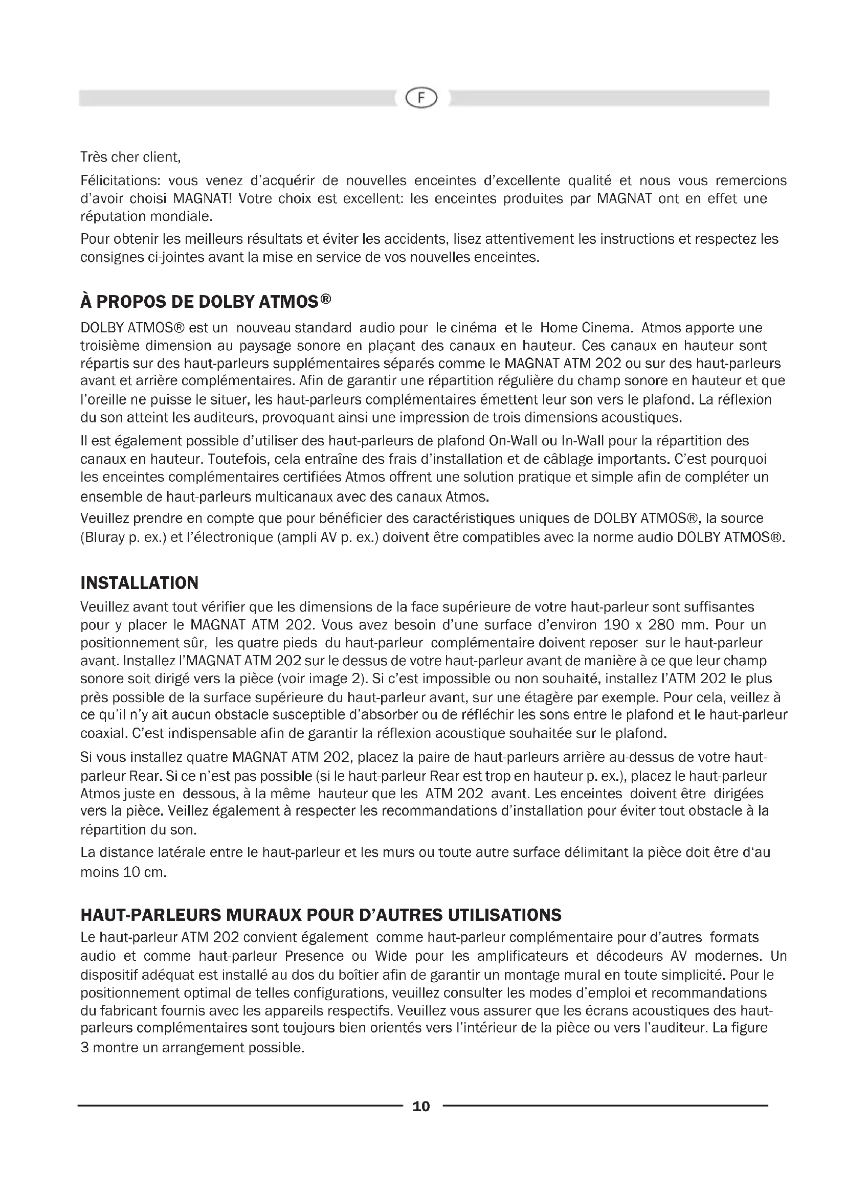 DOLBY ATMOS® est un nouveau standard audio pour le cinéma et le Home Cinema. Atmos apporte une troisième dimension au paysage sonore en plaçant des canaux en hauteur. Ces canaux en hauteur sont répartis sur des haut-parleurs supplémentaires séparés comme le MAGNAT ATM 202 ou sur des haut-parleurs avant et arrière complémentaires. Afin de garantir une répartition régulière du champ sonore en hauteur et que l’oreille ne puisse le situer, les haut-parleurs complémentaires émettent leur son vers le plafond. La réflexion du son atteint les auditeurs, provoquant ainsi une impression de trois dimensions acoustiques. Il est également possible d’utiliser des haut-parleurs de plafond On-Wall ou In-Wall pour la répartition des canaux en hauteur. Toutefois, cela entraîne des frais d’installation et de câblage importants. C’est pourquoi les enceintes complémentaires certifiées Atmos offrent une solution pratique et simple afin de compléter un ensemble de haut-parleurs multicanaux avec des canaux Atmos. Veuillez prendre en compte que pour bénéficier des caractéristiques uniques de DOLBY ATMOS®, la source (Bluray p. ex.) et l’électronique (ampli AV p. ex.) doivent être compatibles avec la norme audio DOLBY ATMOS®. INSTALLATION Veuillez avant tout vérifier que les dimensions de la face supérieure de votre haut-parleur sont suffisantes pour y placer le MAGNAT ATM 202. Vous avez besoin d’une surface d’environ 190 x 280 mm. Pour un positionnement sûr, les quatre pieds du haut-parleur complémentaire doivent reposer sur le haut-parleur avant. Installez l’MAGNAT ATM 202 sur le dessus de votre haut-parleur avant de manière à ce que leur champ sonore soit dirigé vers la pièce (voir image 2). Si c’est impossible ou non souhaité, installez l’ATM 202 le plus près possible de la surface supérieure du haut-parleur avant, sur une étagère par exemple. Pour cela, veillez à ce qu’il n’y ait aucun obstacle susceptible d’absorber ou de réfléchir les sons entre le plafond et le haut-parleur coaxial. C’est indispensable afin de garantir la réflexion acoustique souhaitée sur le plafond. Si vous installez quatre MAGNAT ATM 202, placez la paire de haut-parleurs arrière au-dessus de votre haut- parleur Rear. Si ce n’est pas possible (si le haut-parleur Rear est trop en hauteur p. ex.), placez le haut-parleur Atmos juste en dessous, à la même hauteur que les ATM 202 avant. Les enceintes doivent être dirigées vers la pièce. Veillez également à respecter les recommandations d’installation pour éviter tout obstacle à la répartition du son. La distance latérale entre le haut-parleur et les murs ou toute autre surface délimitant la pièce doit être d‘au moins 10 cm.