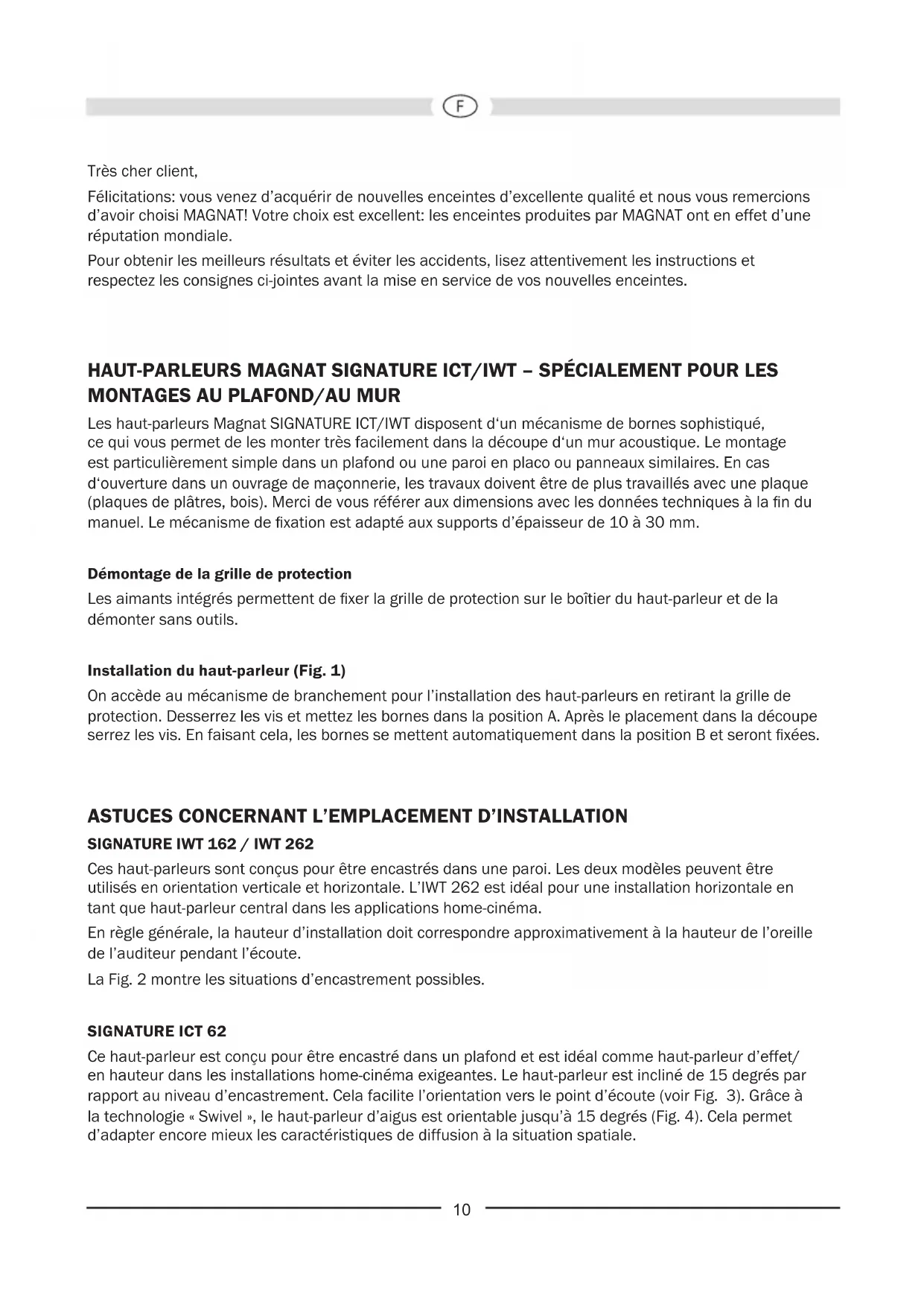 Ces haut-parleurs sont conçus pour être encastrés dans une paroi. Les deux modèles peuvent être utilisés en orientation verticale et horizontale. L’IWT 262 est idéal pour une installation horizontale en tant que haut-parleur central dans les applications home-cinéma. En règle générale, la hauteur d’installation doit correspondre approximativement à la hauteur de l’oreille de l’auditeur pendant l’écoute. La Fig. 2 montre les situations d’encastrement possibles. SIGNATURE ICT 62 Ce haut-parleur est conçu pour être encastré dans un plafond et est idéal comme haut-parleur d’effet/ en hauteur dans les installations home-cinéma exigeantes. Le haut-parleur est incliné de 15 degrés par rapport au niveau d’encastrement. Cela facilite l’orientation vers le point d’écoute (voir Fig. 3). Grâce à la technologie « Swivel », le haut-parleur d’aigus est orientable jusqu’à 15 degrés (Fig. 4). Cela permet d’adapter encore mieux les caractéristiques de diffusion à la situation spatiale.11 RECOMMANDATIONS GÉNÉRALES SUR LE BRANCHEMENT DE VOS ENCEINTES MAGNAT Utilisez toujours des câbles de liaison de bonne qualité et spéciques pour haut-parleurs que vous vous procurerez auprès d’un revendeur spécialisé. Pour éviter les pertes de qualité dues aux câbles, nous vous recommandons d’utiliser des câbles ayant une section d’au moins 1 mm² pour des longueurs inférieures à 3 m et d’au moins 1,5 mm² pour des longueurs supérieures à 3 m. Avant de brancher ou de débrancher les câbles des enceintes, éteignez toujours votre amplicateur ou votre récepteur. Placez les enceintes aux emplacements prévus et coupez les câbles à la longueur correcte. Les câbles de chacun des canaux doivent être exactement de même longueur. Dénudez l’isolant sur 10 à 15 mm à chaque extrémité des câbles et torsadez les extrémités. Les connexions des haut-parleurs sont équipées d‘un mécanisme de coinçage (g. 5). Appuyer sur la tête de la borne et insérer l‘extrémité dénudée du toron dans la perforation latérale. En lâchant la tête de la borne, le câble sera arrêté de façon sûre, et un meilleur contact sera assuré. IMPORTANT: Pour obtenir une bonne qualité sonore, les câbles doivent être reliés de telle manière que les enceintes soient “en phase”. Ceci signie que les bornes noires négatives (-) des enceintes doivent être reliées aux bornes négatives (-) de l’amplicateur, les bornes positives (+) des enceintes aux bornes positives (+) de l’amplicateur. Pour faciliter le branchement, un des ls de la plupart des câbles pour haut-parleurs peut être repéré à l’aide d’une bande colorée ou d’une nervure sur l’isolant. Avant de mettre votre appareil en marche, vériez une nouvelle fois tous vos branchements, assurez-vous que les vis des bornes sont bien serrées et qu’aucun petit l résiduel ne provoque de court circuit – ceci pourrait en effet être dangereux pour votre amplicateur! RÉGLAGE DE NIVEAU AIGU (FIG. 6) Le diplexeur avec commutateur de haute qualité à l’avant vous permet d’effectuer un réglage sonore personnalisé de votre système de haut-parleurs. Il est recommandé de procéder au réglage optimal suivant vos goûts d’écoute personnels. Nous recommandons comme réglages de base pour différents espaces d’écoute les positions suivantes du commutateur: Espace d’écoute Exemple Position du commutateur Installation à faible isolation sonore Surfaces à forte réexion, carrelage, grandes surfaces vitrées, espaces faiblement meublés -3dB Installation à isolation sonore moyenne Moquettes, surfaces vitrées avec rideaux, cuirs, espaces modérément meublésS 0dB Installation à forte isolation sonore Moquettes, capitonnages, rideaux rigides, espaces fortement meublés +3dB