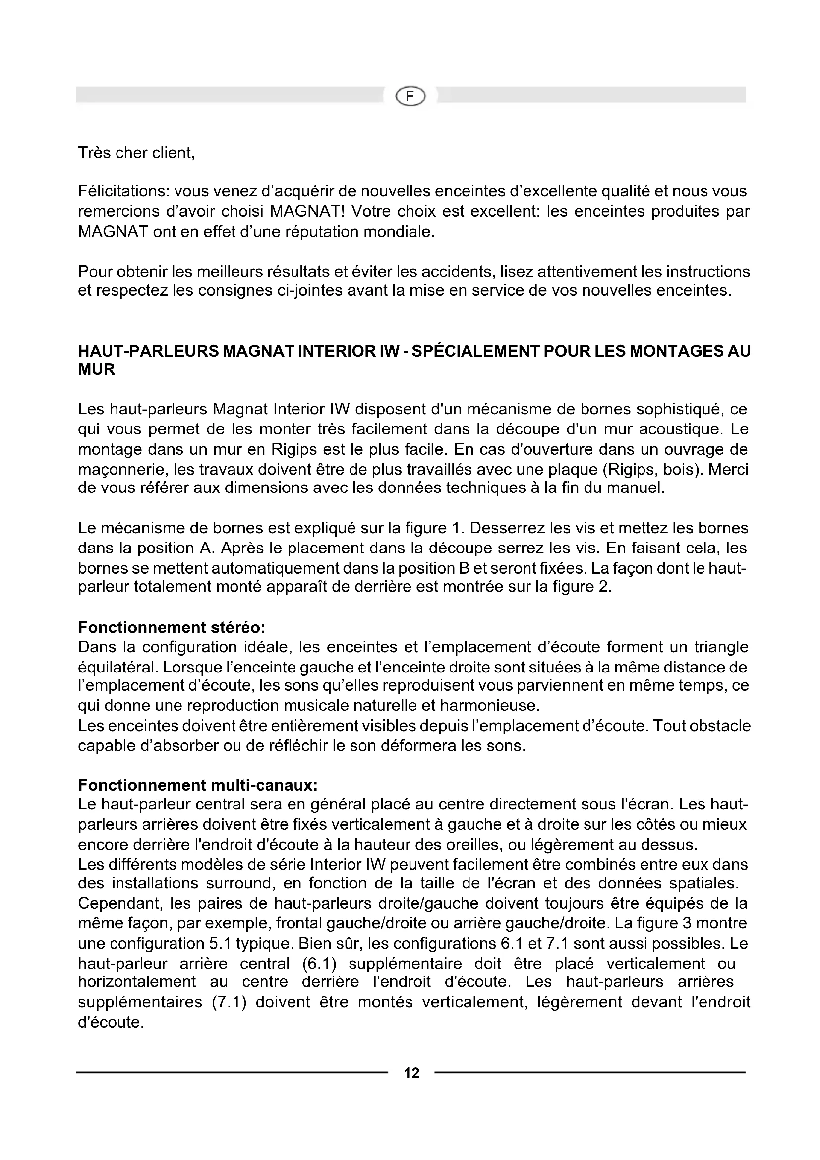 Très cher client, Félicitations: vous venez d’acquérir de nouvelles enceintes d’excellente qualité et nous vous remercions d’avoir choisi MAGNAT! Votre choix est excellent: les enceintes produites par MAGNAT ont en effet d’une réputation mondiale. Pour obtenir les meilleurs résultats et éviter les accidents, lisez attentivement les instructions et respectez les consignes ci-jointes avant la mise en service de vos nouvelles enceintes. HAUT-PARLEURS MAGNAT INTERIOR IW - SPÉCIALEMENT POUR LES MONTAGES AU MUR Les haut-parleurs Magnat Interior IW disposent d'un mécanisme de bornes sophistiqué, ce qui vous permet de les monter très facilement dans la découpe d'un mur acoustique. Le montage dans un mur en Rigips est le plus facile. En cas d'ouverture dans un ouvrage de maçonnerie, les travaux doivent être de plus travaillés avec une plaque (Rigips, bois). Merci de vous référer aux dimensions avec les données techniques à la fin du manuel. Le mécanisme de bornes est expliqué sur la figure 1. Desserrez les vis et mettez les bornes dans la position A. Après le placement dans la découpe serrez les vis. En faisant cela, les bornes se mettent automatiquement dans la position B et seront fixées. La façon dont le haut- parleur totalement monté apparaît de derrière est montrée sur la figure 2. Fonctionnement stéréo: Dans la configuration idéale, les enceintes et l’emplacement d’écoute forment un triangle équilatéral. Lorsque l’enceinte gauche et l’enceinte droite sont situées à la même distance de l’emplacement d’écoute, les sons qu’elles reproduisent vous parviennent en même temps, ce qui donne une reproduction musicale naturelle et harmonieuse. Les enceintes doivent être entièrement visibles depuis l’emplacement d’écoute. Tout obstacle capable d’absorber ou de réfléchir le son déformera les sons. Fonctionnement multi-canaux: Le haut-parleur central sera en général placé au centre directement sous l'écran. Les haut- parleurs arrières doivent être fixés verticalement à gauche et à droite sur les côtés ou mieux encore derrière l'endroit d'écoute à la hauteur des oreilles, ou légèrement au dessus. Les différents modèles de série Interior IW peuvent facilement être combinés entre eux dans des installations surround, en fonction de la taille de l'écran et des données spatiales. Cependant, les paires de haut-parleurs droite/gauche doivent toujours être équipés de la même façon, par exemple, frontal gauche/droite ou arrière gauche/droite. La figure 3 montre une configuration 5.1 typique. Bien sûr, les configurations 6.1 et 7.1 sont aussi possibles. Le haut-parleur arrière central (6.1) supplémentaire doit être placé verticalement ou horizontalement au centre derrière l'endroit d'écoute. Les haut-parleurs arrières supplémentaires (7.1) doivent être montés verticalement, légèrement devant l'endroit d'écoute.13