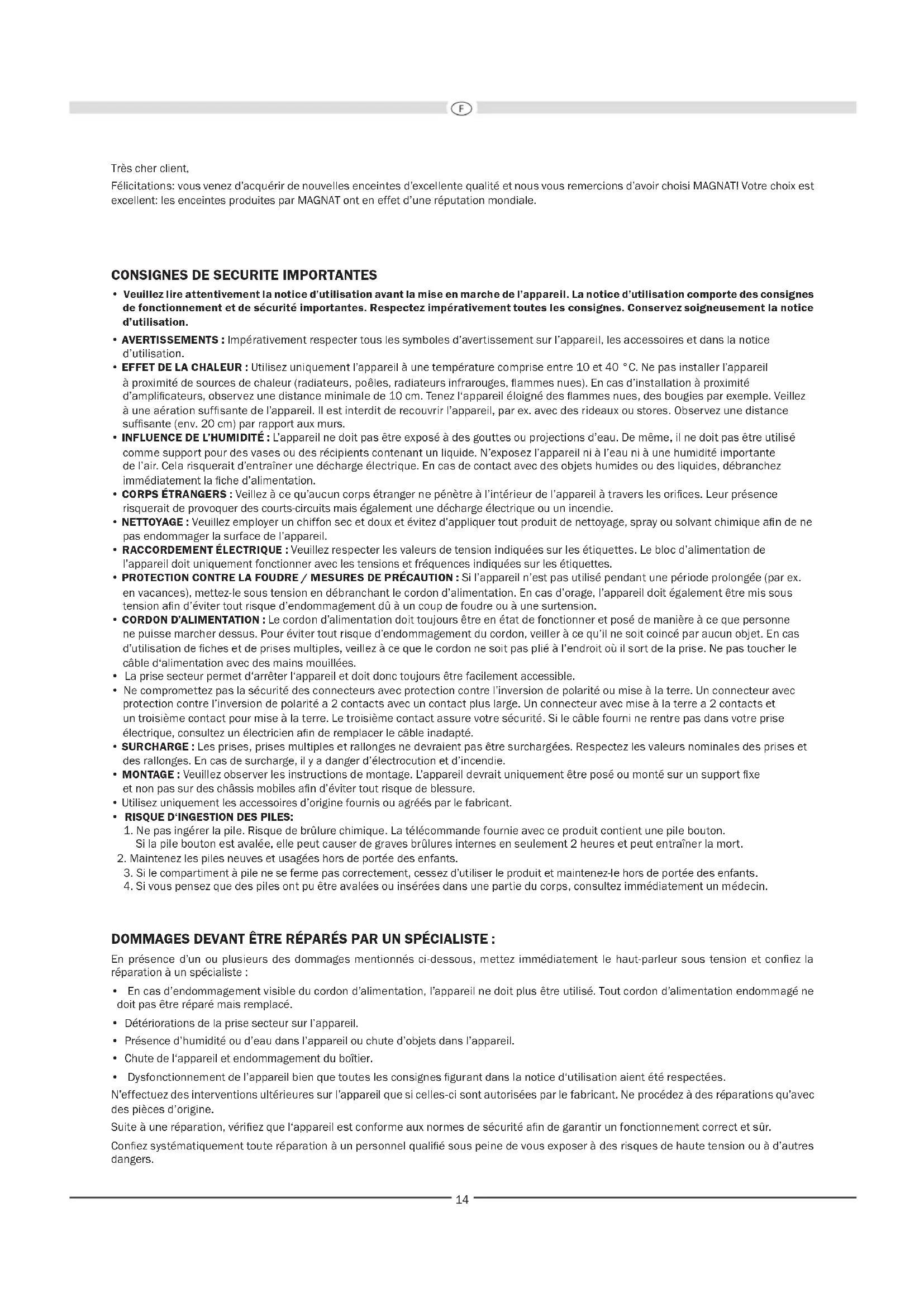 Très cher client, Félicitations: vous venez d’acquérir de nouvelles enceintes d’excellente qualité et nous vous remercions d’avoir choisi MAGNAT! Votre choix est excellent: les enceintes produites par MAGNAT ont en effet d’une réputation mondiale.