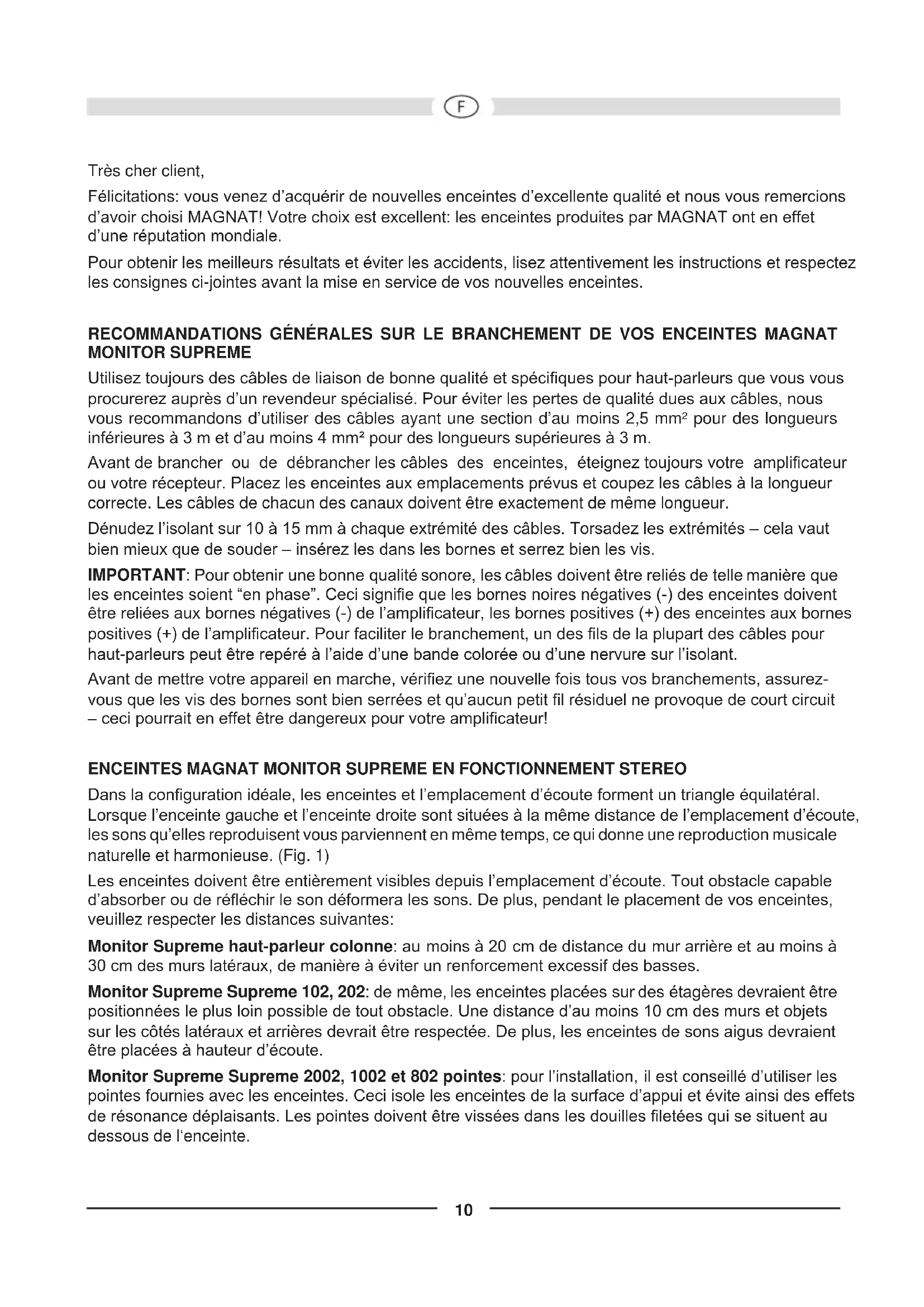 Figs. 3 and 4 show two different methods of connecting to AV receivers. Fig. 3: AV receiver without subwoofer output. Fig. 4: AV receiver with subwoofer output. HOW TO AVOID DAMAGE TO YOUR VALUABLE SPEAKERS All MAGNAT loudspeakers are designed and built for optimum sound reproduction with the tone controls in the central position – i.e. with “linear” amplier output. Turning up the bass and treble controls too far delivers more power to the woofers and/or tweeters, and at high volumes this can actually destroy the speaker units! If the output of your amplier is signicantly higher than the rated power handling capacity of your speakers extremely high volumes can physically destroy your speakers. This doesn’t actually happen often but you should be aware that it is possible. Weak ampliers with low output ratings can actually be more dangerous for your speakers at medium volumes because weak ampliers may overload much faster than powerful ones and this causes measurable and audible distortion, which is extremely dangerous to your loudspeakers. Always turn the volume down immediately as soon as you hear distortion! If you like listening to loud music make sure that your amplier can deliver at least as much power as the speakers’ power-handling rating. THE SOUND YOU CAN’T HEAR... Ampliers, tuners and CD players can all produce inaudible high-frequency signals – and this doesn’t only apply to cheap products. If your tweeters fail at low or medium volumes you should have a qualied technician check your system components for dangerous inaudible signals.9 SPECIFICATIONS Monitor Supreme 2002 Monitor Supreme 1002 Conguration: 3-way bass reex 3-way bass reex Power-handling capacity: 225 / 450 W 190 / 380 W Impedance: 4 – 8 ohms 4 – 8 ohms Frequency response: 18 – 40 000 Hz 19 – 40 000 Hz Recommended amplier output: 30 – 450 W 30 – 380 W Efciency (1W/1m): 93 dB 92 dB Dimensions (WxHxD): 267 x 1080 x 335 mm 215 x 950 x 313 mm Accessory: Hard rubber spikes Hard rubber spikes Metal spikes Metal spikes Monitor Supreme 802 Monitor Supreme 202 Conguration: 2 ½-way bass reex 2-way bass reex Power-handling capacity: 170 / 340 W 100 / 200 W Impedance: 4 – 8 ohms 4 – 8 ohms Frequency response: 22 – 40 000 Hz 34 – 40 000 Hz Recommended amplier output: 30 – 340 W 30 – 200 W Efciency (1W/1m): 92 dB 91 dB Dimensions (WxHxD): 215 x 850 x 273 mm 215 x 354 x 273 mm Accessory: Hard rubber spikes Hard rubber spikes Metal spikes Monitor Supreme 102 Monitor Supreme Center 252 Conguration: 2-way 2-way Power-handling capacity: 60 / 120 W 75 / 150 W Impedance: 4 – 8 ohms 4 – 8 ohms Frequency response: 42 – 36 000 Hz 40 – 34 000 Hz Recommended amplier output: 20 – 110 W 20 – 150 W Efciency (1W/1m): 89 dB 90 dB Dimensions (WxHxD): 149 x 250 x 190 mm 420 x 145 x 190 mm Accessory: Hard rubber spikes Hard rubber spikes Subject to technical change.10 Très cher client, Félicitations: vous venez d’acquérir de nouvelles enceintes d’excellente qualité et nous vous remercions d’avoir choisi MAGNAT! Votre choix est excellent: les enceintes produites par MAGNAT ont en effet d’une réputation mondiale. Pour obtenir les meilleurs résultats et éviter les accidents, lisez attentivement les instructions et respectez les consignes ci-jointes avant la mise en service de vos nouvelles enceintes. RECOMMANDATIONS GÉNÉRALES SUR LE BRANCHEMENT DE VOS ENCEINTES MAGNAT MONITOR SUPREME Utilisez toujours des câbles de liaison de bonne qualité et spéciques pour haut-parleurs que vous vous procurerez auprès d’un revendeur spécialisé. Pour éviter les pertes de qualité dues aux câbles, nous vous recommandons d’utiliser des câbles ayant une section d’au moins 2,5 mm² pour des longueurs inférieures à 3 m et d’au moins 4 mm² pour des longueurs supérieures à 3 m. Avant de brancher ou de débrancher les câbles des enceintes, éteignez toujours votre amplicateur ou votre récepteur. Placez les enceintes aux emplacements prévus et coupez les câbles à la longueur correcte. Les câbles de chacun des canaux doivent être exactement de même longueur. Dénudez l’isolant sur 10 à 15 mm à chaque extrémité des câbles. Torsadez les extrémités – cela vaut bien mieux que de souder – insérez les dans les bornes et serrez bien les vis. IMPORTANT: Pour obtenir une bonne qualité sonore, les câbles doivent être reliés de telle manière que les enceintes soient “en phase”. Ceci signie que les bornes noires négatives (-) des enceintes doivent être reliées aux bornes négatives (-) de l’amplicateur, les bornes positives (+) des enceintes aux bornes positives (+) de l’amplicateur. Pour faciliter le branchement, un des ls de la plupart des câbles pour haut-parleurs peut être repéré à l’aide d’une bande colorée ou d’une nervure sur l’isolant. Avant de mettre votre appareil en marche, vériez une nouvelle fois tous vos branchements, assurez- vous que les vis des bornes sont bien serrées et qu’aucun petit l résiduel ne provoque de court circuit – ceci pourrait en effet être dangereux pour votre amplicateur! ENCEINTES MAGNAT MONITOR SUPREME EN FONCTIONNEMENT STEREO Dans la conguration idéale, les enceintes et l’emplacement d’écoute forment un triangle équilatéral. Lorsque l’enceinte gauche et l’enceinte droite sont situées à la même distance de l’emplacement d’écoute, les sons qu’elles reproduisent vous parviennent en même temps, ce qui donne une reproduction musicale naturelle et harmonieuse. (Fig. 1) Les enceintes doivent être entièrement visibles depuis l’emplacement d’écoute. Tout obstacle capable d’absorber ou de rééchir le son déformera les sons. De plus, pendant le placement de vos enceintes, veuillez respecter les distances suivantes: Monitor Supreme haut-parleur colonne: au moins à 20 cm de distance du mur arrière et au moins à 30 cm des murs latéraux, de manière à éviter un renforcement exces