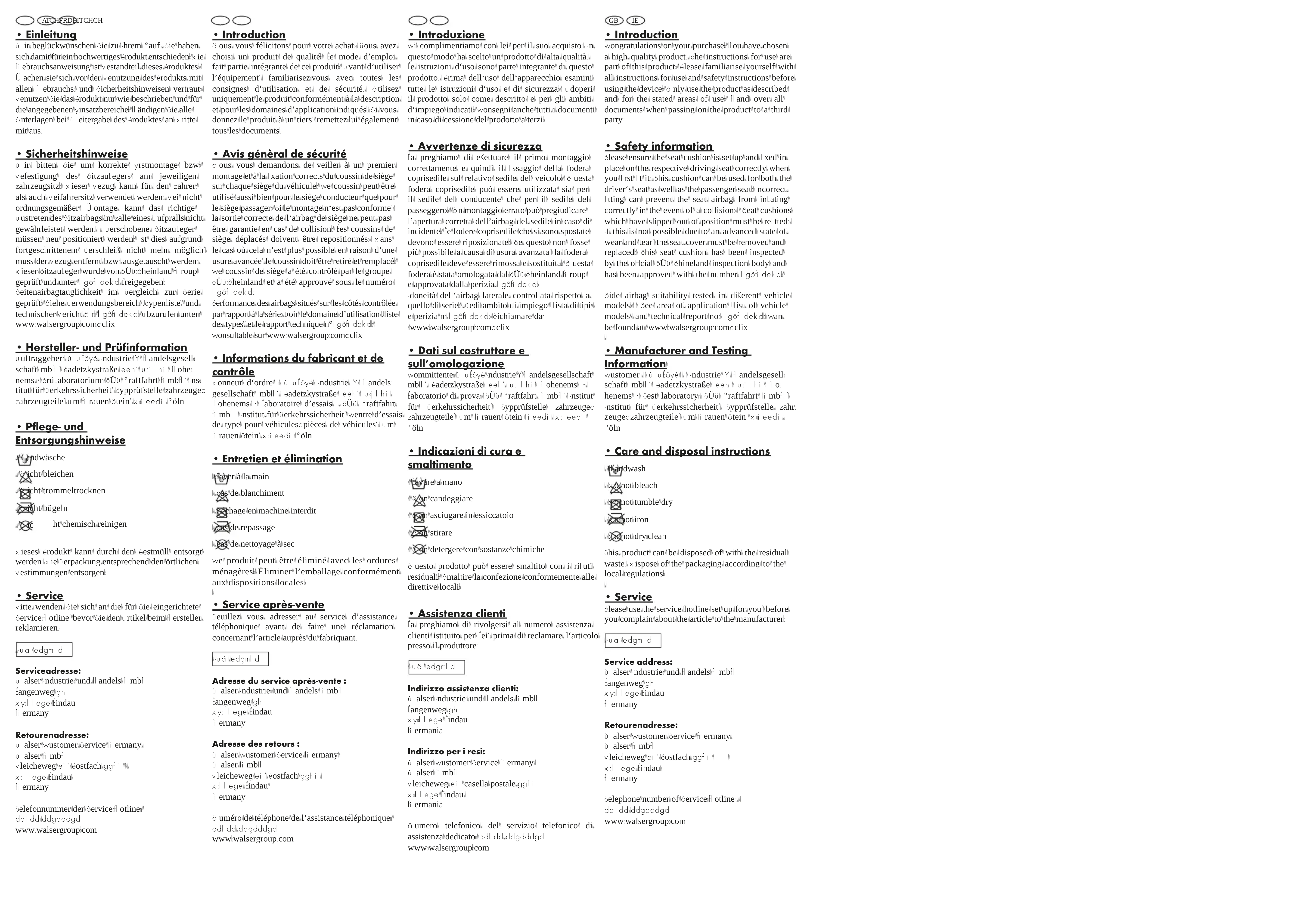 - Informations du fabricant et de contrôle Donneur d‘ordre : WALSER Industrie + Handels- gesellschaft mbH, Radetzkystraße 114, A-6845 Hohenems · Laboratoire d’essais : TÜV Kraftfahrt GmbH, Institut für Verkehrssicherheit, Centre d’essais de type pour véhicules/pièces de véhicules, Am Grauen Stein, D-51105 Köln