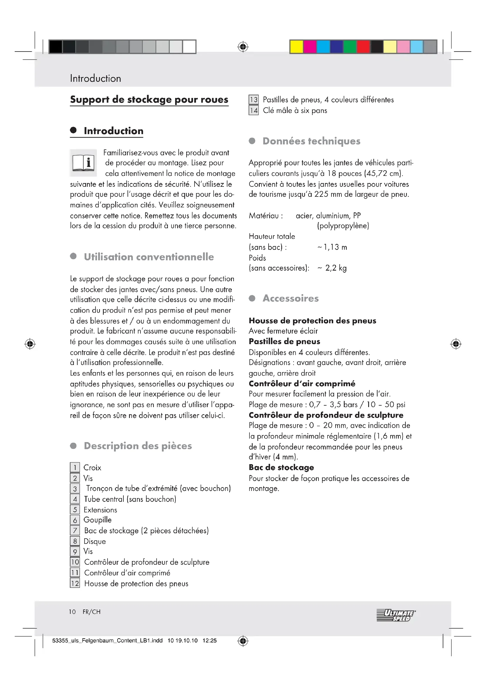 Accessoires Housse de protection des pneus Avec fermeture éclair Pastilles de pneus Disponibles en 4 couleurs différentes. Désignations : avant gauche, avant droit, arrière gauche, arrière droit Contrôleur d‘air comprimé Pour mesurer facilement la pression de l‘air. Plage de mesure : 0,7 – 3,5 bars / 10 – 50 psi Contrôleur de profondeur de sculpture Plage de mesure : 0 – 20 mm, avec indication de la profondeur minimale réglementaire (1,6 mm) et de la profondeur recommandée pour les pneus d’hiver (4 mm). Bac de stockage Pour stocker de façon pratique les accessoires de montage. 53355_uls_Felgenbaum_Content_LB1.indd 10 19.10.10 12:2511 FR/CH Consignes de sécurité / Montage / Consignes d‘utilisation des accessoires Consignes de sécurité