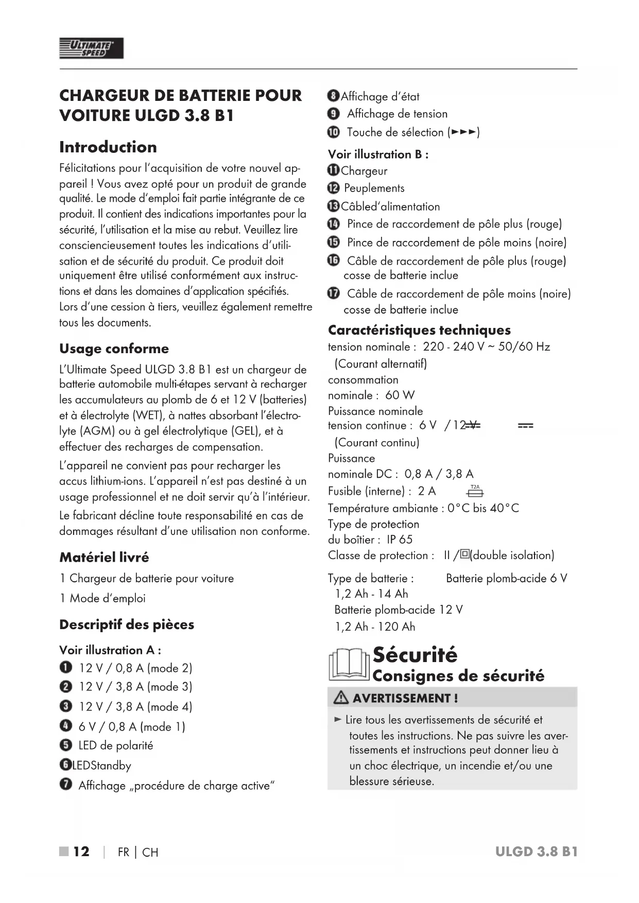 Introduction Félicitations pour l‘acquisition de votre nouvel ap- pareil ! Vous avez opté pour un produit de grande qualité. Le mode d‘emploi fait partie intégrante de ce produit. Il contient des indications importantes pour la sécurité, l’utilisation et la mise au rebut. Veuillez lire consciencieusement toutes les indications d‘utili- sation et de sécurité du produit. Ce produit doit uniquement être utilisé conformément aux instruc- tions et dans les domaines d‘application spécifiés. Lors d‘une cession à tiers, veuillez également remettre tous les documents. Usage conforme L’Ultimate Speed ULGD 3.8 B1 est un chargeur de batterie automobile multi-étapes servant à recharger les accumulateurs au plomb de 6 et 12 V (batteries) et à électrolyte (WET), à nattes absorbant l’électro- lyte (AGM) ou à gel électrolytique (GEL), et à effectuer des recharges de compensation. L’appareil ne convient pas pour recharger les accus lithium-ions. L’appareil n’est pas destiné à un usage professionnel et ne doit servir qu’à l’intérieur. Le fabricant décline toute responsabilité en cas de dommages résultant d’une utilisation non conforme. Matériel livré 1 Chargeur de batterie pour voiture 1 Mode d‘emploi Descriptif des pièces Voir illustration A : 12 V / 0,8 A (mode 2) 12 V / 3,8 A (mode 3) 12 V / 3,8 A (mode 4) 6 V / 0,8 A (mode 1) LED de polarité LED Standby Affichage „procédure de charge active“ Affichage d‘état Affichage de tension Touche de sélection (►►►) Voir illustration B : Chargeur Peuplements Câble d‘alimentation Pince de raccordement de pôle plus (rouge) Pince de raccordement de pôle moins (noire) Câble de raccordement de pôle plus (rouge) cosse de batterie inclue Câble de raccordement de pôle moins (noire) cosse de batterie inclue Caractéristiques techniques tension nominale : 220 - 240 V ∼ 50/60 Hz (Courant alternatif) consommation nominale : 60 W Puissance nominale tension continue: 6 V / 12 V (Courant continu) Puissance nominale DC : 0,8 A / 3,8 A Fusible (interne) : 2 A T2A Température ambiante : 0°C bis 40°C Type de protection du boîtier : IP 65 Classe de protection : II / (double isolation) Type de batterie : Batterie plomb-acide 6 V 1,2 Ah - 14 Ah Batterie plomb-acide 12 V 1,2 Ah - 120 Ah Sécurité Consignes de sécurité AVERTISSEMENT! ► Lire tous les avertissements de sécurité et toutes les instructions. Ne pas suivre les aver- tissements et instructions peut donner lieu à un choc électrique, un incendie et/ou une blessure sérieuse.ULGD 3.8 B1