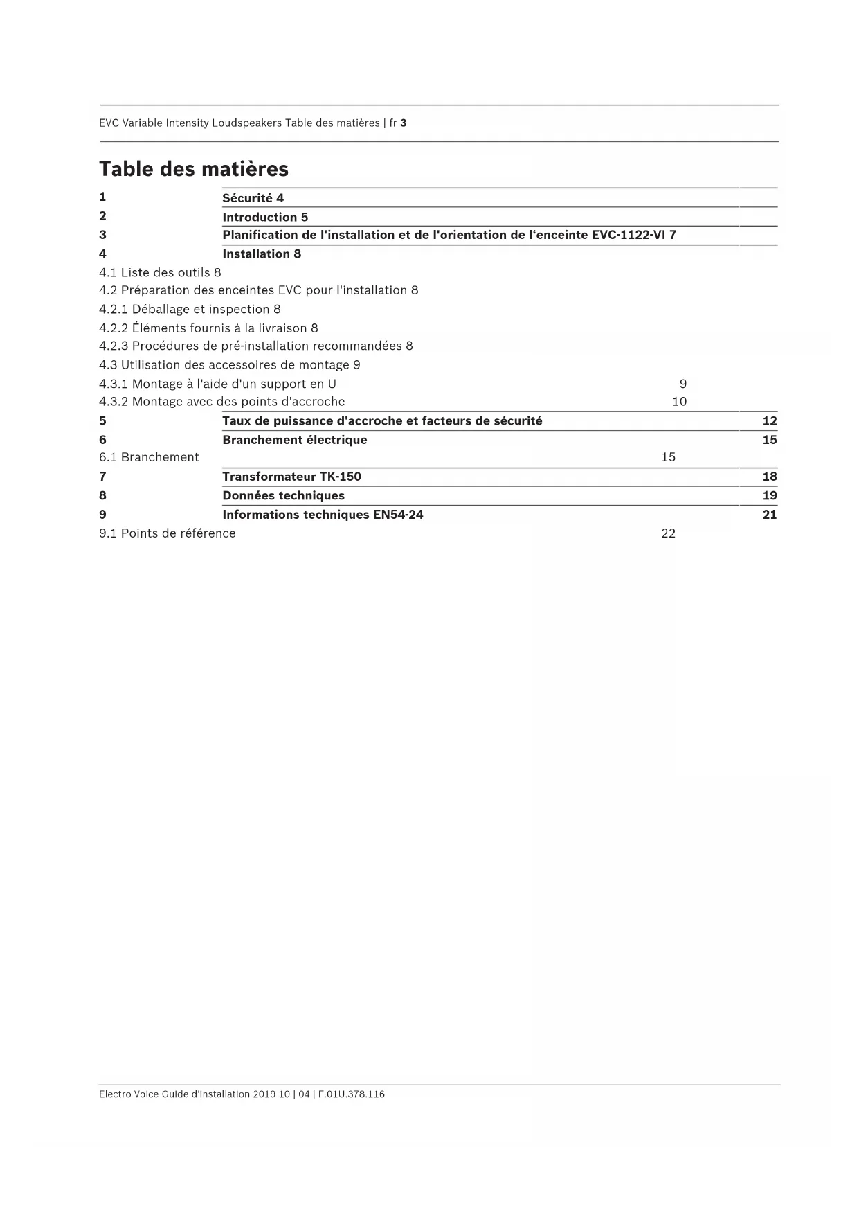 Attention! Lors d'un chaînage en bus de systèmes supplémentaires, connectez les câbles au système suivant et uniquement aux bornes opposées aux câbles d'entrée. Une connexion incorrecte peut endommager le transformateur, les haut-parleurs des enceintes, l'amplificateur ou toute combinaison de ces unités. Remarque! Serrez toutes les vis de connecteur inutilisées pour empêcher les cliquetis.EVC Variable-Intensity Loudspeakers Données techniques | fr 19 Electro-Voice Guide d'installation 2019-10 | 04 | F.01U.378.116 8 Données techniques Réponse en fréquence (-3dB) 1, 3 : 70Hz - 20kHz Plage de fréquences (-10dB) 1, 3 : 50Hz - 25kHz Fréquence passe-haut enregistrée: 50Hz Fréquence de recouvrement passive: 1,6kHz Sensibilité dans l'axe