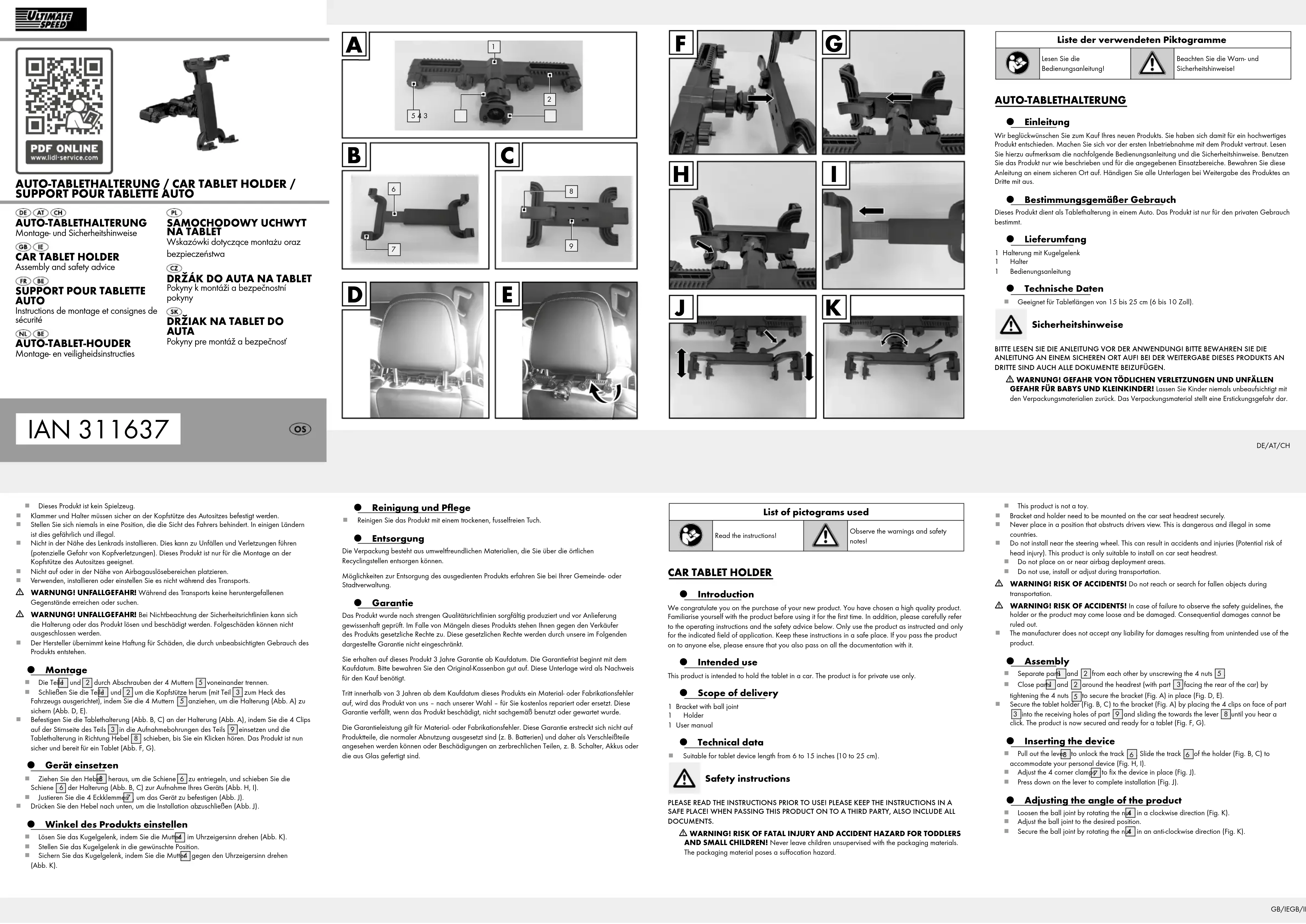 permettant ainsi de sécuriser (ill. A) le support (ill. D, E). Sécurisez ensuite le support de la tablette (ill. B, C) sur le dispositif de fixation (ill. A) en plaçant les 4 clips sur le côté frontal de la pièce