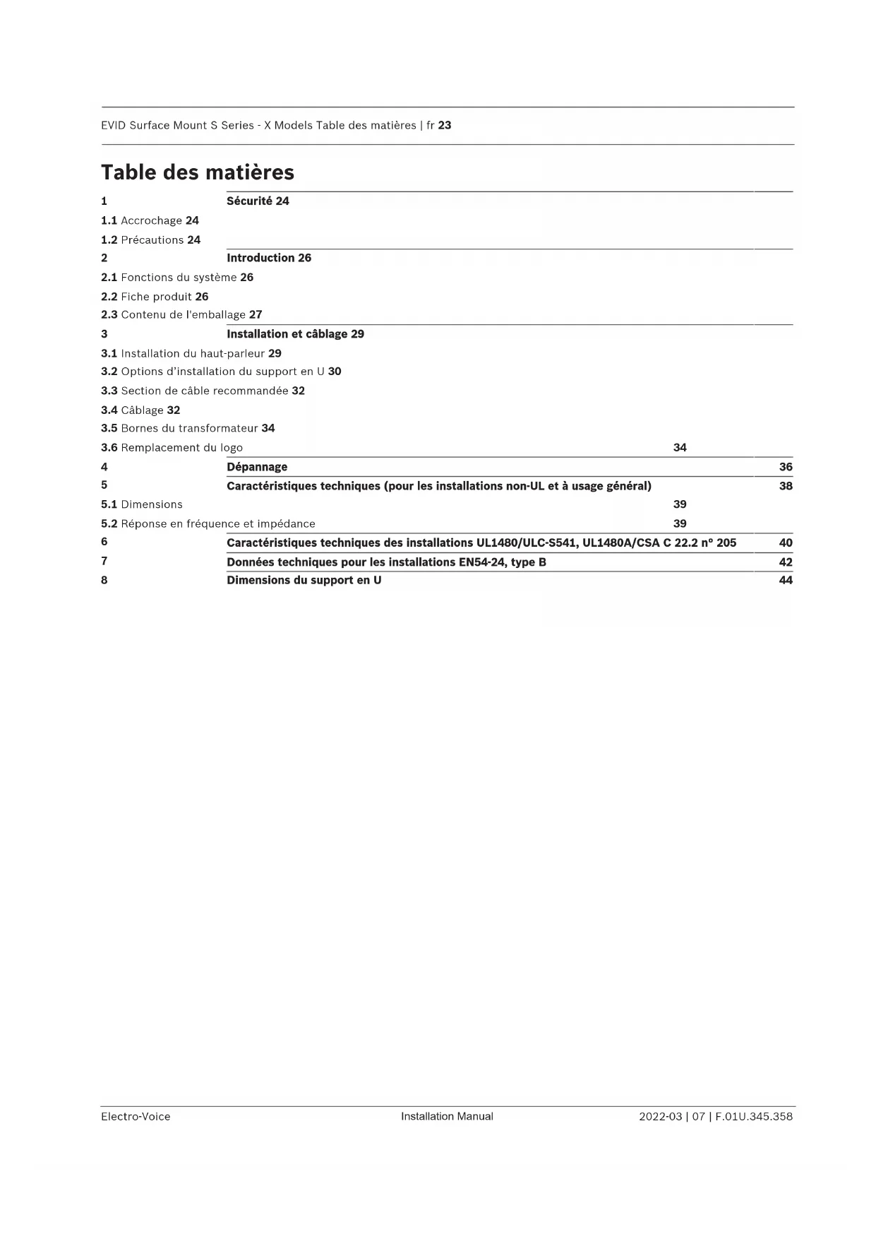 Tableau7.5: Rendement et angles de couverture mesurés dans des conditions « full-space » à 4 mètres Signal à 1 watt de bruit rose filtré 1/3 de bande d'octave. Données techniques EN54 Sensibilité conforme à la norme EN54-24 (SPL1W/4m): 74dB SPL max mesuré conformément à la norme EN54-24: 60watts couplés par transformateur @ 4mètres: 92dB 75watts couplés direct @ 4mètres: 92dBEVID Surface Mount S Series - X Models Données techniques pour les installations EN54-24, typeB | fr 43 Electro-Voice Installation Manual 2022-03 | 07 | F.01U.345.358 Impédance: Couplé direct: 8Ω 70Vcouplés par transformateur: 60W/68Ω, 30W/135Ω, 15W/250Ω, 8W/446Ω 100V couplés par transformateur: 60W/135Ω, 30W/250Ω, 16W/446Ω