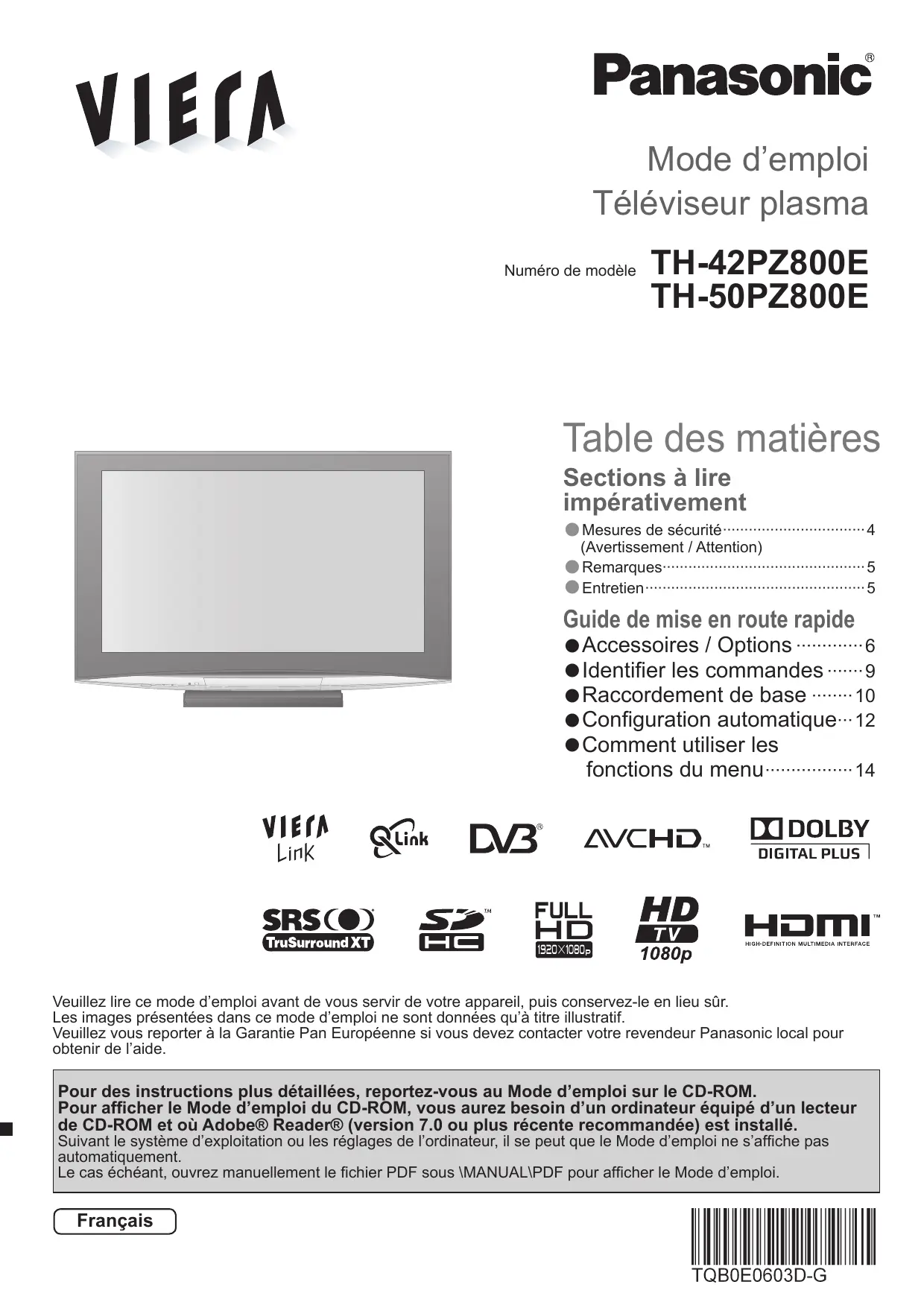 Mode d’emploi Téléviseur plasma Numéro de modèle TH-42PZ800E TH-50PZ800E Table des matières Sections à lire impérativement
