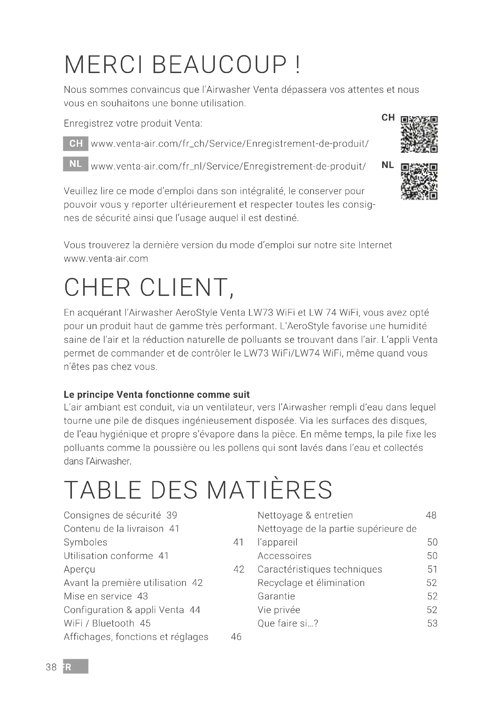 +49 751 5008 88, www.venta-air.com38 FR CHER CLIENT, En acquérant l’Airwasher AeroStyle Venta LW73 WiFi et LW 74 WiFi, vous avez opté pour un produit haut de gamme très performant. L’AeroStyle favorise une humidité saine de l’air et la réduction naturelle de polluants se trouvant dans l’air. L‘appli Venta permet de commander et de contrôler le LW73 WiFi/LW74 WiFi, même quand vous n‘êtes pas chez vous. Le principe Venta fonctionne comme suit L’air ambiant est conduit, via un ventilateur, vers l’Airwasher rempli d’eau dans lequel tourne une pile de disques ingénieusement disposée. Via les surfaces des disques, de l’eau hygiénique et propre s’évapore dans la pièce. En même temps, la pile fixe les polluants comme la poussière ou les pollens qui sont lavés dans l’eau et collectés dans l’Airwasher. MERCI BEAUCOUP ! Nous sommes convaincus que l‘Airwasher Venta dépassera vos attentes et nous vous en souhaitons une bonne utilisation. Enregistrez votre produit Venta: