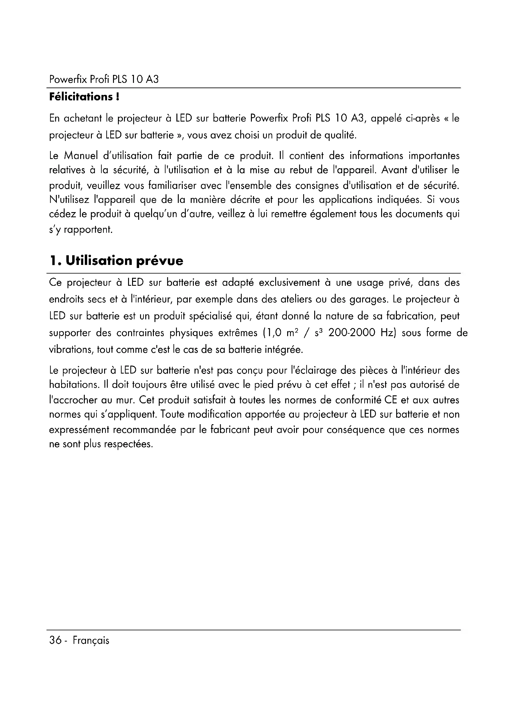 Avant d'utiliser ce projecteur à LED sur batterie (A) pour la première fois, veuillez lire les consignes et avertissements figurant dans ce mode d’emploi et les respecter, même si vous êtes habitué à manipuler des appareils électroniques. Conservez ce manuel d’utilisation en lieu sûr afin de pouvoir vous y reporter à tout moment. Si vous vendez ouPowerfix Profi PLS 10 A3