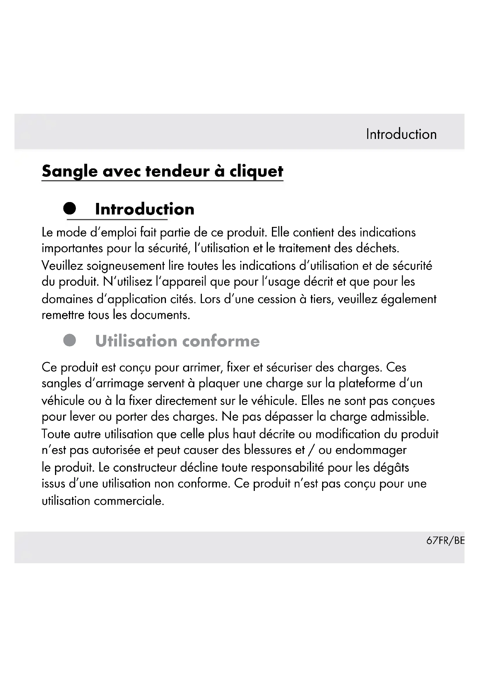 Renovation Emballagen består af miljøvenlige materialer der kan bortskaffes over genbrugsstationen. Muligheder for bortskaffelse af det udtjente produkt kan De erfare hos de lokale myndigheder.66 FR/BE Table des matières Introduction......................................................................Page 67 Utilisation conforme................................................................Page 67 Description des pièces ...........................................................Page 68 Caractéristiques ...................................................................... Page 68 Fourniture ................................................................................Page 68 Consignes de sécurité ..............................................Page 69 Consignes de sécurité générales ........................................... Page 69 Consignes de sécurité pour les sangles d’arrimage ............Page 70 Conseils pratiques pour l’utilisation et l’entretien de sangles d’arrimage ................Page 74 Utilisation ........................................................................... Page 77 Pose des sangles d’arrimage .................................................Page 77 Détendre la sangle d’arrimage .............................................Page 78 Nettoyage et entretien ...........................................Page 79 Mise au rebut .................................................................. Page 8067FR/BE Introduction Sangle avec tendeur à cliquet Introduction Le mode d‘emploi fait partie de ce produit. Elle contient des indications importantes pour la sécurité, l‘utilisation et le traitement des déchets. Veuillez soigneusement lire toutes les indications d‘utilisation et de sécurité du produit. N‘utilisez l‘appareil que pour l‘usage décrit et que pour les domaines d‘application cités. Lors d‘une cession à tiers, veuillez également remettre tous les documents. Utilisation conforme Ce produit est conçu pour arrimer, fixer et sécuriser des charges. Ces sangles d‘arrimage servent à plaquer une charge sur la plateforme d‘un véhicule ou à la fixer directement sur le véhicule. Elles ne sont pas conçues pour lever ou porter des charges. Ne pas dépasser la charge admissible. Toute autre utilisation que celle plus haut décrite ou modification du produit n‘est pas autorisée et peut causer des blessures et / ou endommager le produit. Le constructeur décline toute responsabilité pour les dégâts issus d’une utilisation non conforme. Ce produit n’est pas conçu pour une utilisation commerciale.68 FR/BE Introduction Description des pièces
