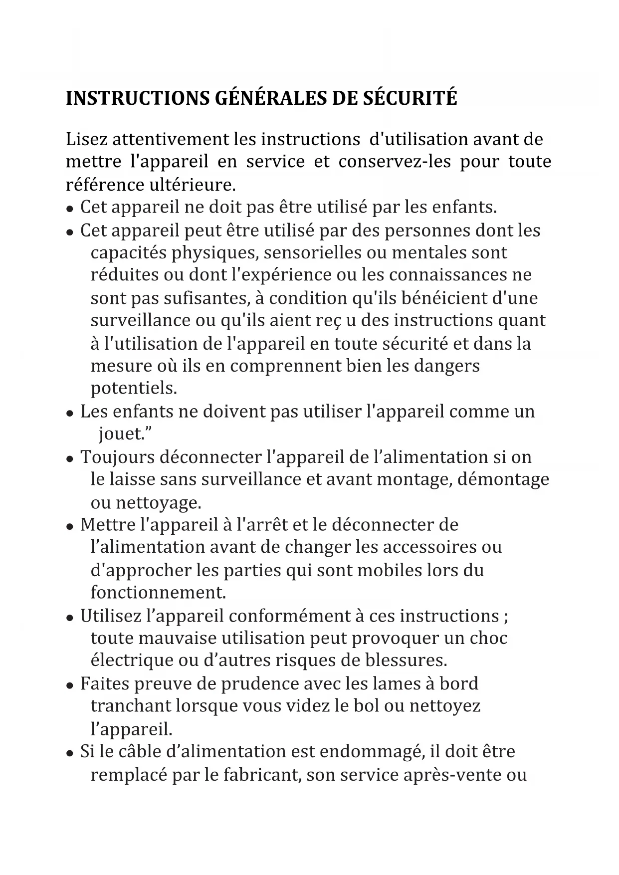 CERP1200GB Robot pâtissier - Stand Mixer Manuel d’instructions - Instruction ManualINSTRUCTIONS GÉNÉRALES DE SÉCURITÉ Lisez attentivement les instructions d'utilisation avant de mettre l'appareil en service et conservez-les pour toute référence ultérieure. Cet appareil ne doit pas être utilisé par les enfants. Cet appareil peut être utilisé par des personnes dont les capacités physiques, sensorielles ou mentales sont réduites ou dont l'expérience ou les connaissances ne sont pas suffisantes, à condition qu'ils bénéficient d'une surveillance ou qu'ils aient reçu des instructions quant à l'utilisation de l'appareil en toute sécurité et dans la mesure où ils en comprennent bien les dangers potentiels. Les enfants ne doivent pas utiliser l'appareil comme un jouet.” Toujours déconnecter l'appareil de l’alimentation si on le laisse sans surveillance et avant montage, démontage ou nettoyage. Mettre l'appareil à l'arrêt et le déconnecter de l’alimentation avant de changer les accessoires ou d'approcher les parties qui sont mobiles lors du fonctionnement. Utilisez l’appareil conformément à ces instructions ; toute mauvaise utilisation peut provoquer un choc électrique ou d’autres risques de blessures. Faites preuve de prudence avec les lames à bord tranchant lorsque vous videz le bol ou nettoyez l’appareil. Si le câble d’alimentation est endommagé, il doit être remplacé par le fabricant, son service après-vente outoute personne de qualification similaire afin d’éviter un danger. Cet appareil est conçu pour un usage domestique uniquement. Cet appareil n’est pas conçu pour être utilisé en plein air. N’immergez jamais le robot dans un liquide et n’utilisez pas d’objets aux bords tranchants sur le robot. N’utilisez pas l’appareil avec les mains mouillées. Si l'appareil est humide ou mouillé, débranchez-le immédiatement. Gardez vos doigts éloignés des pièces en mouvement et des accessoires. Ne mettez jamais vos doigts, etc. dans la charnière. Utilisez uniquement des pièces de rechange d'origine. Pour garantir la sécurité de vos enfants, veuillez conserver toutes les pièces d'emballage (sacs plastiques, boîtes, polystyrène, etc.) hors de leur portée. N'insérez rien dans les crochets rotatifs lorsque la machine fonctionne. Placez l’appareil sur une surface de travail lisse, plane et stable. Assurez-vous que le robot est complètement arrêté avant de lever son bras. Soyez prudent si du liquide chaud est versé dans la machine car il peut être éjecté de l'appareil en raison d'une vapeur soudaine. En ce qui concerne les instructions pour le nettoyage des surfaces en contact avec les aliments, veuillez vous reporter à la section « NETTOYAGE ». Les instructions concernant les durées de fonctionnement et les réglages de vitesse sontdisponibles pour chaque accessoire dont l’utilisation est décrite dans les pages suivantes. Afin d’éviter que le moteur ne fonctionne sur un laps de temps trop long, celui-ci fonctionnera 8 minutes une fois que la vitesse souhaitée est sélectionnée. Le moteur s’arrêtera de lui-même après ces 8 minutes. Pour permettre un nouveau cycle de fonctionnement, il faut que le sélecteur repasse par la position OFF.DESCRIPTION PRODUIT