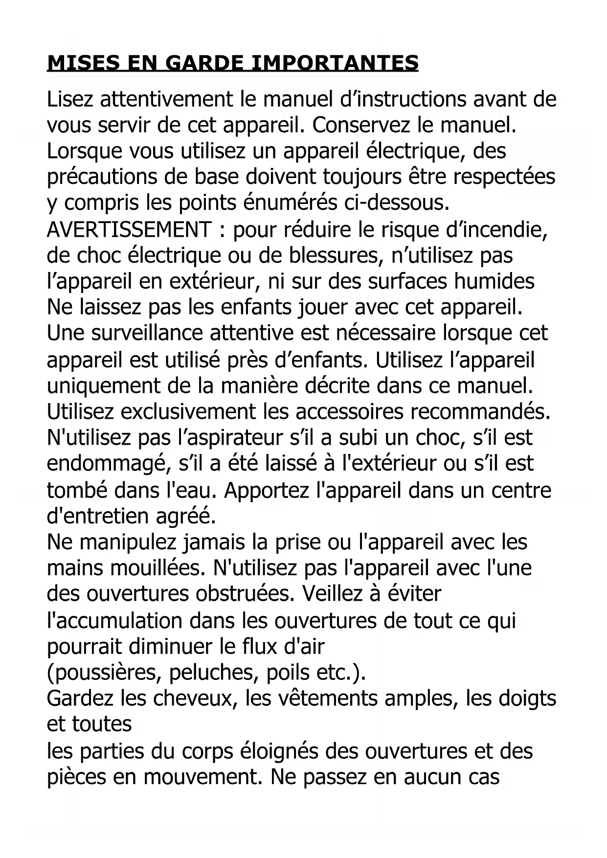 principal après l'utilisation. CONSEILS Cet appareil a été conçu exclusivement pour nettoyer les sols, les tapis et les moquettes, les meubles et les tissus. N’utilisez pas l'appareil pour un autre usage. Sa brosse électrique peut nettoyer les peluches, les cheveux et les poils d'animaux emmêlés dans les tapis et les moquettes.N'aspirez jamais de cendres incandescentes, des éclats de bois ou d'autres objets coupants ou des liquides. N'utilisez pas cet appareil pour aspirer des poussières de chantier, du ciment, etc. N'aspirez jamais d'allumettes en feu ou de mégots de cigarettes en combustion. N’aspirez pas de matériaux toxiques (comme l'ammoniaque). Avant d'ajouter ou de retirer tout accessoire ou d'effectuer toute tâche d'entretien, débranchez l'appareil de la prise secteur. Vérifiez que la brosse ne comporte pas de fils enchevêtrés, de cheveux ou de poils d'animaux. Sinon, coupez-les soigneusement et retirez-les de sorte que cela ne coince pas le fonctionnement de l'appareil. N'utilisez pas la brosse sur des tapis à longs poils, sur la fourrure des animaux ou sur des matériaux marginaux.