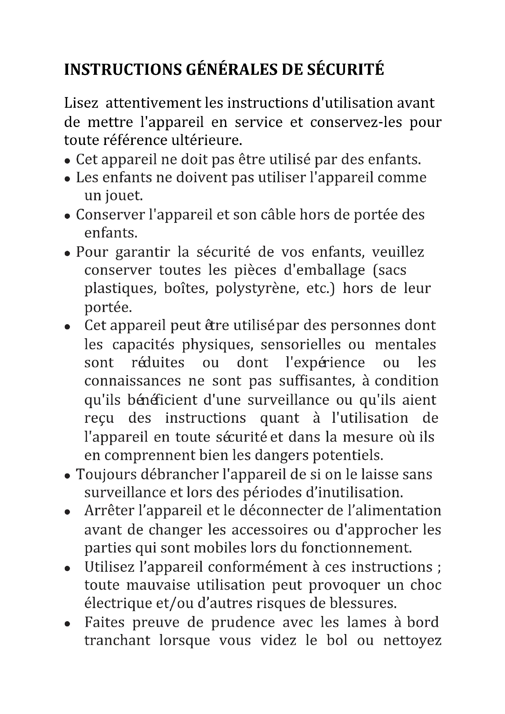 Robot pâtissier - Stand Mixer Manuel d’instructions - Instruction ManualINSTRUCTIONS GÉNÉRALES DE SÉCURITÉ Lisez attentivement les instructions d'utilisation avant de mettre l'appareil en service et conservez-les pour toute référence ultérieure. Cet appareil ne doit pas être utilisé par des enfants. Les enfants ne doivent pas utiliser l'appareil comme un jouet. Conserver l'appareil et son câble hors de portée des enfants. Pour garantir la sécurité de vos enfants, veuillez conserver toutes les pièces d'emballage (sacs plastiques, boîtes, polystyrène, etc.) hors de leur portée. Cet appareil peut être utilisé par des personnes dont les capacités physiques, sensorielles ou mentales sont réduites ou dont l'expérience ou les connaissances ne sont pas suffisantes, à condition qu'ils bénéficient d'une surveillance ou qu'ils aient reçu des instructions quant à l'utilisation de l'appareil en toute sécurité et dans la mesure où ils en comprennent bien les dangers potentiels. Toujours débrancher l'appareil de si on le laisse sans surveillance et lors des périodes d’inutilisation. Arrêter l’appareil et le déconnecter de l’alimentation avant de changer les accessoires ou d'approcher les parties qui sont mobiles lors du fonctionnement. Utilisez l’appareil conformément à ces instructions ; toute mauvaise utilisation peut provoquer un choc électrique et/ou d’autres risques de blessures. Faites preuve de prudence avec les lames à bord tranchant lorsque vous videz le bol ou nettoyezl’appareil. Si le câble d’alimentation est endommagé, il doit être remplacé par le fabricant, son service après-vente ou toute personne de qualification similaire afin d’éviter un danger. Ne pas mettre en marche le robot si le câble d’alimentation est endommagé. Cet appareil est conçu pour un usage domestique uniquement. Cet appareil n’est pas conçu pour être utilisé en plein air. N’immergez jamais le robot dans un liquide. Ne touchez ni n’utilisez pas l’appareil avec les mains mouillées. Si l'appareil est humide ou mouillé, débranchez-le immédiatement. Gardez vos doigts éloignés des pièces et accessoires en mouvement. Ne mettez pas vos doigts dans la charnière. Utilisez uniquement des pièces de rechanges d'origine. Ne rien insérer dans les accessoires lorsque le robot est en fonctionnement. Placez l’appareil sur une surface de travail lisse, plane et stable. Assurez-vous que le robot est complètement arrêté avant de lever son bras. Soyez prudent si du liquide chaud est versé dans la machine car il peut être éjecté de l'appareil en raison d'une vapeur soudaine. En ce qui concerne les instructions pour le nettoyage des surfaces en contact avec les aliments, veuillez-vous reporter à la section « NETTOYAGE ». Les instructions concernant les durées de fonctionnement et les réglages de vitesse, et ce pour chaque accessoires, sont décrites dans les pages suivantes.