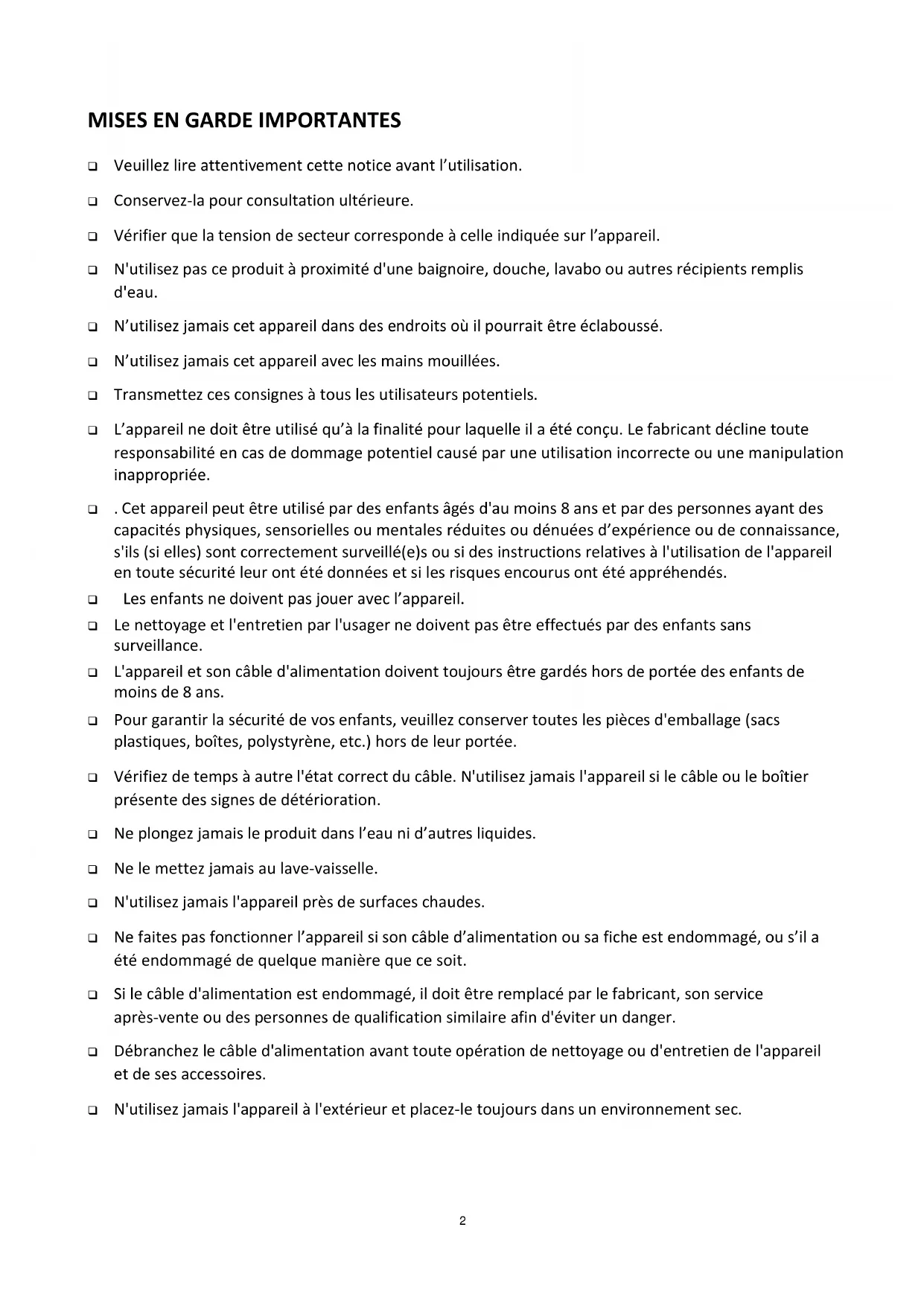 - Guide de dépannage MISES EN GARDE IMPORTANTES Veuillez lire attentivement cette notice avant l’utilisation. Conservez-la pour consultation ultérieure. Vérifier que la tension de secteur corresponde à celle indiquée sur l’appareil. N'utilisez pas ce produit à proximité d'une baignoire, douche, lavabo ou autres récipients remplis d'eau. N’utilisez jamais cet appareil dans des endroits où il pourrait être éclaboussé. N’utilisez jamais cet appareil avec les mains mouillées. Transmettez ces consignes à tous les utilisateurs potentiels. L’appareil ne doit être utilisé qu’à la finalité pour laquelle il a été conçu. Le fabricant décline toute responsabilité en cas de dommage potentiel causé par une utilisation incorrecte ou une manipulation inappropriée Cet appareil peut être utilisé par des enfants âgés d'au moins 8 ans et par des personnes ayant des capacités physiques, sensorielles ou mentales réduites ou dénuées d’expérience ou de connaissance, s'ils (si elles) sont correctement surveillé(e)s ou si des instructions relatives à l'utilisation de l'appareil en toute sécurité leur ont été données et si les risques encourus ont été appréhendés. Les enfants ne doivent pas jouer avec l’appareil. Le nettoyage et l'entretien par l'usager ne doivent pas être effectués par des enfants sans surveillance. L'appareil et son câble d'alimentation doivent toujours être gardés hors de portée des enfants de moins de 8 ans. Pour garantir la sécurité de vos enfants, veuillez conserver toutes les pièces d'emballage (sacs plastiques, boîtes, polystyrène, etc.) hors de leur portée. Vérifiez de temps à autre l'état correct du câble. N'utilisez jamais l'appareil si le câble ou le boîtier présente des signes de détérioration. Ne plongez jamais le produit dans l’eau ni d’autres liquides. Ne le mettez jamais au lave-vaisselle. N'utilisez jamais l'appareil près de surfaces chaudes. Ne faites pas fonctionner l’appareil si son câble d’alimentation ou sa fiche est endommagé, ou s’il a été endommagé de quelque manière que ce soit. Si le câble d'alimentation est endommagé, il doit être remplacé par le fabricant, son service après-vente ou des personnes de qualification similaire afin d'éviter un danger. Débranchez le câble d'alimentation avant toute opération de nettoyage ou d'entretien de l'appareil et de ses accessoires. N'utilisez jamais l'appareil à l'extérieur et placez-le toujours dans un environnement sec. 2 N’utilisez jamais d’accessoires non recommandés par le fabricant. Ils peuvent présenter un danger pour l'utilisateur et un risque de dommage pour l'appareil. Ne déplacez jamais l’appareil en le tirant par son câble. Veillez à ce que le câble ne puisse pas se coincer de quelque manière que ce soit. N’enroulez jamais le câble autour de l’appareil et ne le pliez pas. Assurez-vous que le câble d'alimentation n'entre pas en contact avec les parties chaudes de l'appareil. Veillez à ce que l'appareil refroidisse avant de le nettoyer et de le ranger. Les surfaces accessibles peuvent être portées à haute température lorsque l’appareil fonctionne. Ne touchez jamais ces surfaces afin d'éviter toute brûlure. Assurez-vous que l'appareil n'entre jamais en contact avec des matériaux inflammables tels que rideaux, chiffons, etc. et que le câble et la fiche n'entrent pas en contact avec de l'eau. Posez toujours l'appareil sur une surface plane. Veillez également à ne pas le couvrir et à ne rien poser dessus. Débranchez toujours la fiche de la prise électrique quand vous n’utilisez pas l’appareil. Si vous utilisez une rallonge, veillez à ce que le câble soit entièrement déroulé. Utilisez uniquement des rallonges portant le marquage CE. La puissance d’entrée doit être d'au moins 16 A, 250 V, 3000 W. Une utilisation incorrecte et inappropriée peut endommager l'appareil et provoquer des blessures sur l'utilisateur. L'appareil doit être utilisé et posé sur une table ou une surface plane et stable. Le produit ne doit pas être laissé sans surveillance lorsqu'il est branché à une prise électrique. L'appareil ne doit pas être utilisé s'il est tombé par terre, s'il présente des signes visibles de détérioration. Pour le nettoyage de l'appareil, veuillez vous référer au paragraphe « Nettoyage et entretien » de la notice. Patientez 20 secondes après chaque utilisation pour laisser l'appareil refroidir. Conseils importants p. 15